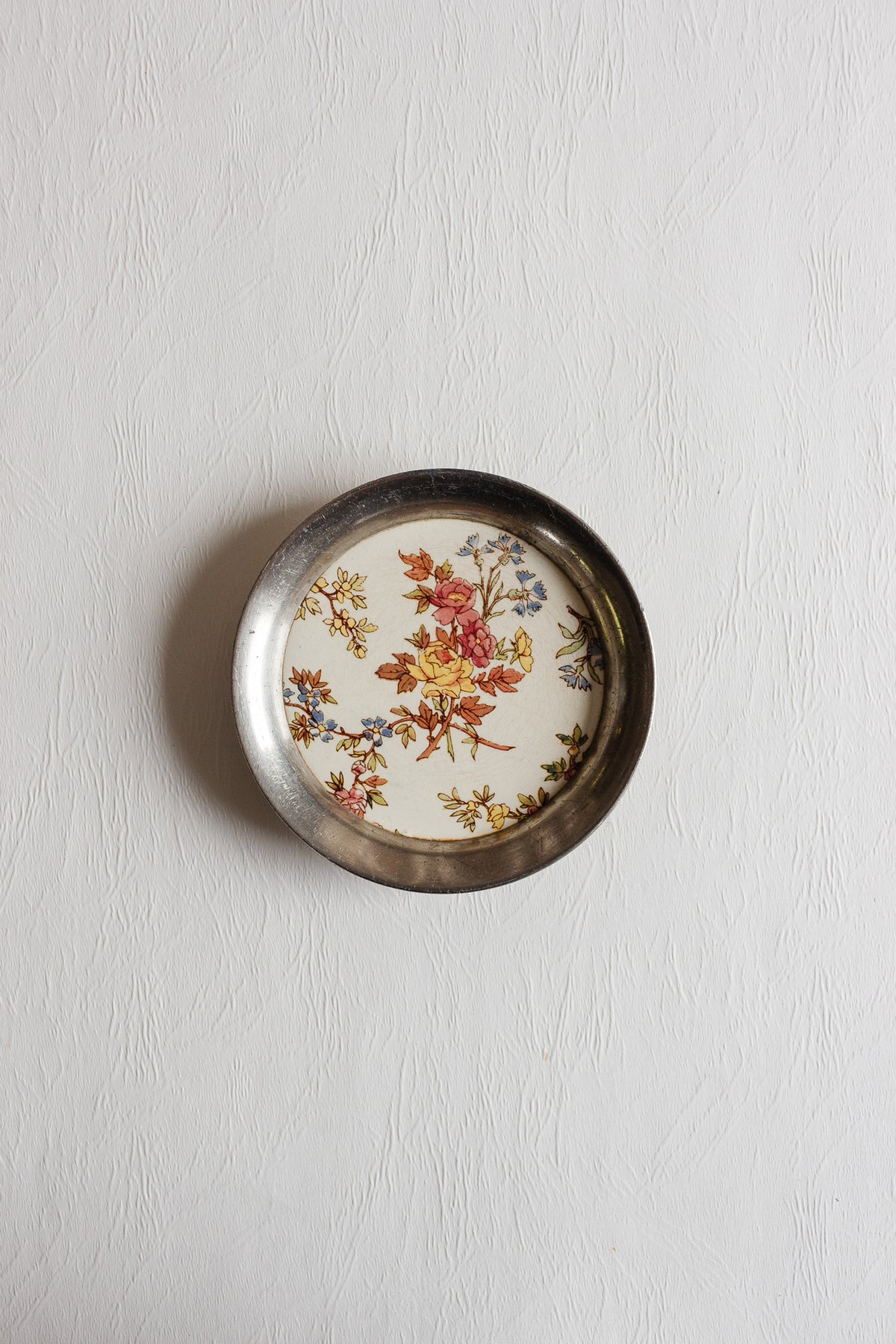 A fantastic and rare find; these coasters, beautifully crafted from transferware with hand painted details,  also have a silver metal surround.