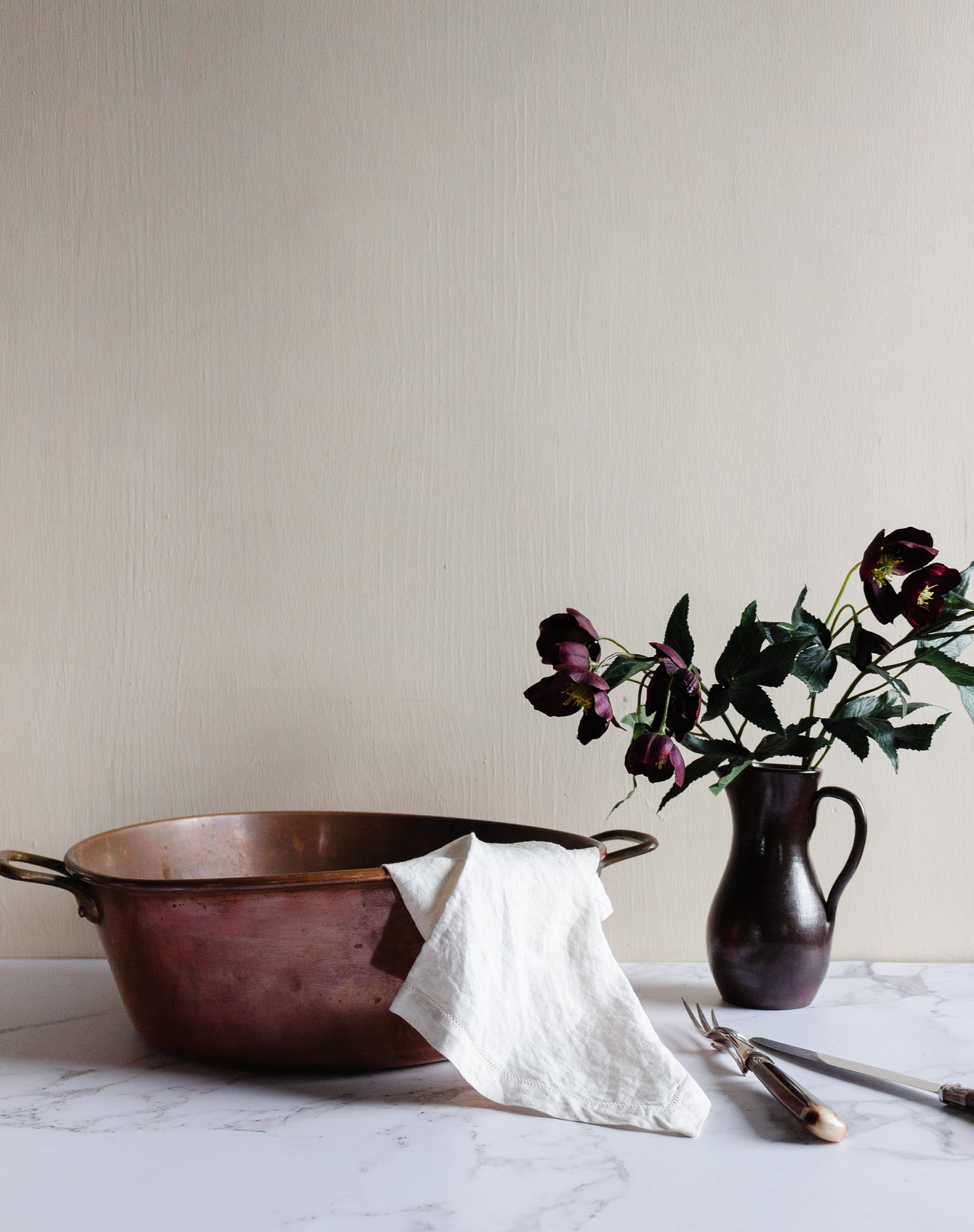Gorgeous, hand forged French copper pot with handles.  We think these look fabulous piled high with kitchen linens, or hung from a pot rack in all its beauty that only comes with age and use.