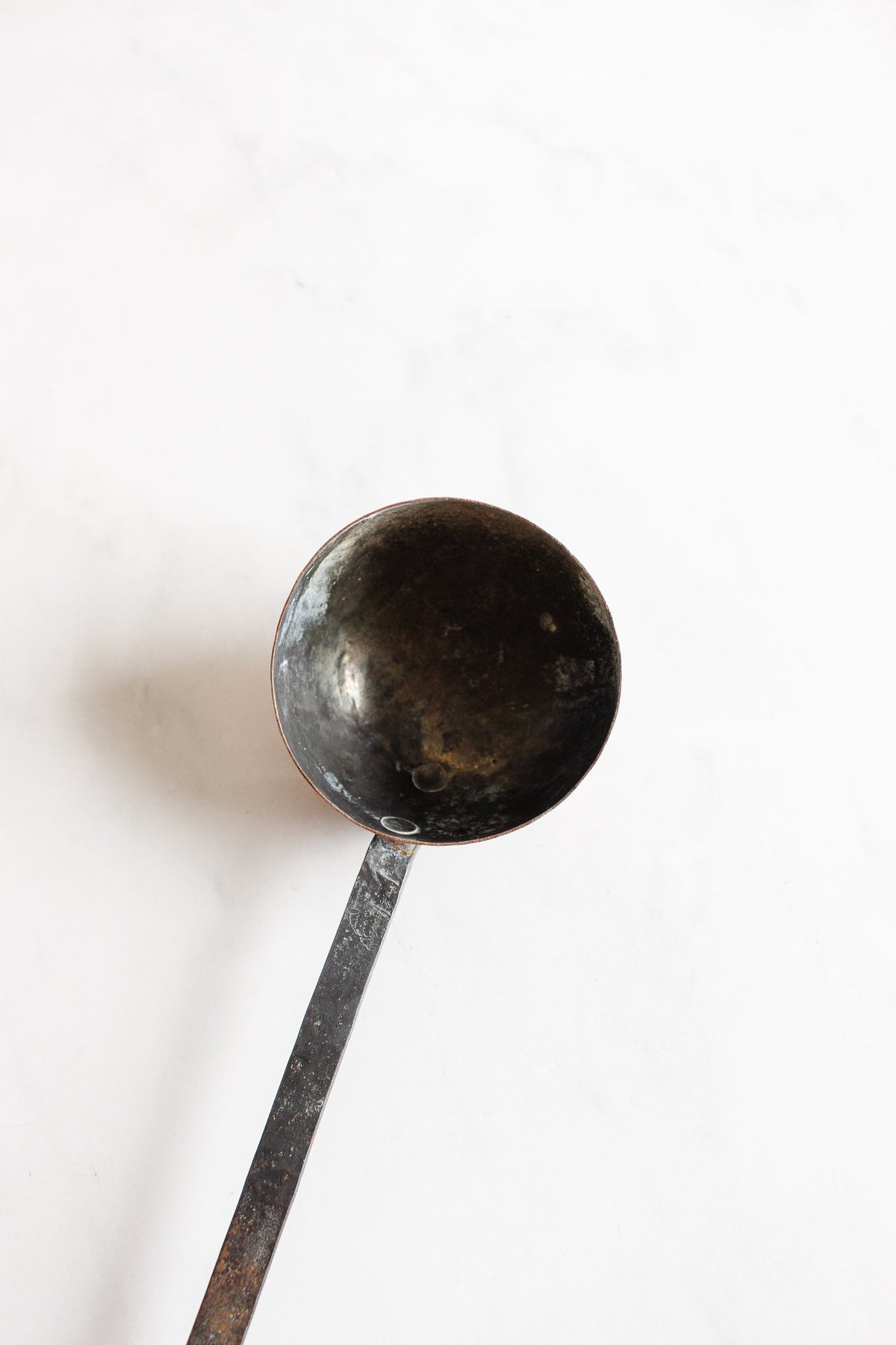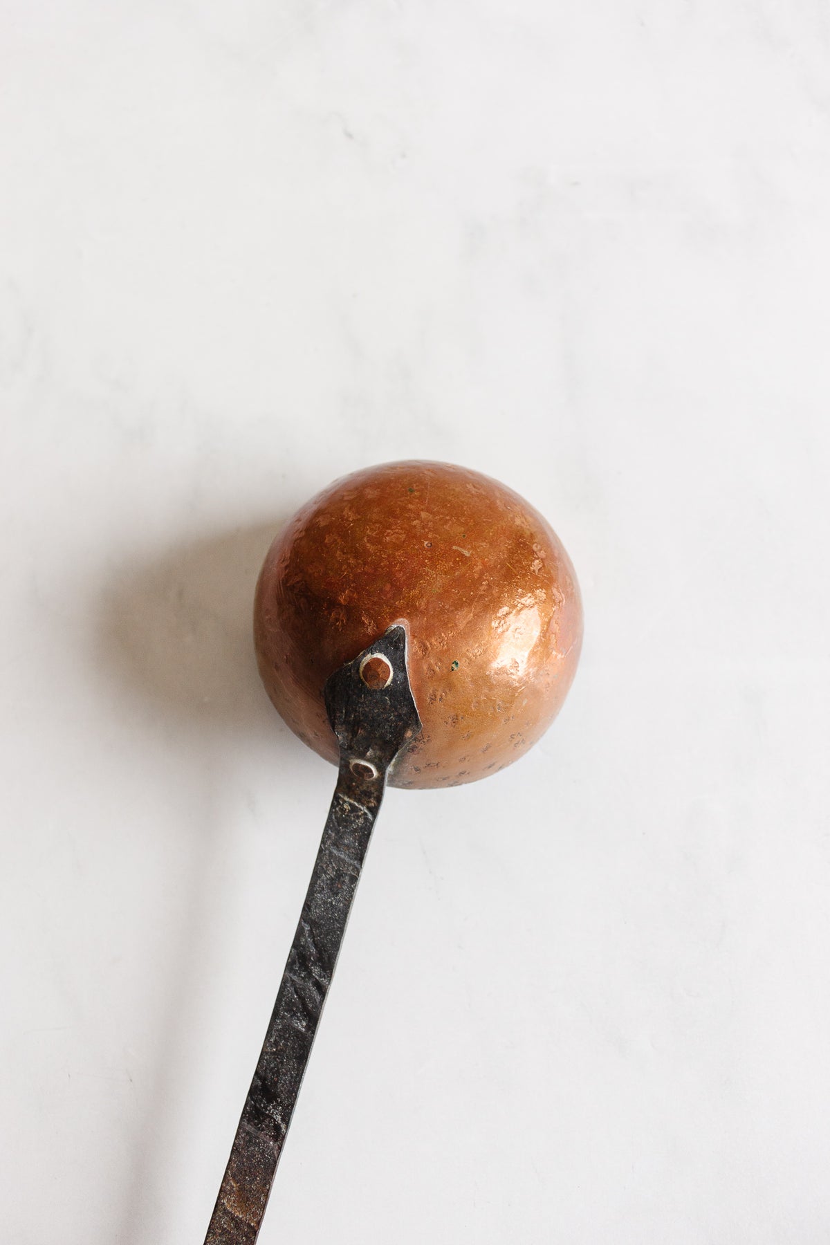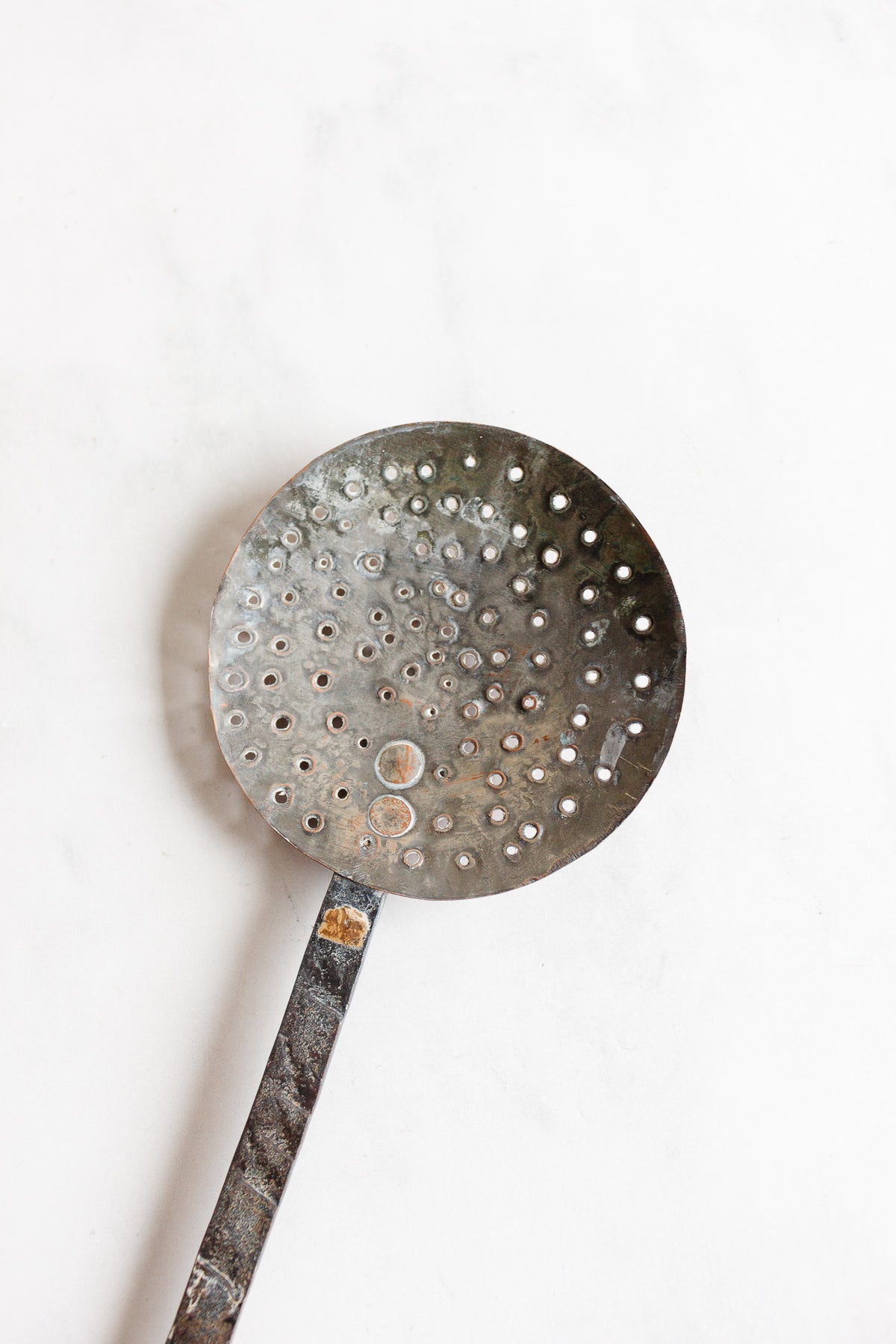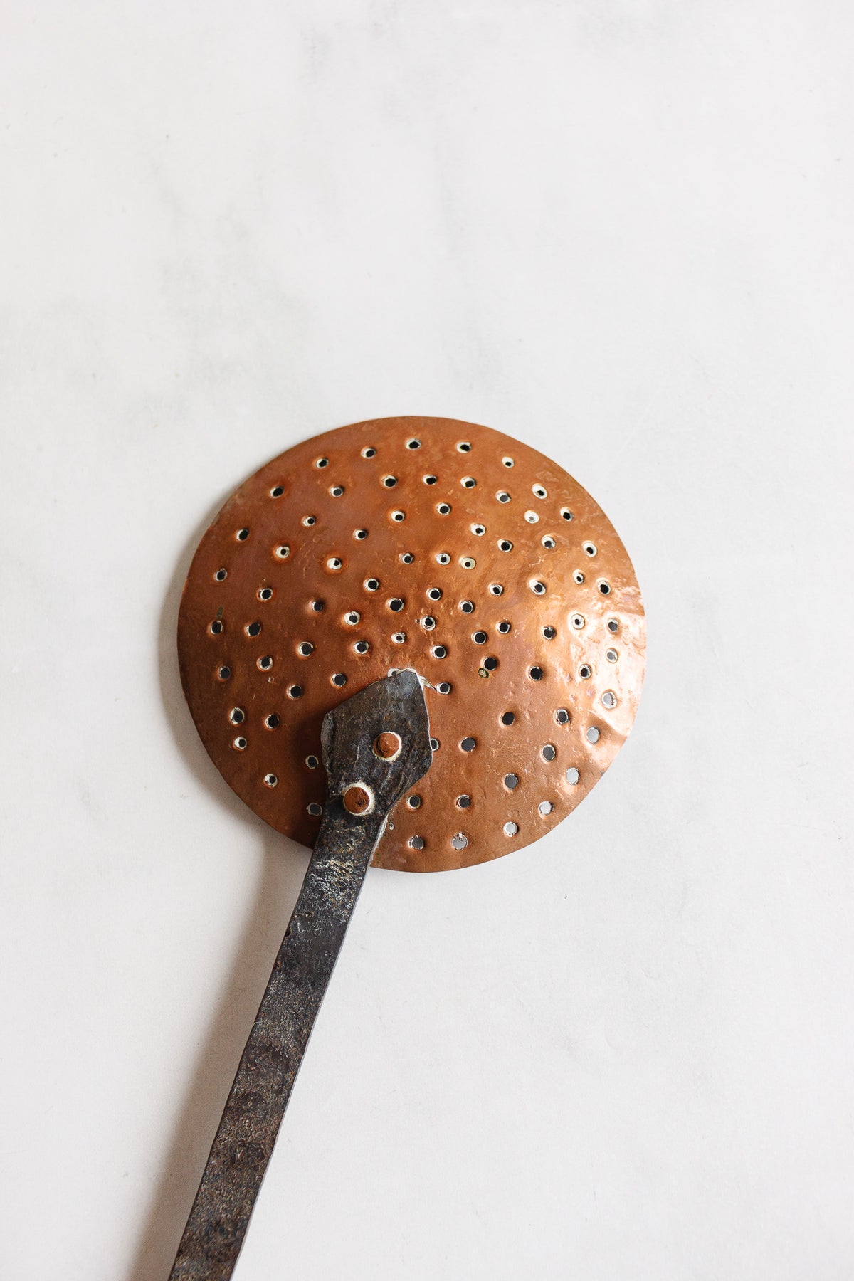 This ladle, spoon, and strainer, made of hand forged copper and iron, were used for years in a French kitchen just outside of Aix-en-Provence, and now you can make them yours. They truly are beautiful heirloom pieces to add to your collection. We love to display these on the wall or use as intended!