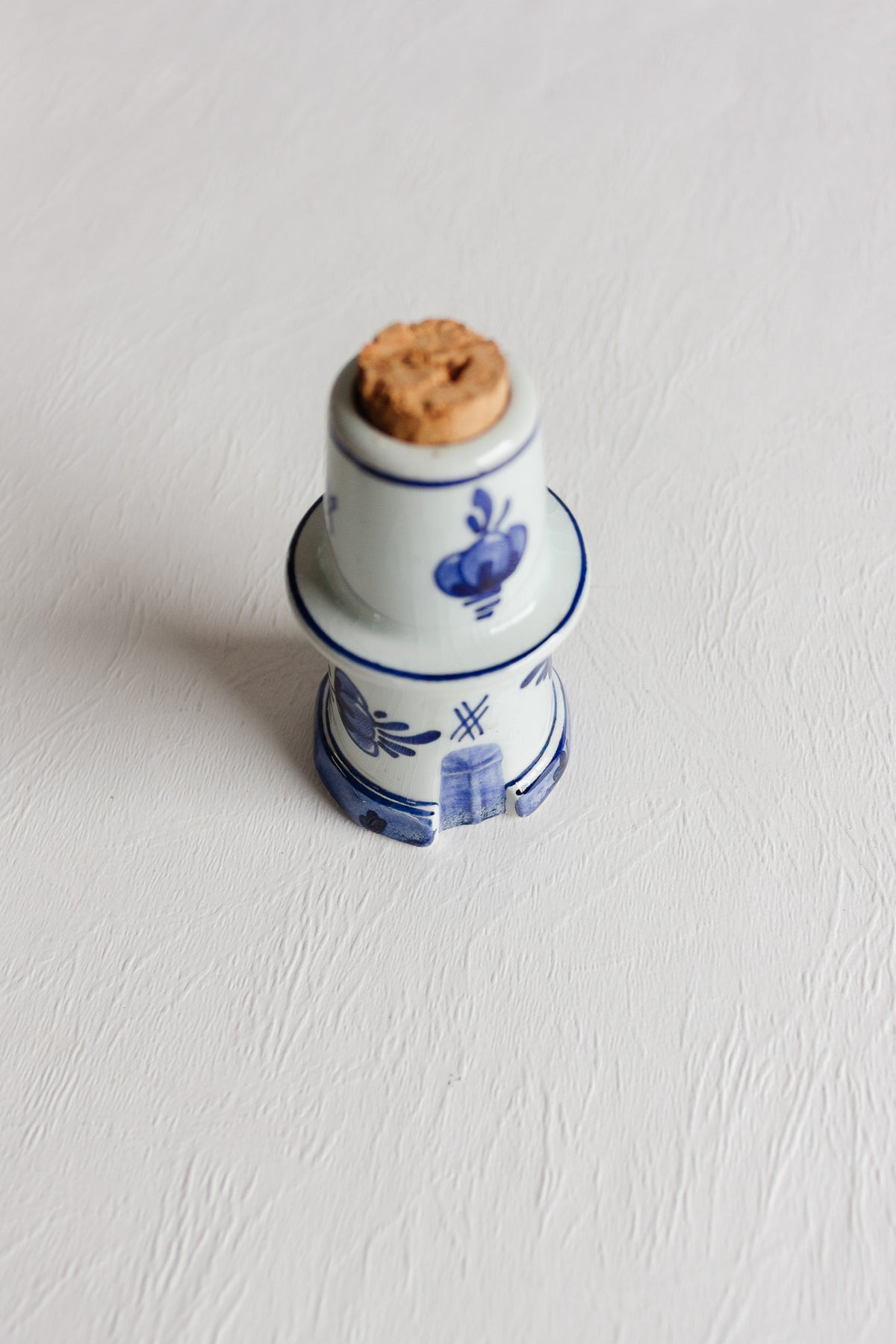 This adorable vintage delft shaker is shaped liie a lighthouse in the traditional and timeless blue and white. It was likely once used for salt. Today,  use as intended or style as is on a shelf or desk. Sourced from a brocante in Marseille.
