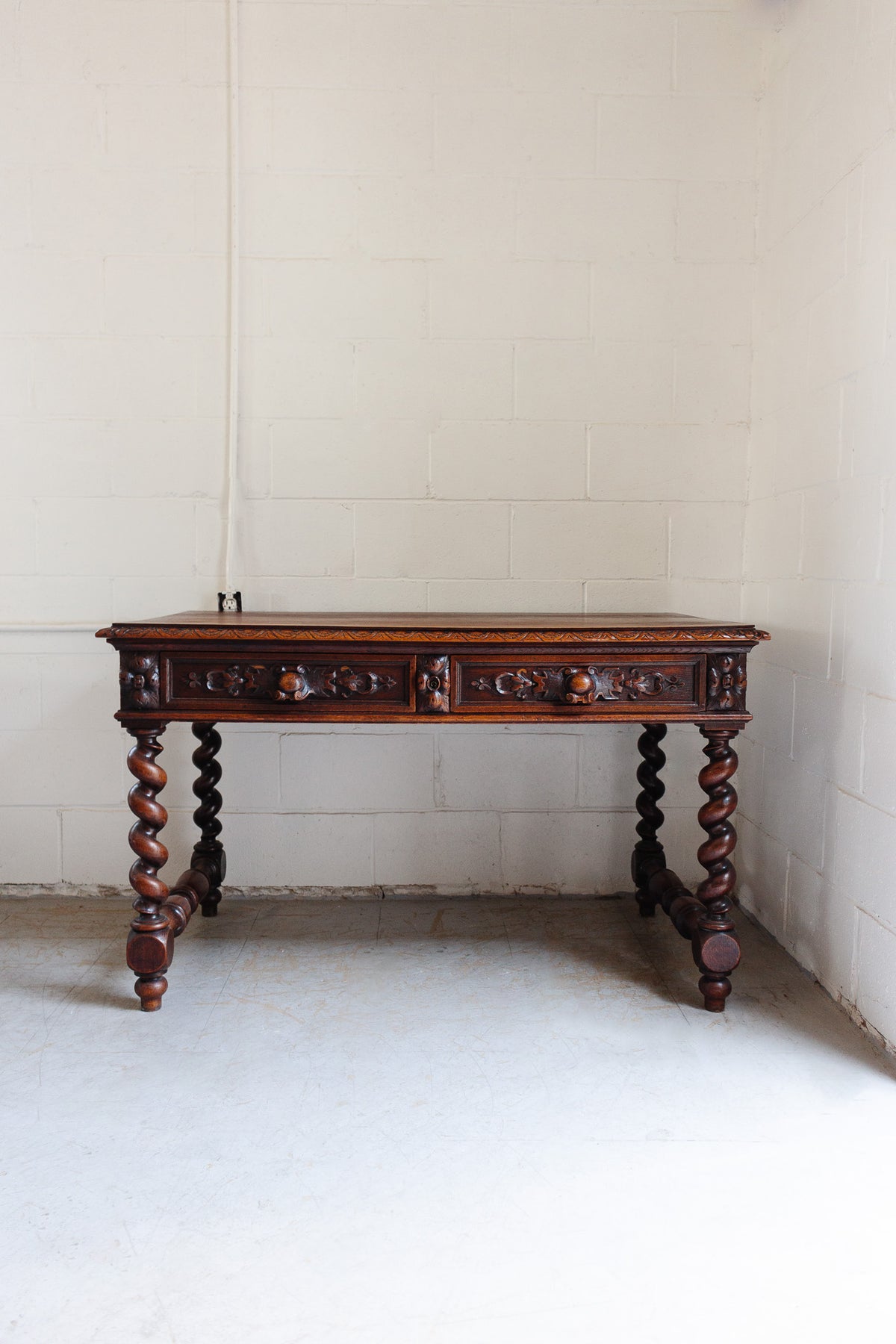 Featuring two dovetailed drawers, and four beautifully hand turned barley twist legs with side stretchers.