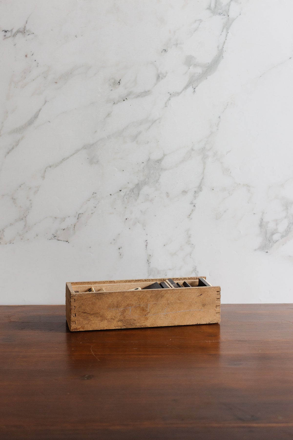 Set of antique French dominoes made from carved wood and bone, housed in their original fitted wooden box. Each tile features inset black pips and a naturally aged surface developed through use over time. Both functional and decorative, the set can be used for play or styled as an object on a coffee table, desk, or open shelf, with the box displayed open or slightly ajar to reveal the patterned tiles. Sourced from a brocante in Marseille.