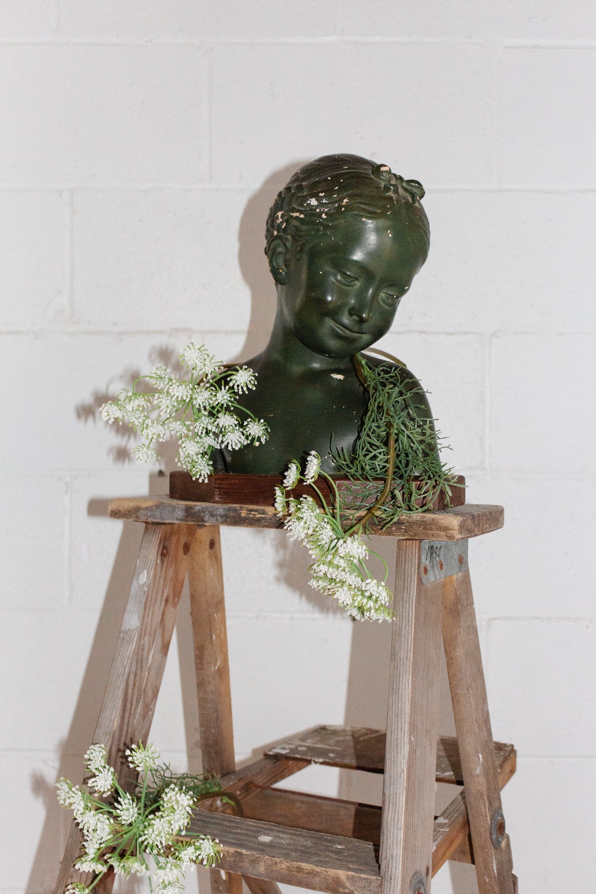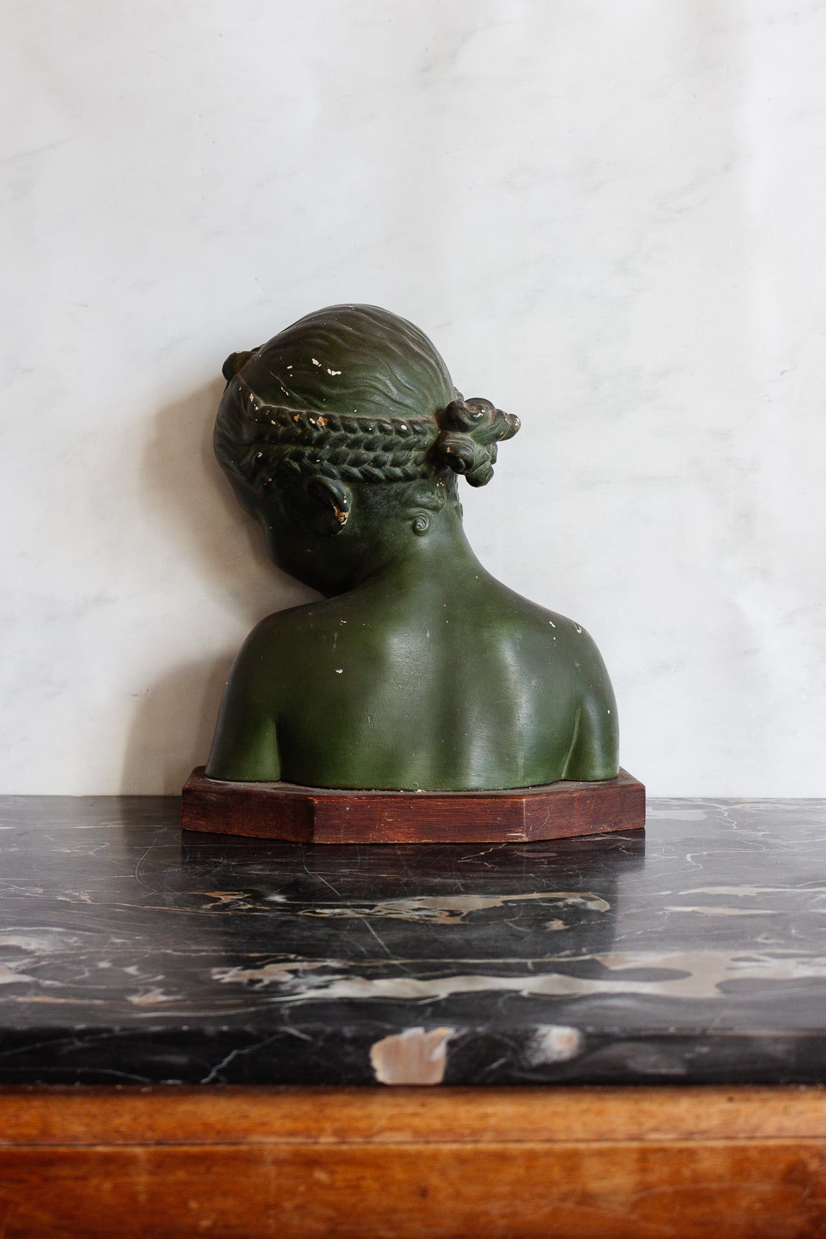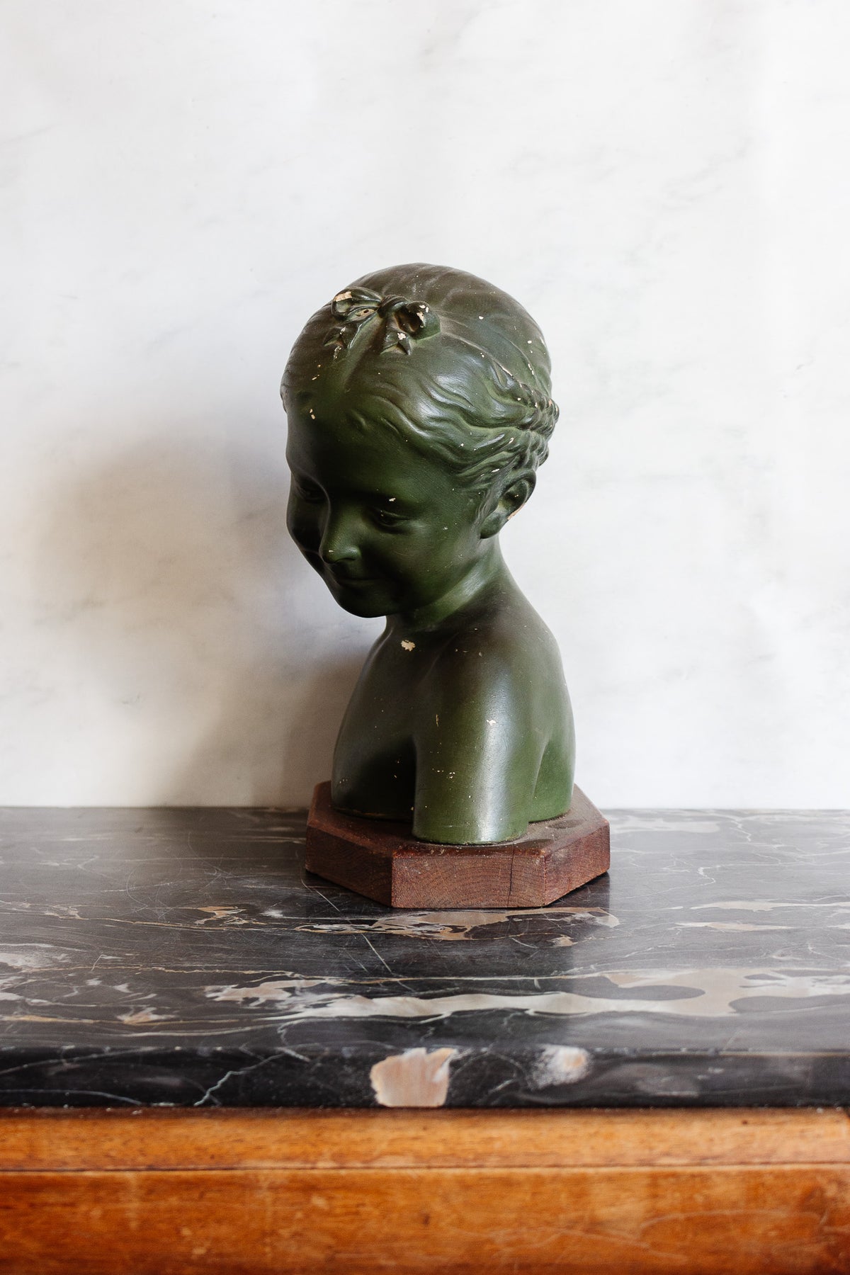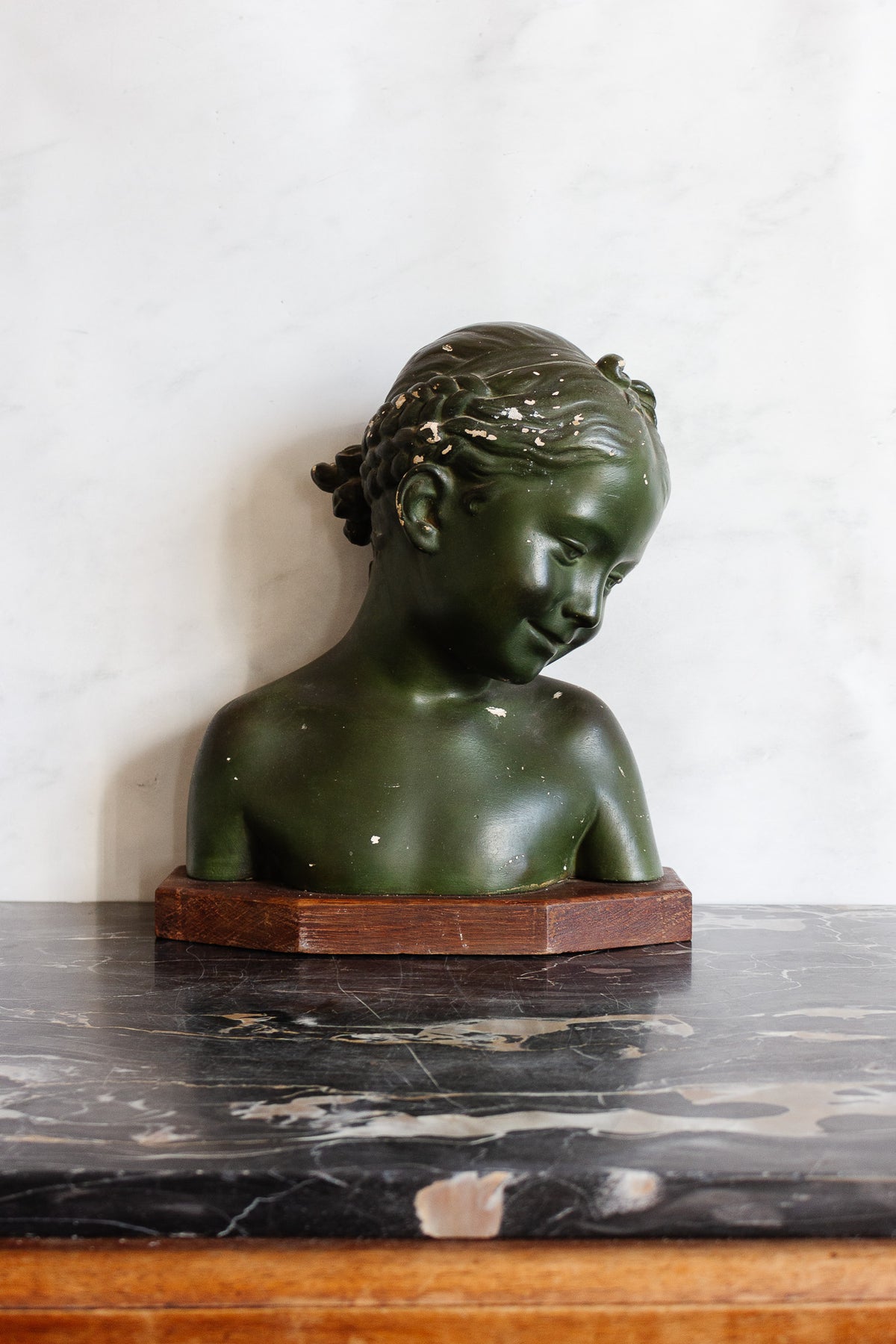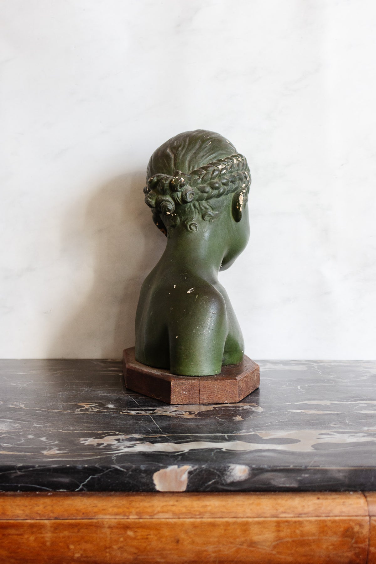 This painted plaster sculpture is on a wood base. Note some chips to the finish that we think, add to the beauty and character of this piece. Sourced from an estate in Aix-en-Provence.