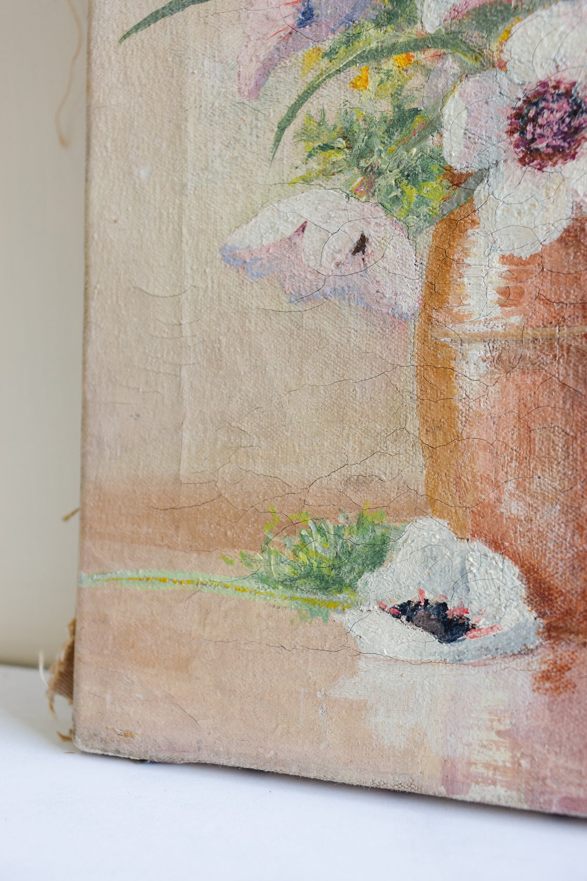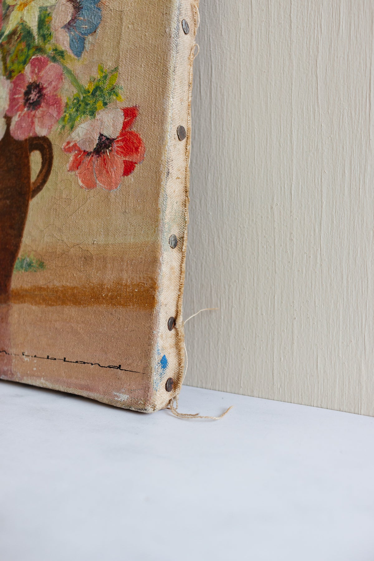 Antique French oil on canvas, of a beautifully rendered pot of flowers. Signed by artist and unframed as shown. Sourced from a brocante in Marseille.
