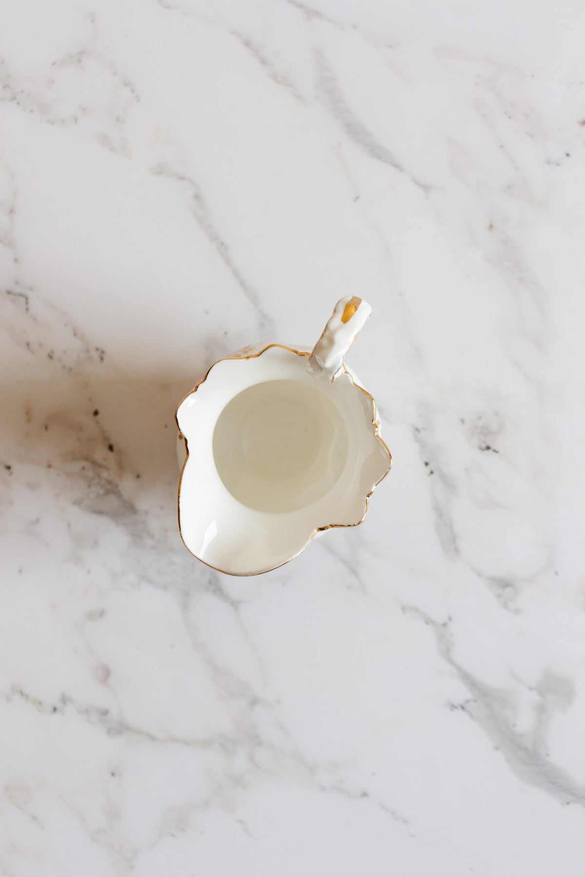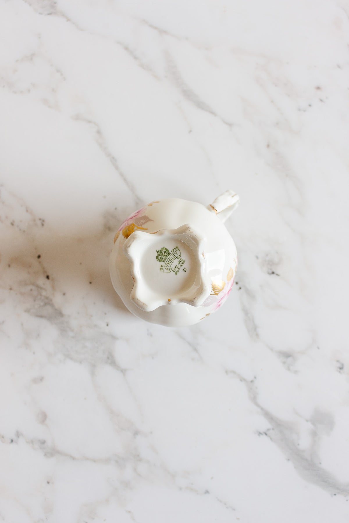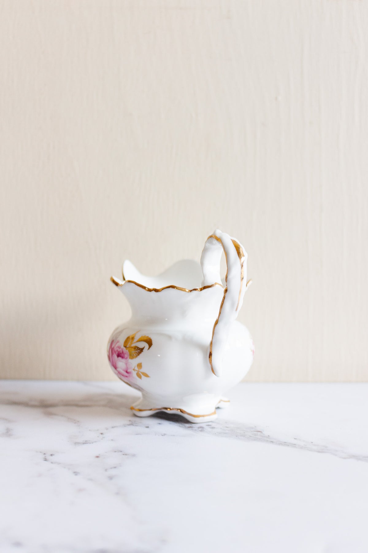 A rare vintage English Aynsley porcelain creamer with sweet pink rose with gold accents. The handle is aptly named an "ear handle" due to its resemblance to a human ear.