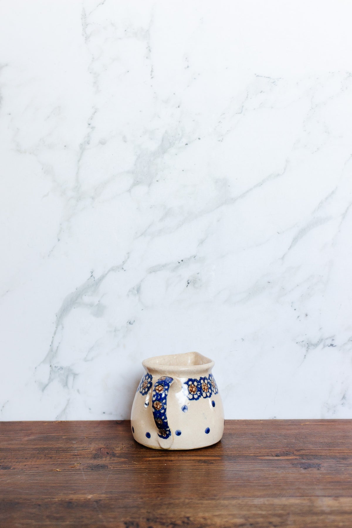Handcrafted in the Polish town of Bolesławiec, this stoneware pitcher showcases the region’s celebrated tradition of hand-stamped patterns in rich cobalt blue and warm brown tones.