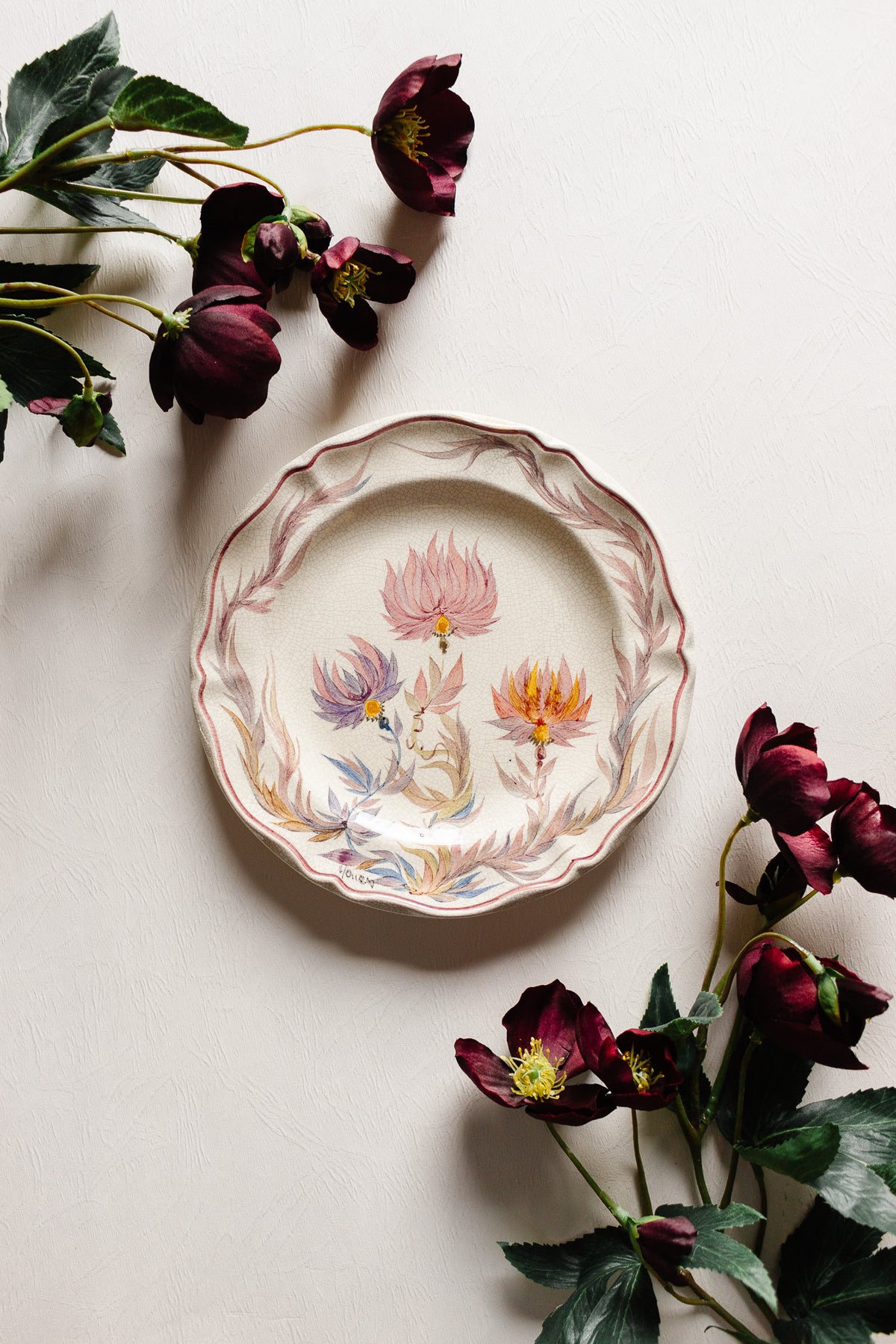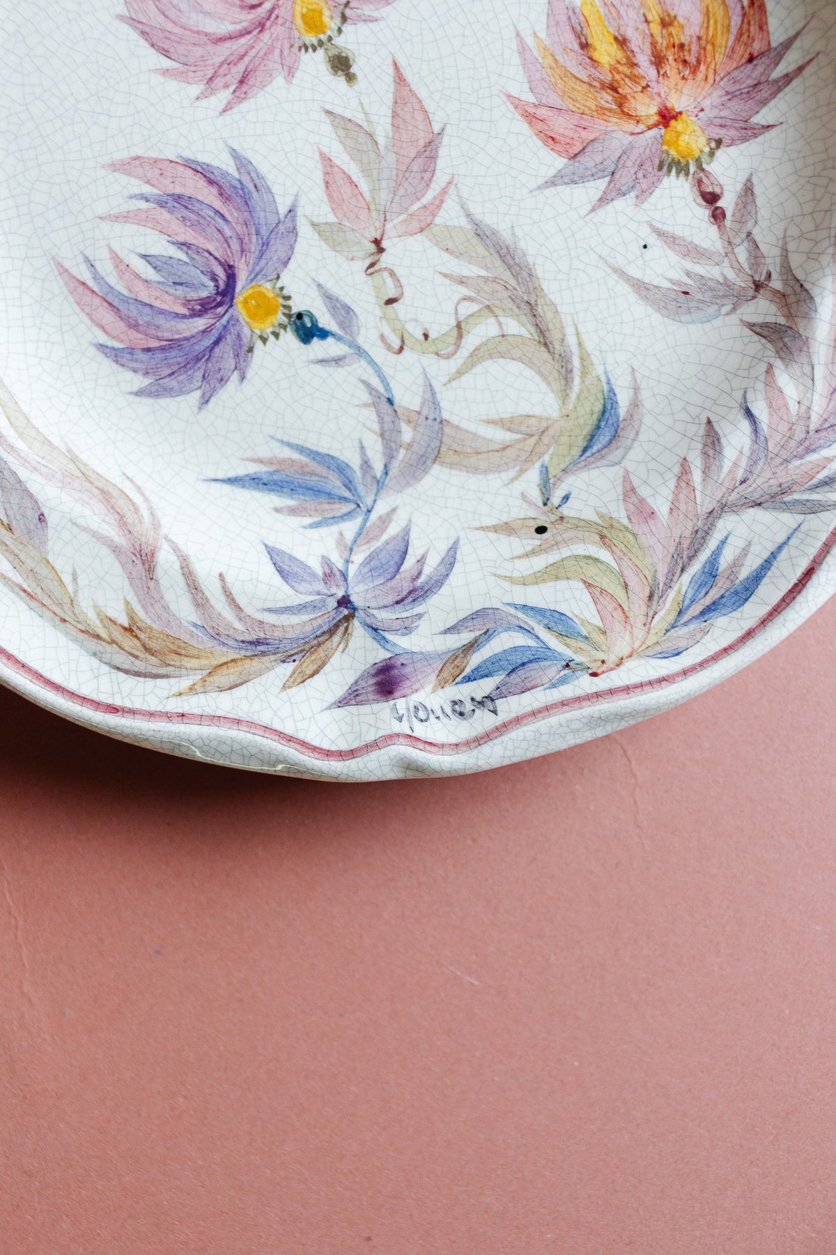 This vintage french Quimper pottery plate was crafted in the region of Brittany, France. Quimper pottery, known for its hand-painted designs, produced pieces that reflected traditional Breton motifs.