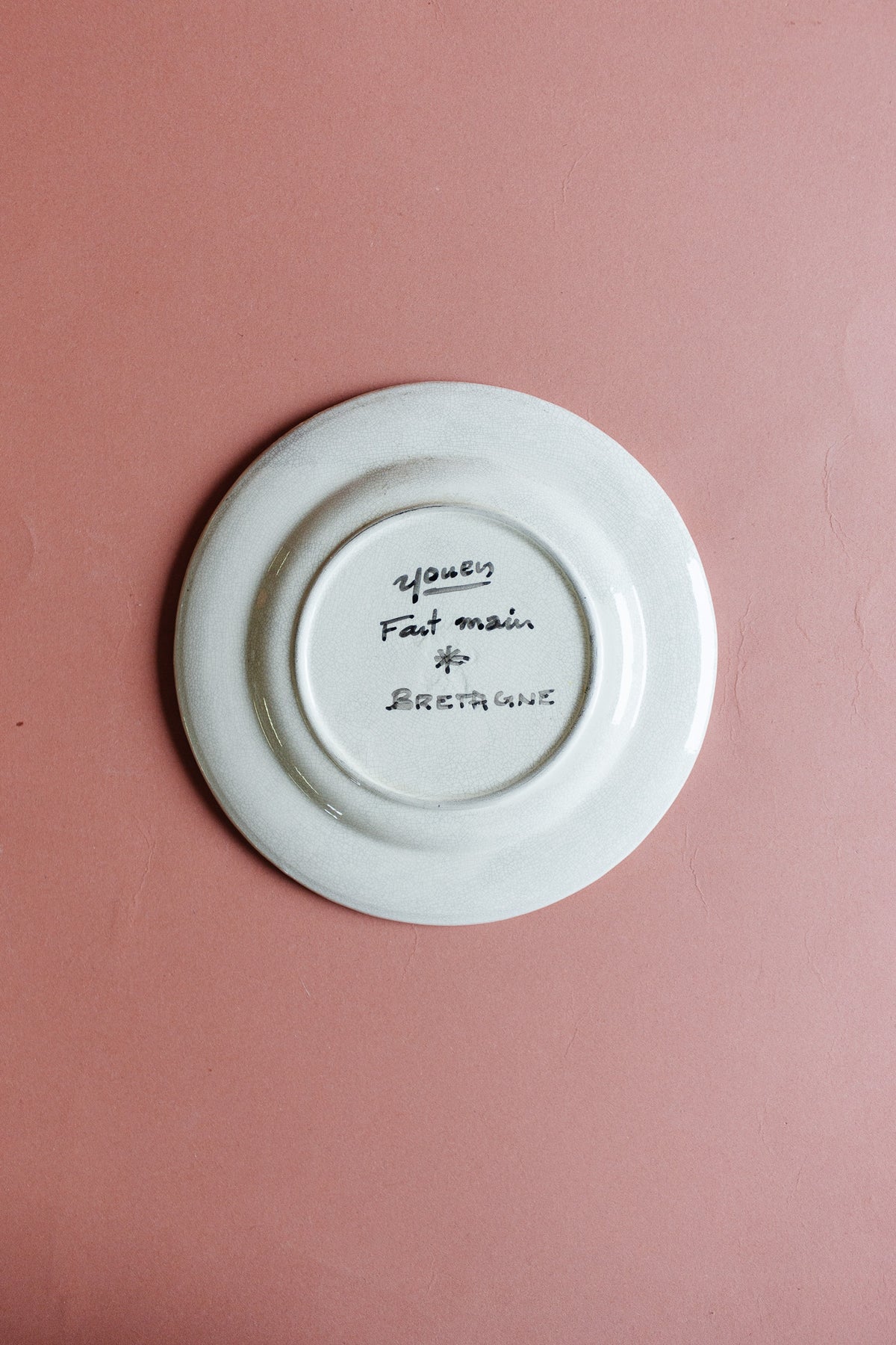 The plate is signed "Youen", the name of the artisan who painted the plate.  Yves-Alain Pleuven (who went by Youen) was an artist born in 1929 who was active during the mid-20th century. His pieces are date around the 1950s and 1960s.