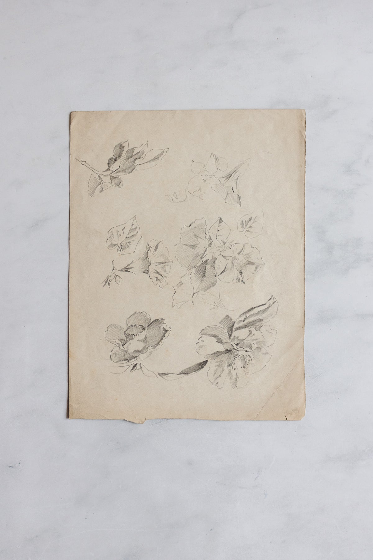 Incredible turn of the century French flower study sketch on paper, featuring multiple florals in graphite. This piece is unsigned and undated. Ready to frame, if desired.