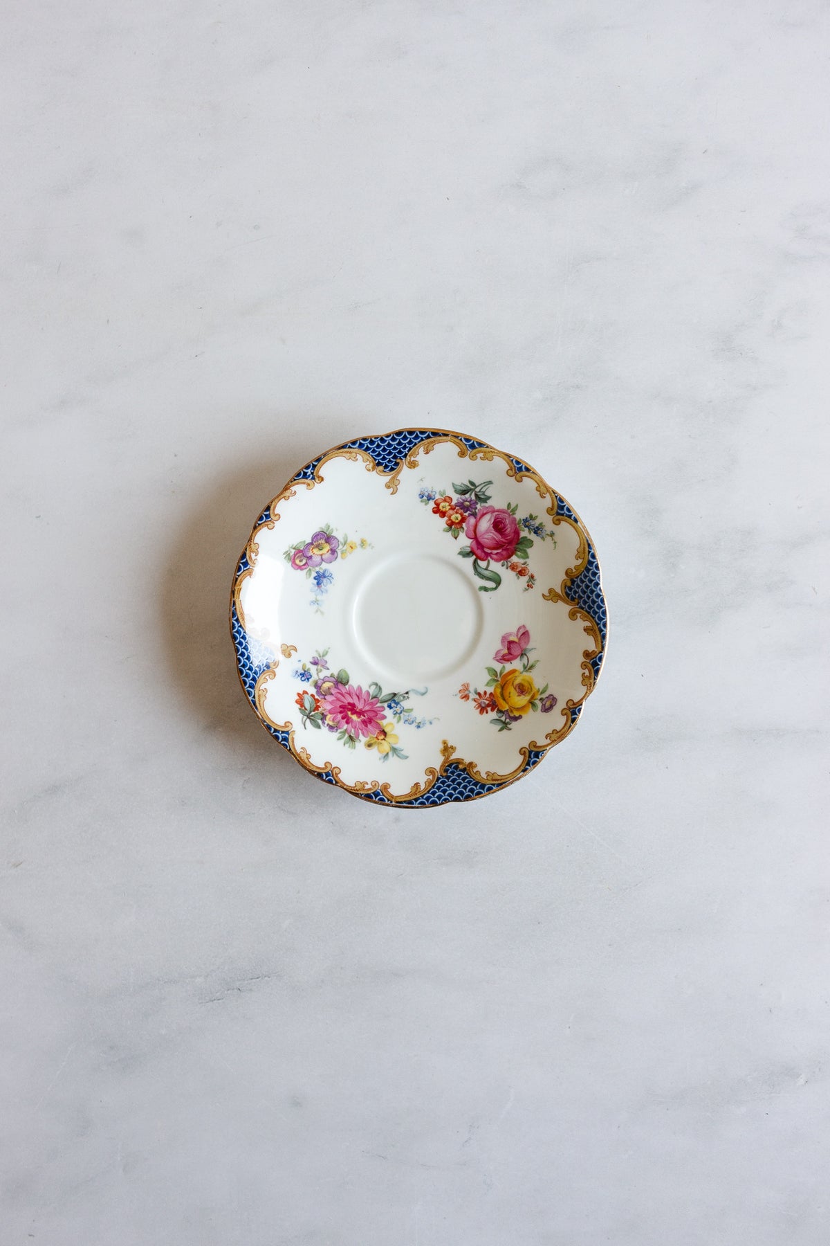 A stunning tea cup and saucer set in the exquisite oban shape by Aynsley. This highly collectible delightful duo showcases a captivating design featuring vibrant bouquets of mixed flowers on pristine white porcelain. The cup's inner rim and the saucer's outer rim are adorned with charming blue mermaid scales and elegant gold curlicues, adding a touch of enchantment. Both pieces are accentuated with intricate gold trim. Sourced from an estate in Aix-en-Provence.