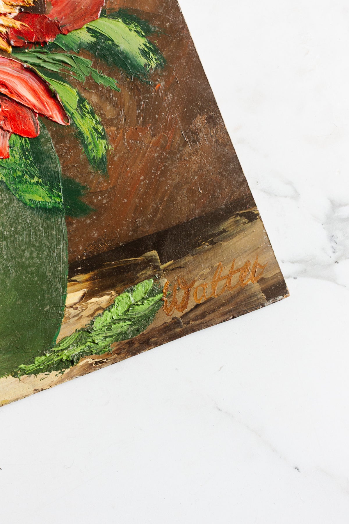 Sourced from a brocante in Marseille, this signed piece depicts a lush arrangement of chrysanthemums and mixed blooms gathered in a green vase. Painted in an impressionistic style with thick, textured impasto (a painting technique where the artist applies paint very thickly), the flowers feel almost sculpted, catching light across their layered strokes. A warm, expressive work that adds depth and color to any room.