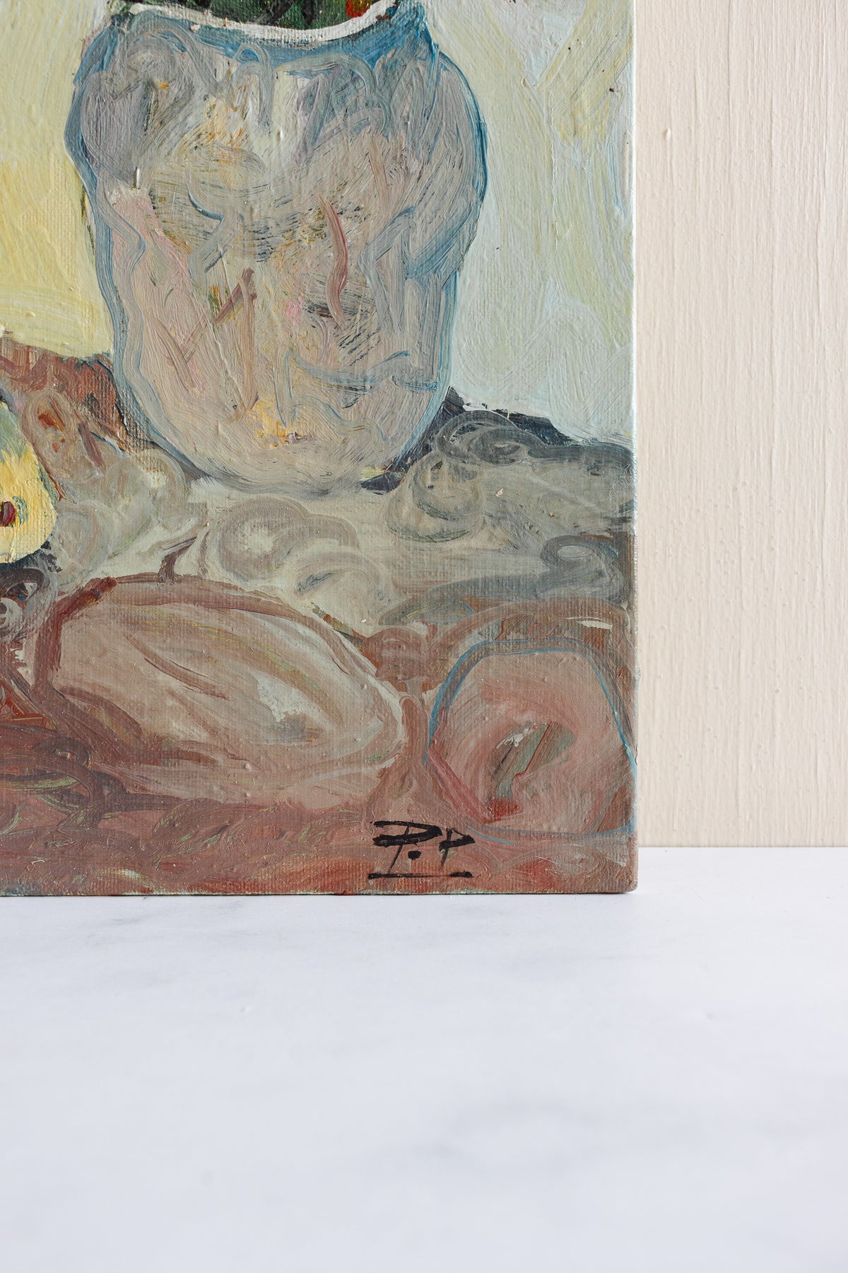 A beautifully rendered still life, that echoes the swirling lines of Van Gogh. Vintage French oil on board, unframed as shown. Sourced from a farmhouse in Marseille.