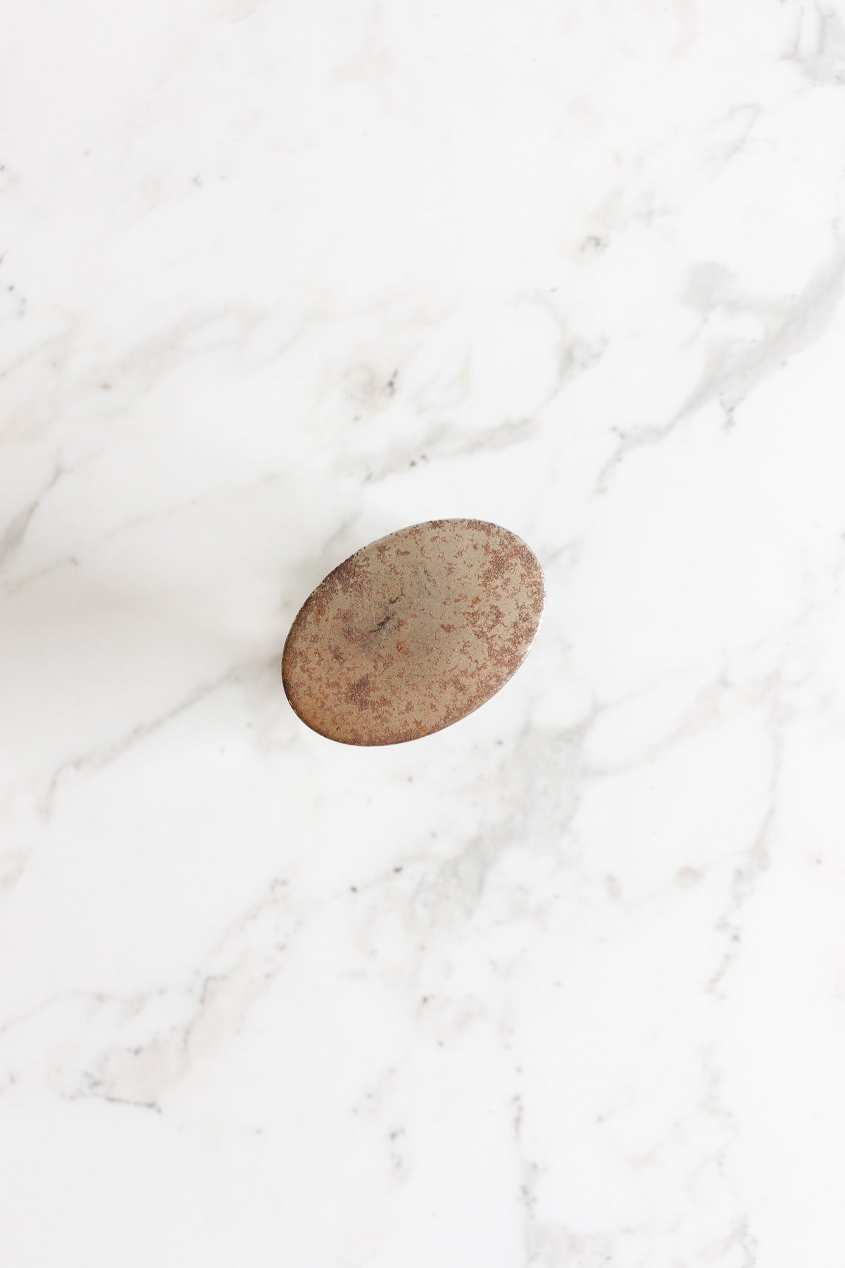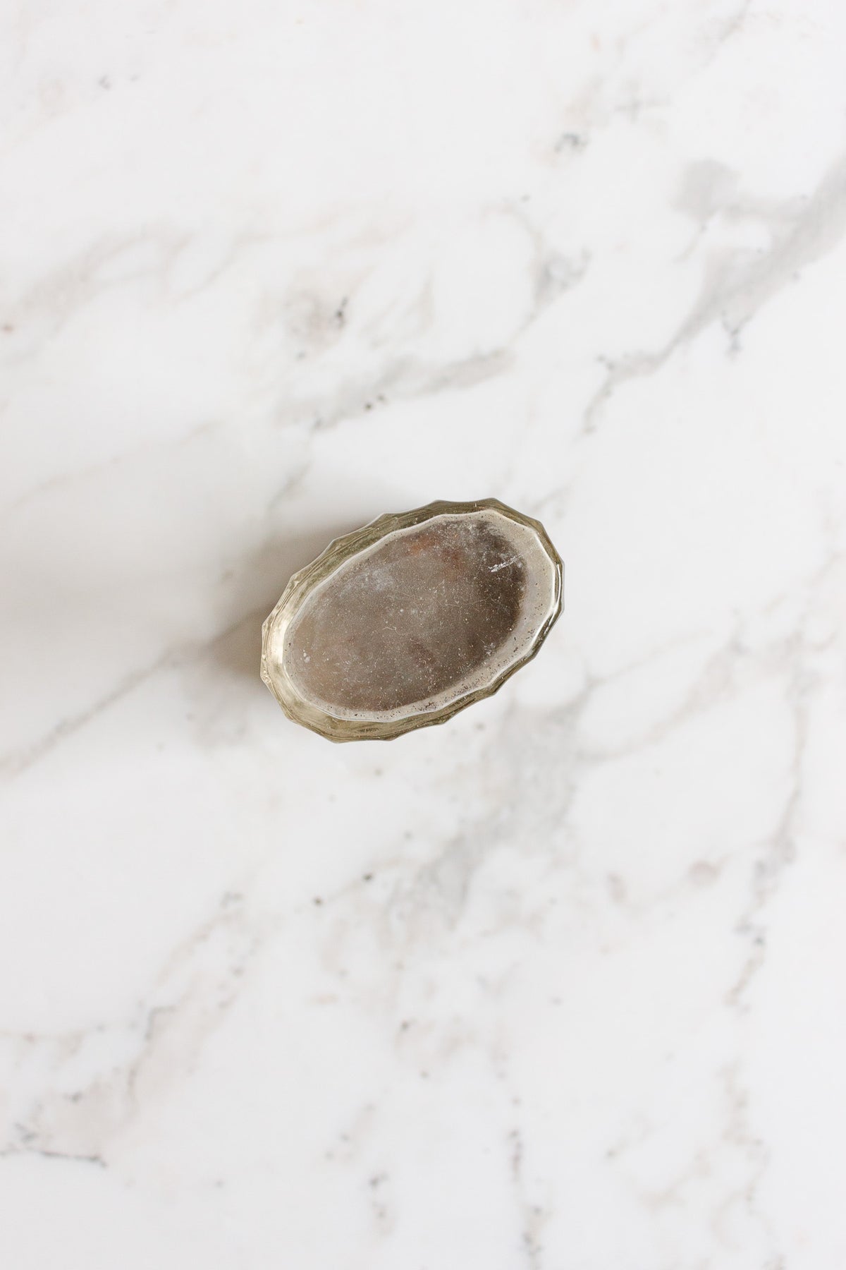A beautiful oval antique glass jar with silver lid that.would once have been used on a boudoir to hold cotton pads, makeup, or bijoux. Sourced from a brocante in Marseille.