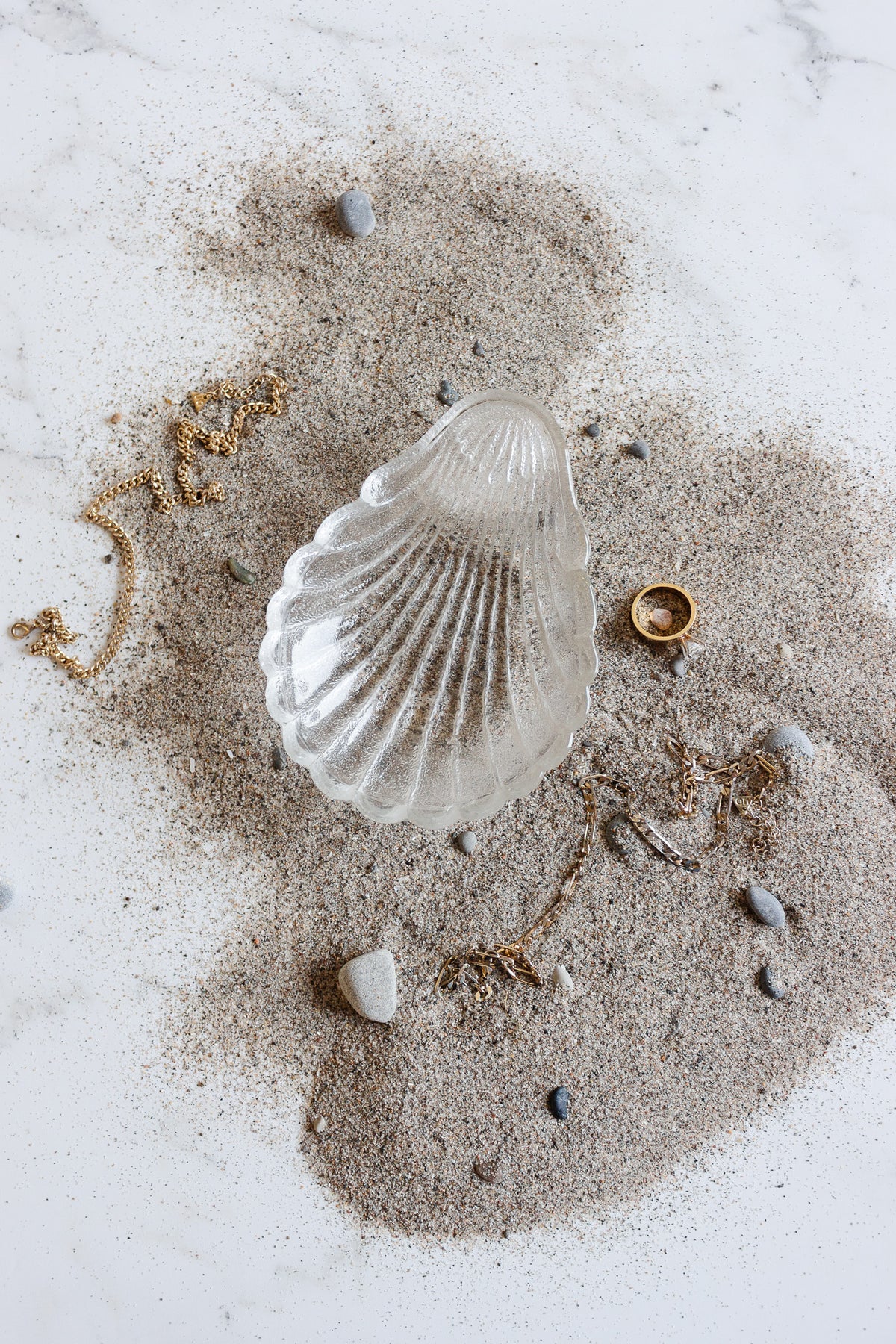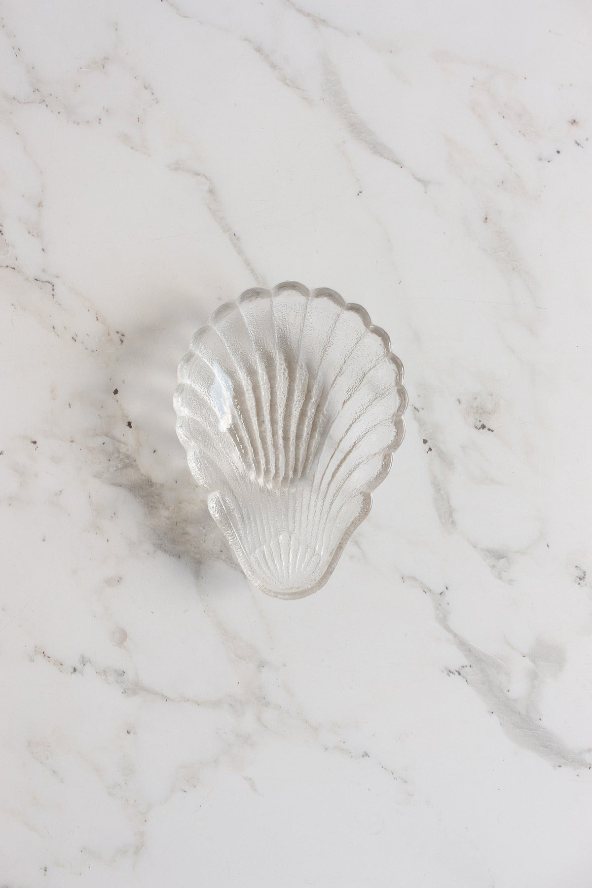 A charming set of five vintage French glass dishes, each molded in a delicate shell (coquillage) form with fine ribbed detailing that catches the light beautifully. Sourced from a brocante in Marseille, these versatile pieces are ideal for serving petits fours, sea salt, or olives—or used as elegant trinket dishes on a vanity or bedside table. A simple yet sculptural addition to any table or vignette.