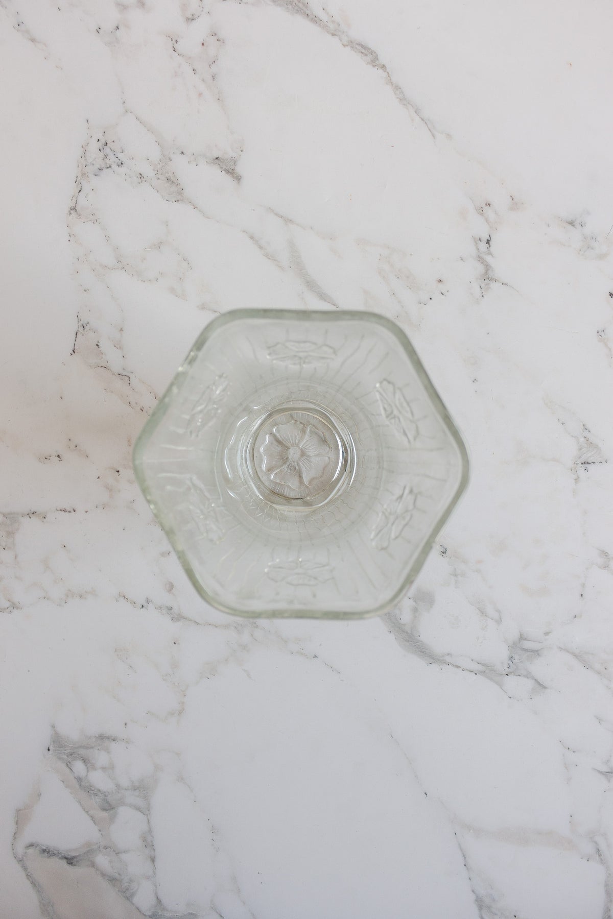 This vintage Italian embossed glass vase features a flared top and an intricate floral pattern pressed into its surface, offering both texture and elegance. Stamped “Italy” on the base, it reflects the timeless craftsmanship of Italian glassmakers. Sourced from a brocante in Marseille, it’s a graceful accent piece perfect for displaying blooms.