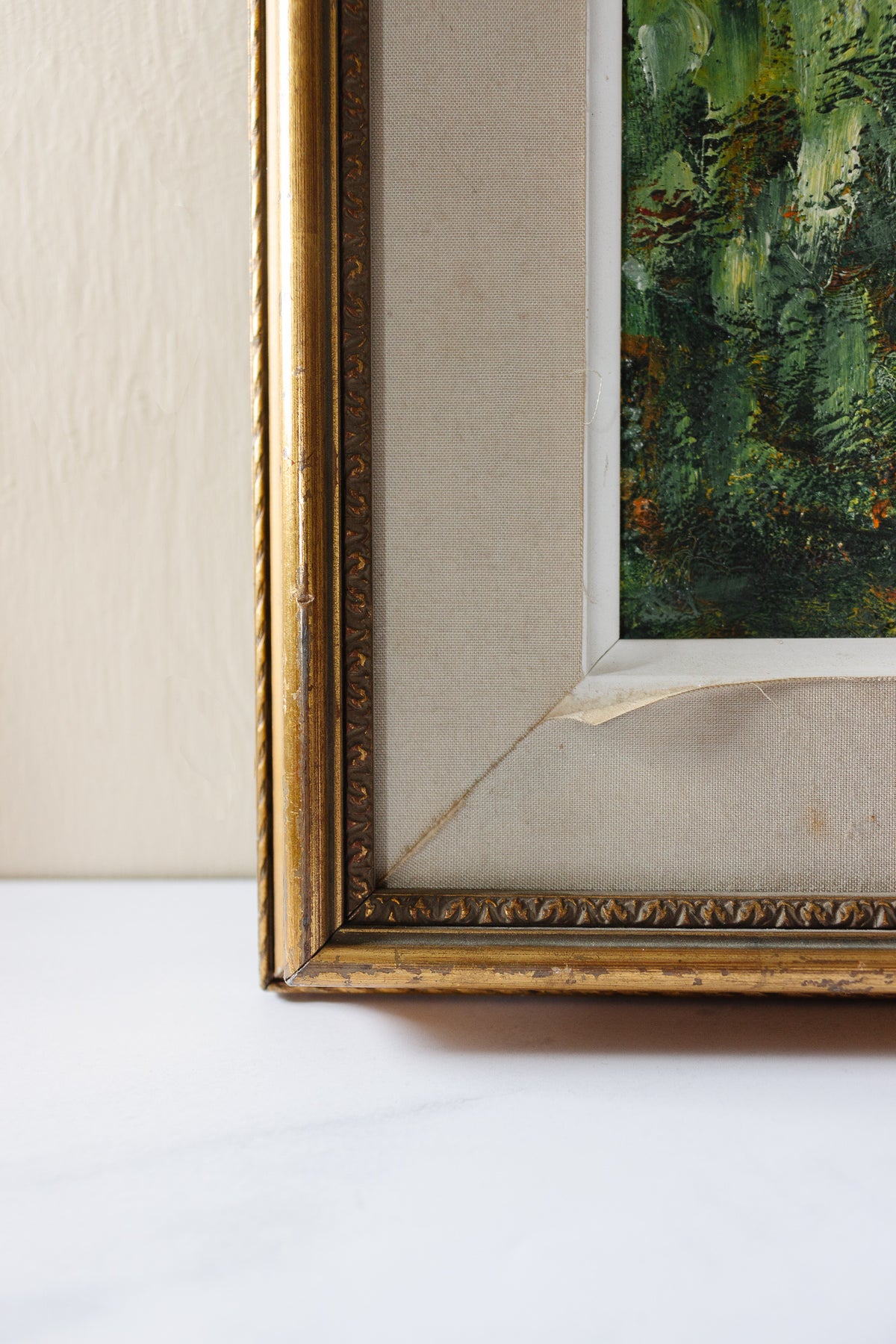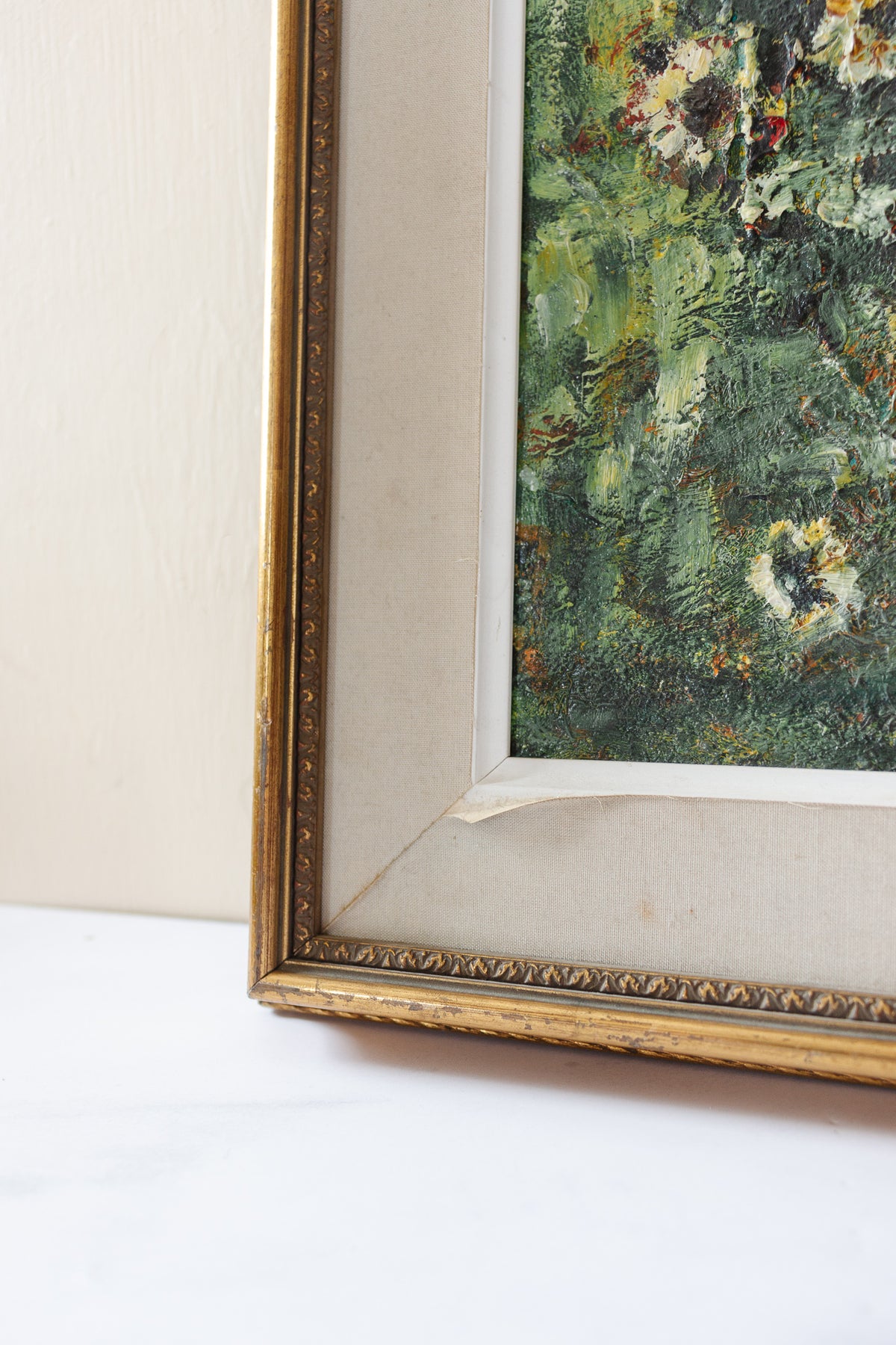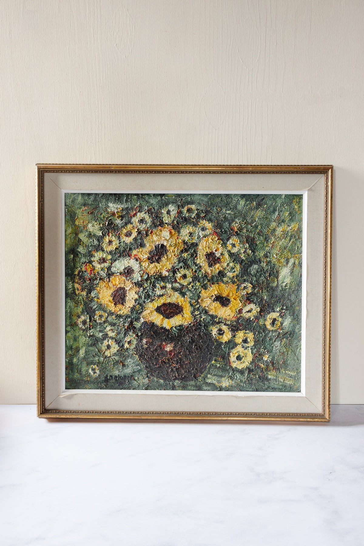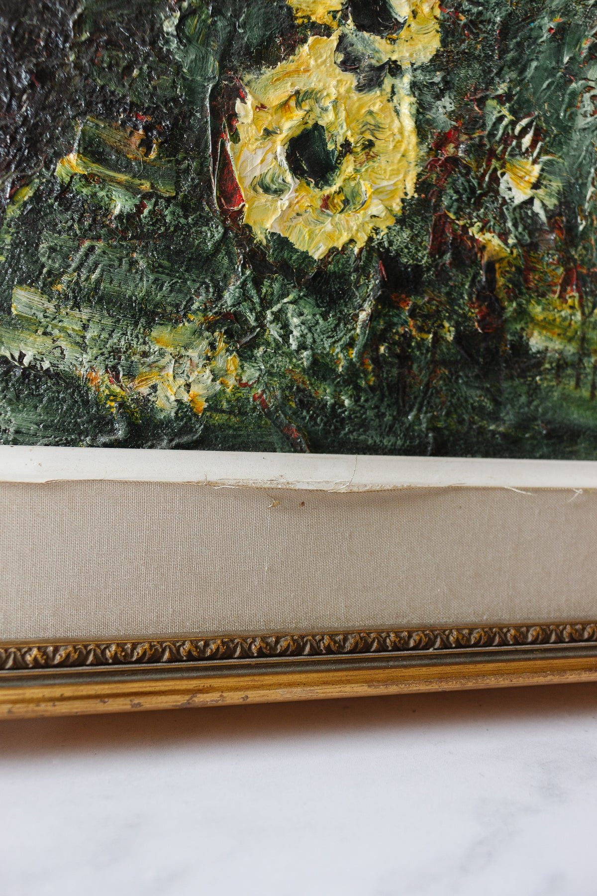 We love the quintessentially French look of this vintage oil on board in a gilt frame of blooming sunflowers. This piece is dated on the reverse. Sourced from an estate in Aix-en-Provence.  Please note the signs of wear to the frame as pictured. Priced accordingly.