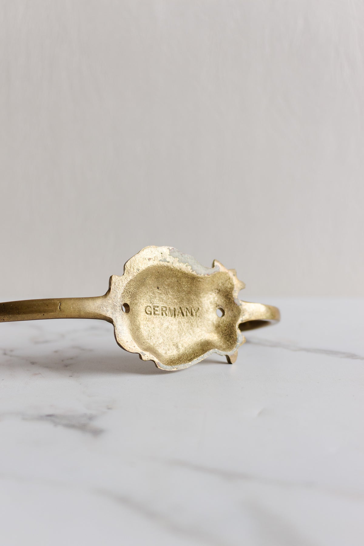A sturdy cast brass hat hook with a warm, aged patina, bringing a touch of early 20th-century German utility to your home. Its curved profile makes it perfect for holding hats, coats, or bags, whether by the door or in a dressing room. Sourced from a market in Bamberg.