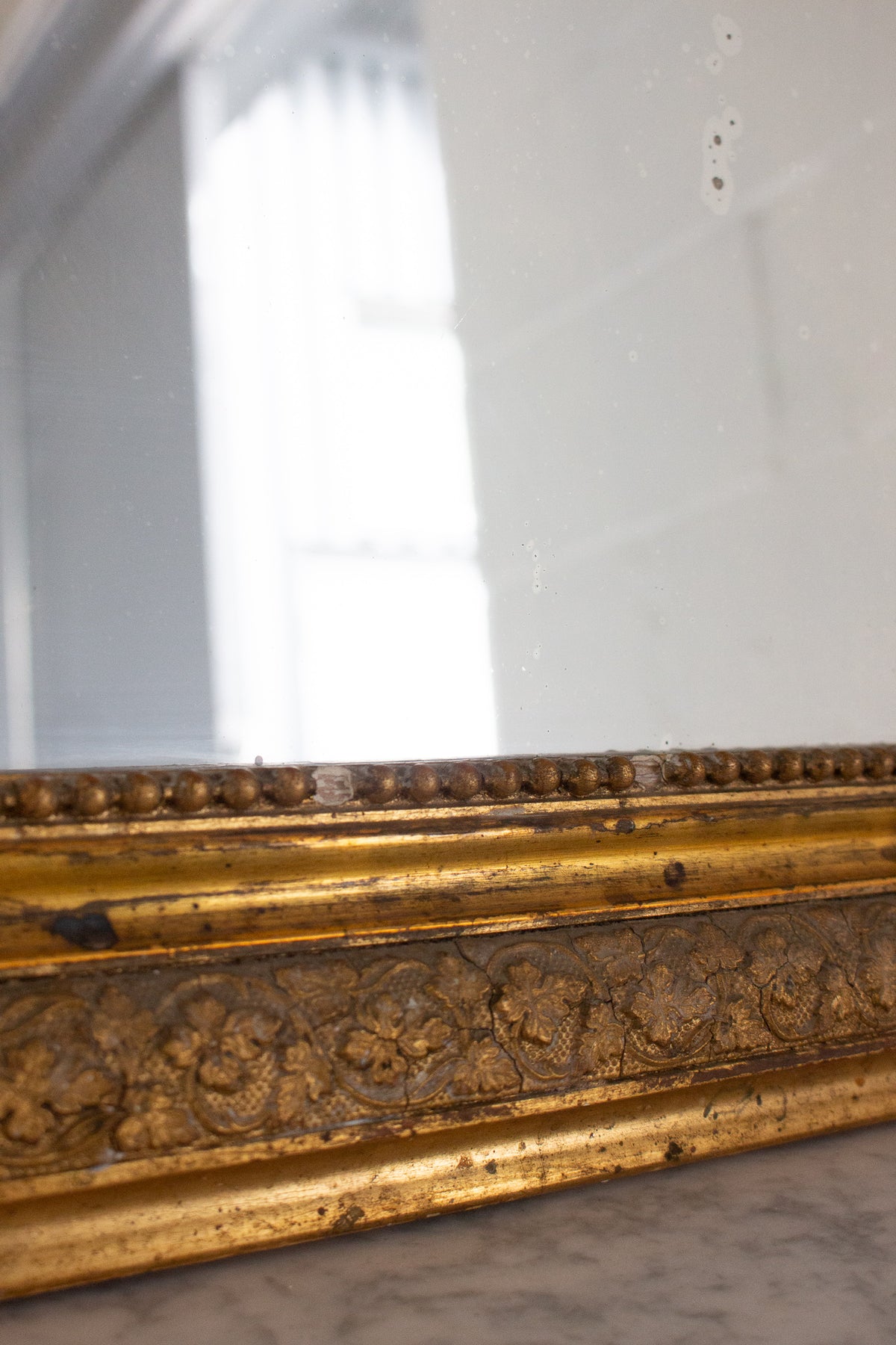 This particular turn of the century Louis Philippe mirror—with original gilt finish and carved detailing would be perfect on a dresser or in an entryway. This mirror shows signs of wear and use consistent with age including chipping to the frame.