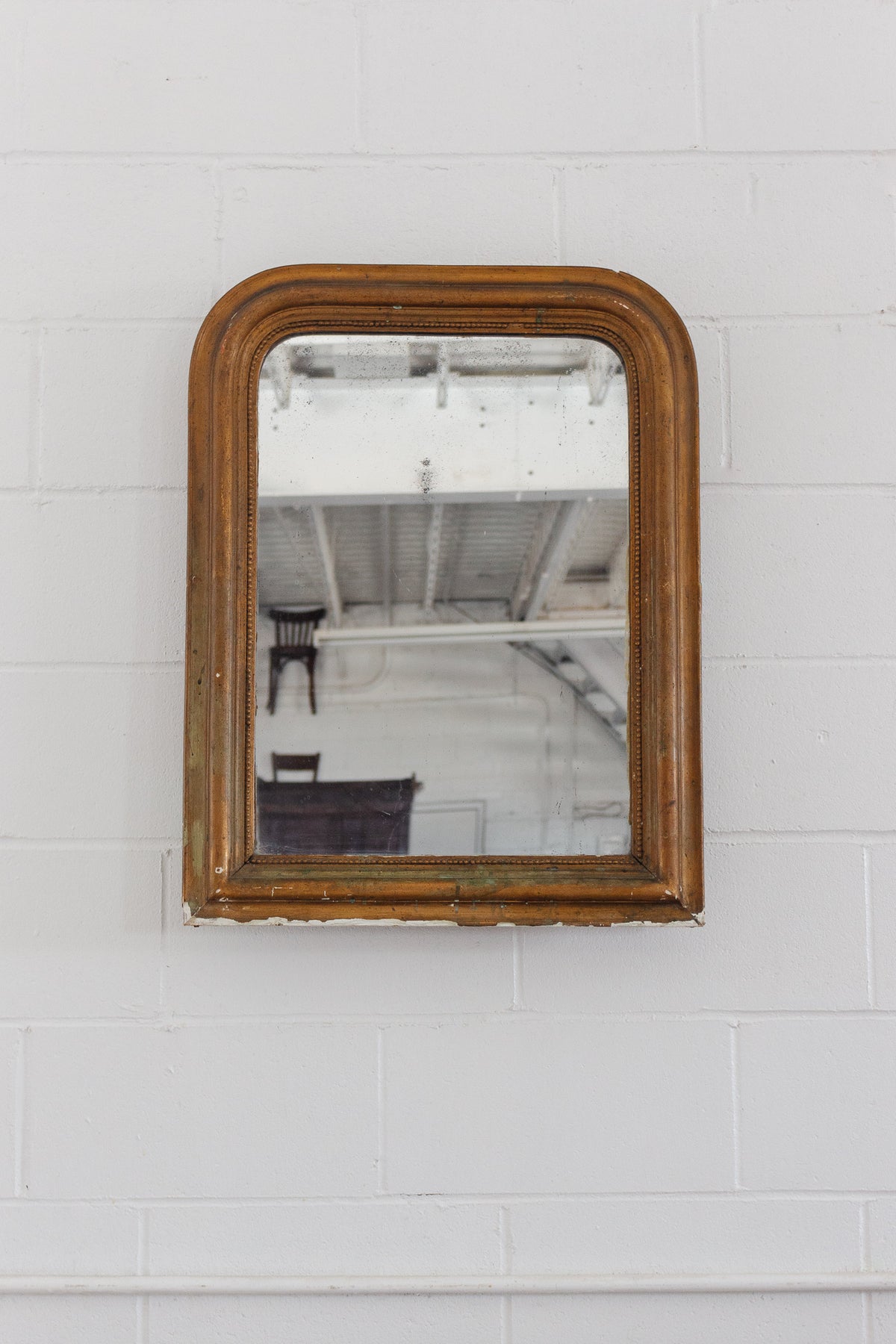 Louis Philippe mirrors add a dreamy, old world charm to any space; we love their soft, curved edges and iconic, timeless feel. This turn of the century Louis Philippe mirror features its original gilt finish that has been beautifully worn over time. Though in good overall condition, due to its age, this piece shows some signs of wear to both the frame and glass, as pictured.