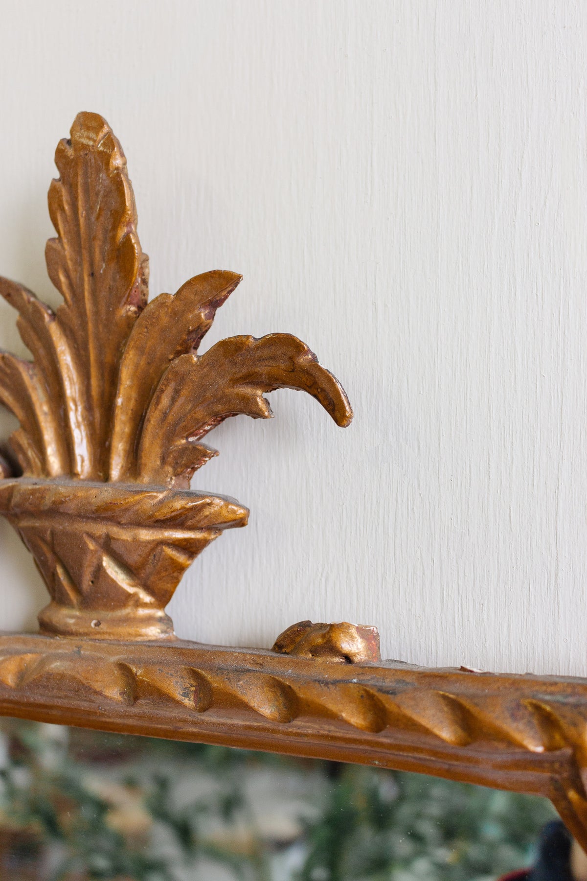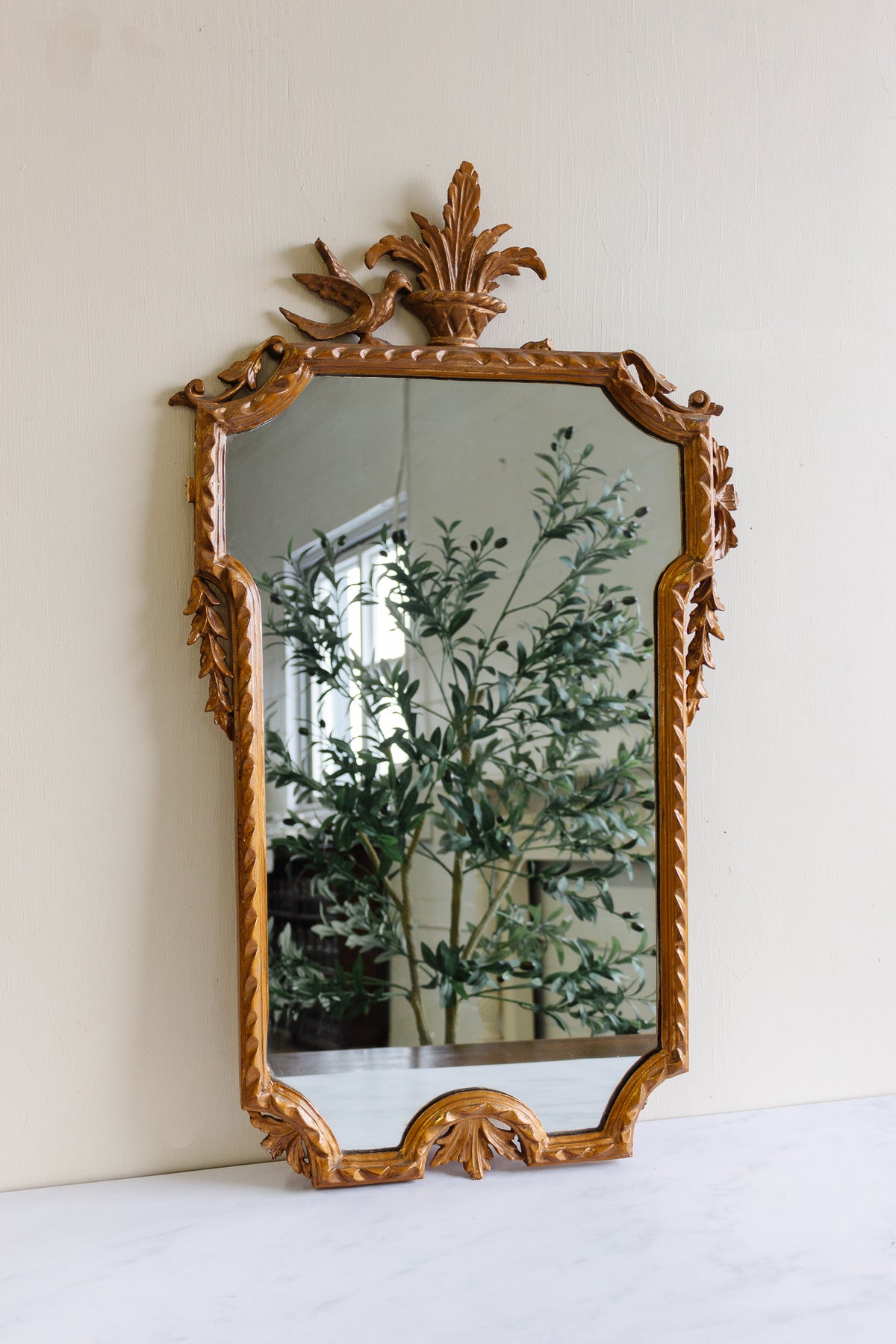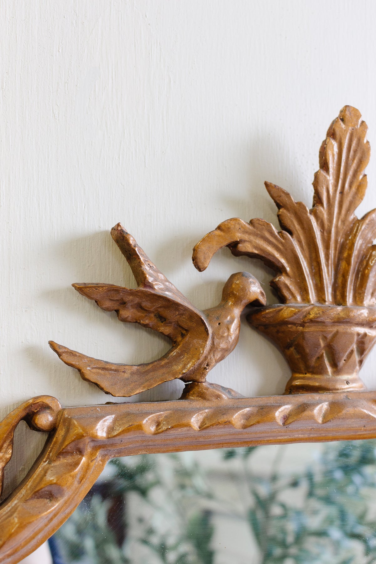 Carved wood bird detail on opposite side of cornice top broken off—remaining cornice top carved wood pieces (bird & laurel) are extremely loose and will likely break away during shipping.