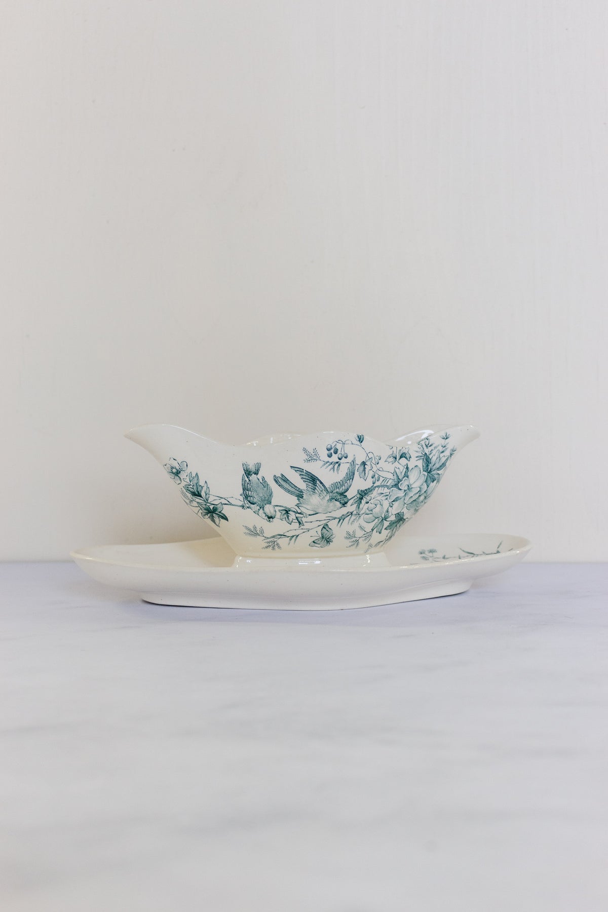 This incredible antique French gravy boat is by pottery house Longwy and it’s design is aptly named "mignon". We’ve never seen one with such a gorgeous, sweeping scene featuring always-sought-after birds as the subject, and lots of pretty unexpected details—like foliage on the base plate! Another one of a kind heirloom piece.