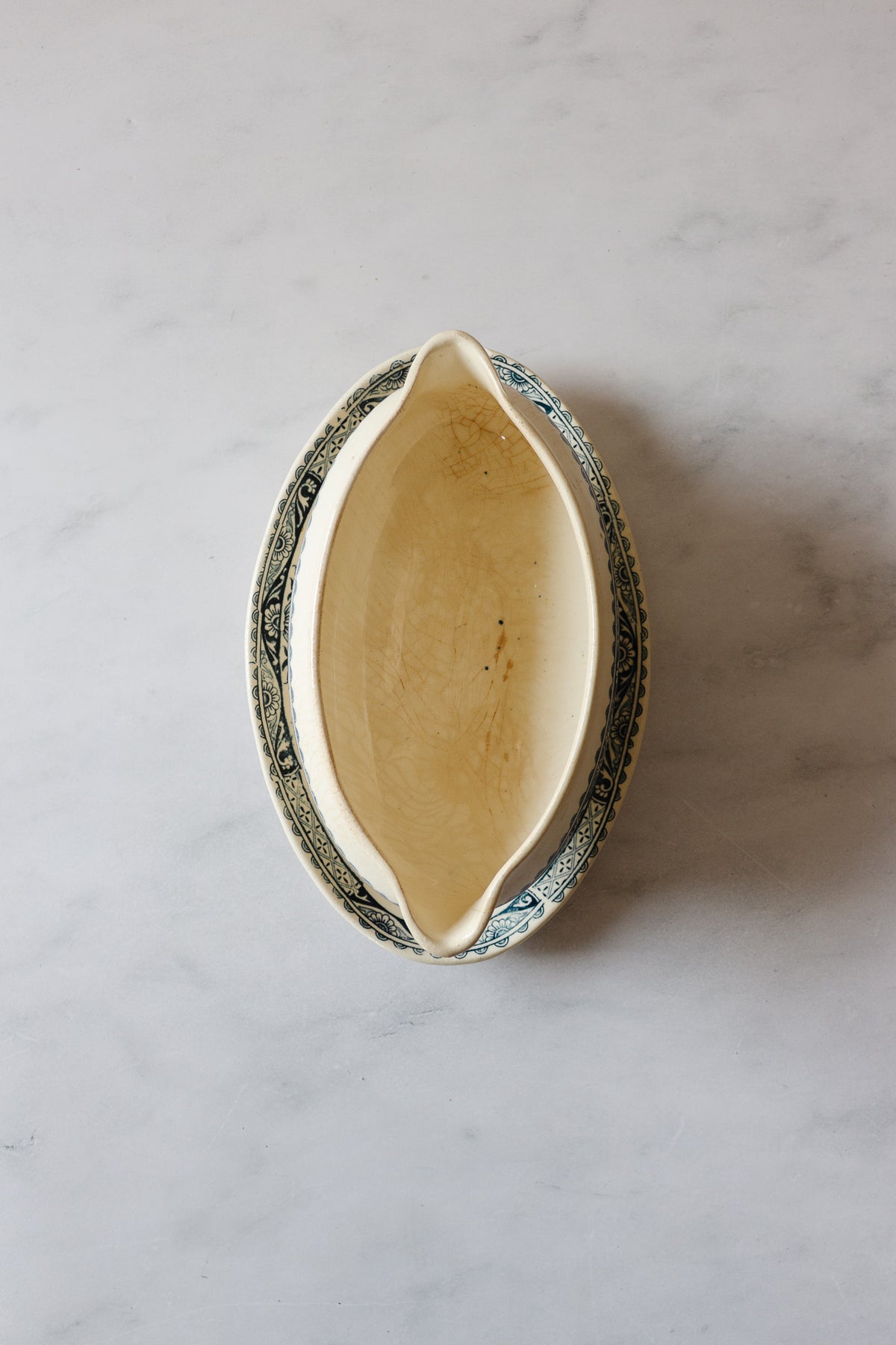 A beautiful antique french gravy boat sourced from a brocante in Marseille.  Note the signs of age to the inside and a chip as pictured (priced accordingly). Stamped Lonwgy France on the bottom.