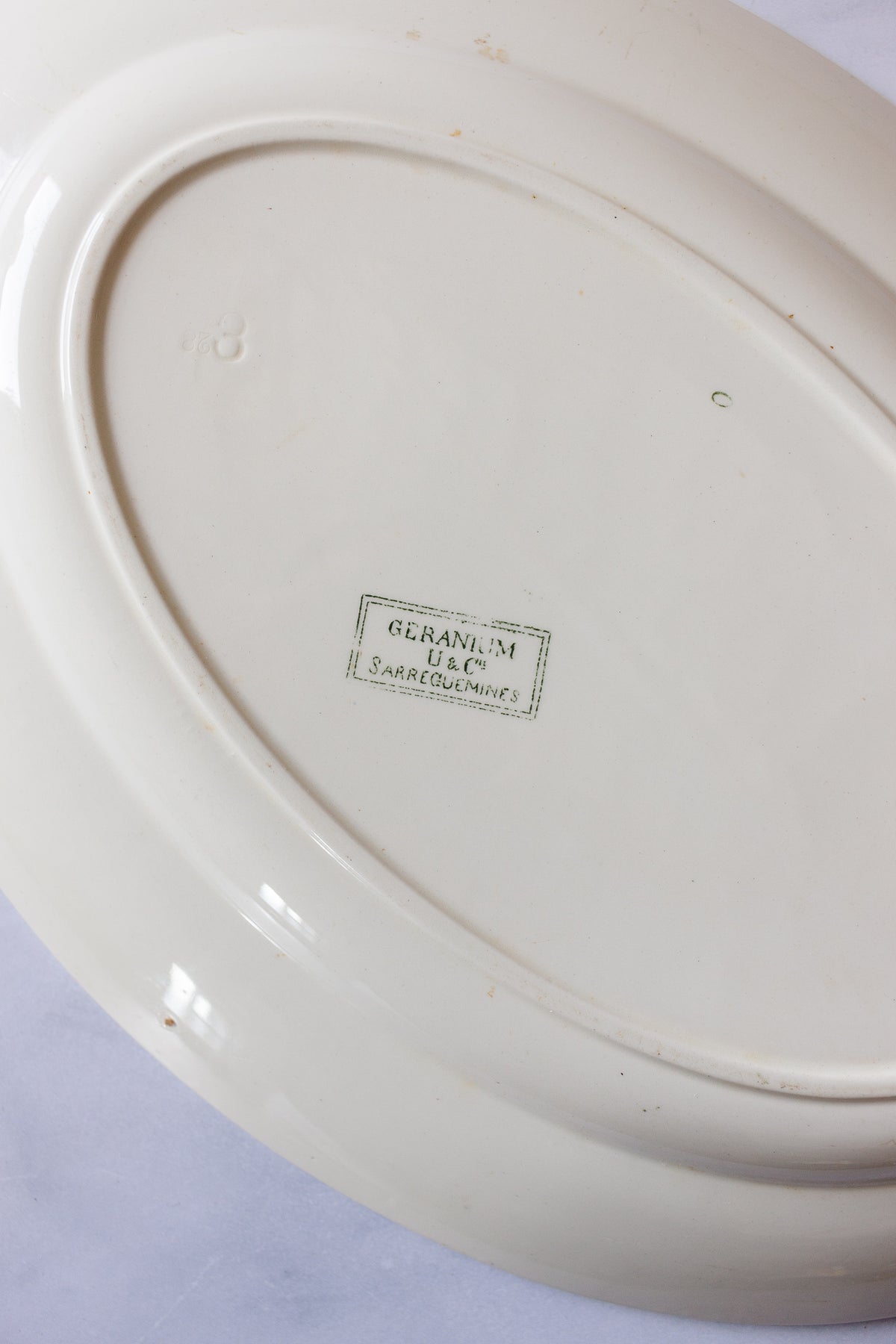 French transferware pieces are kitchen and serving staples. The design, craftsmanship and detail are all heirloom quality. This incredible green and white platter with its intricate, richly detailed floral border by Sarreguemines “terre de fer” or ironstone manufacturers is in excellent antique condition, lovingly cared for by a family in Aix-en-Provence, and now ready for another life in your home.