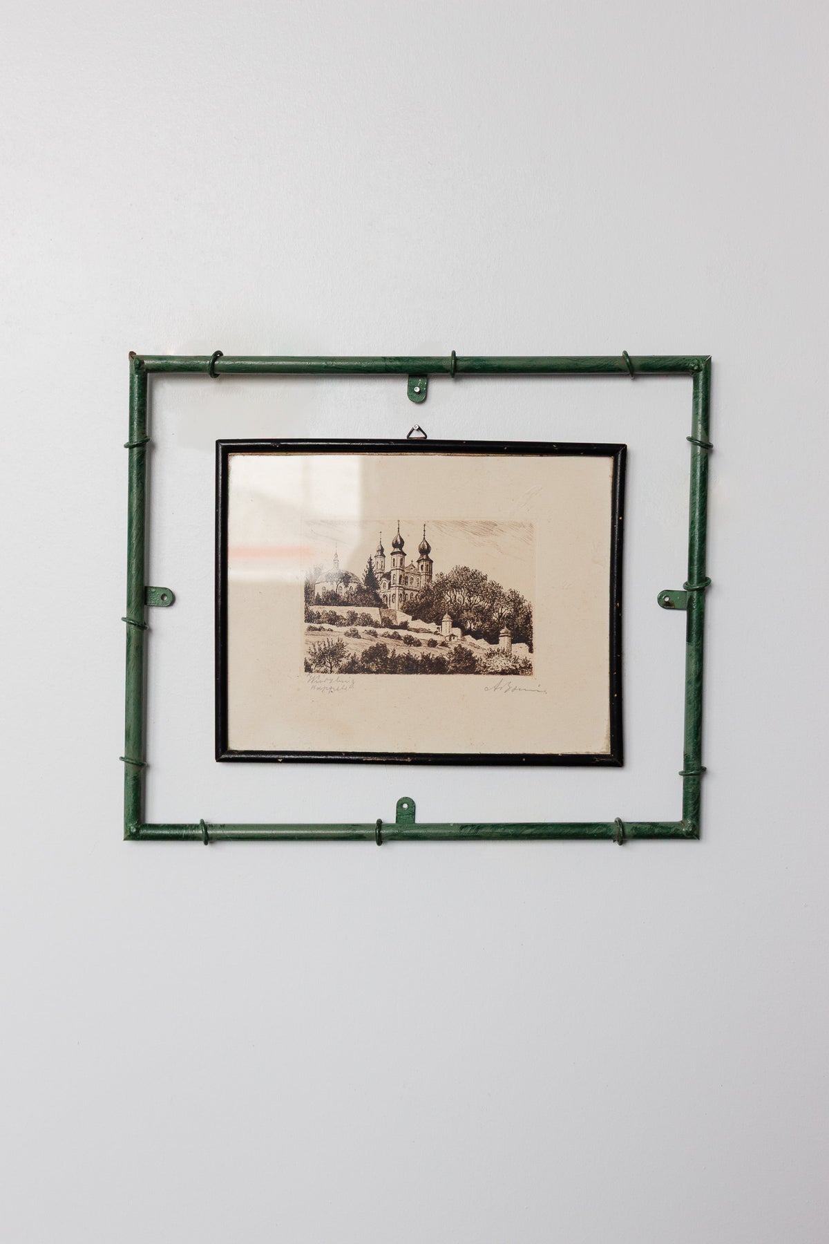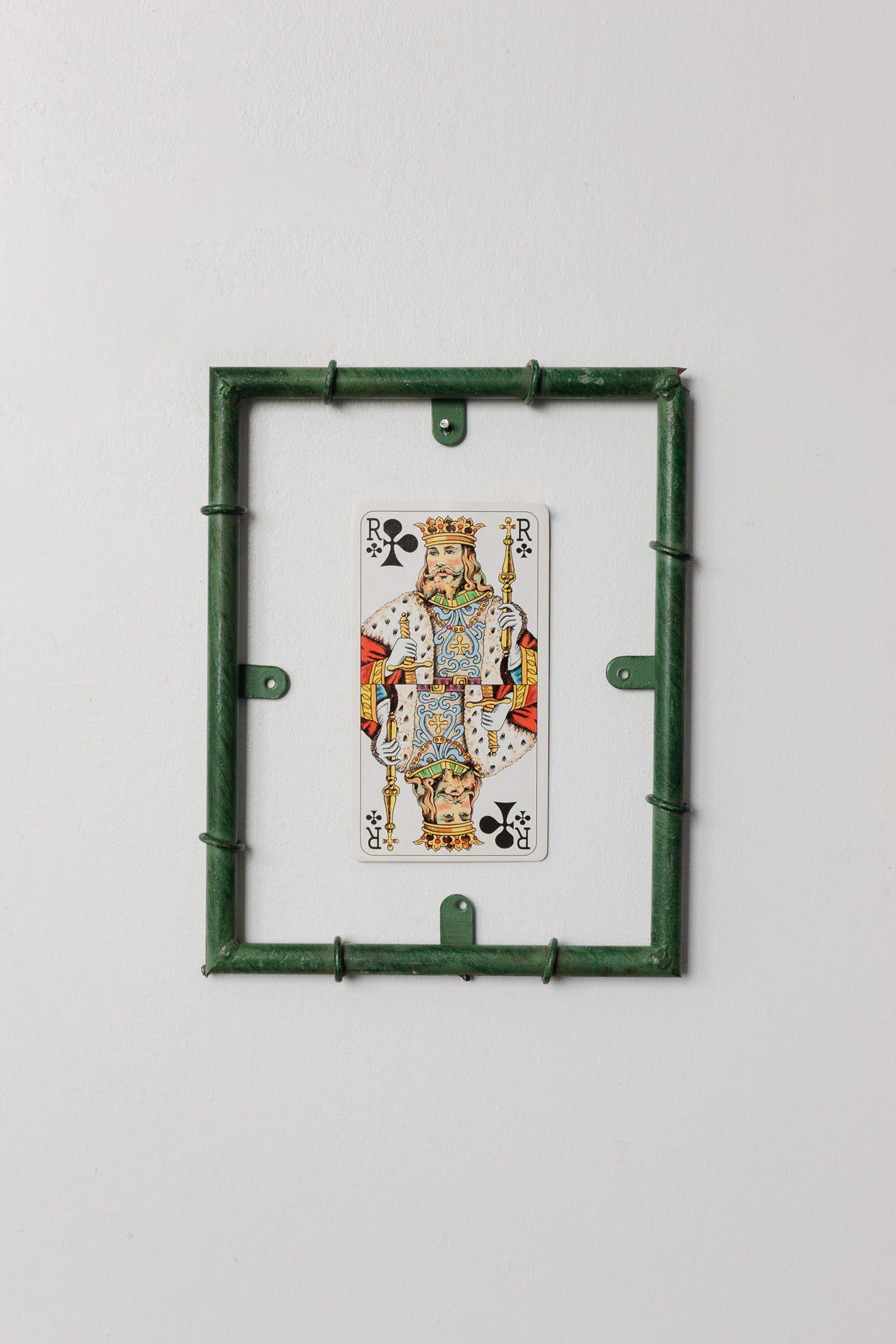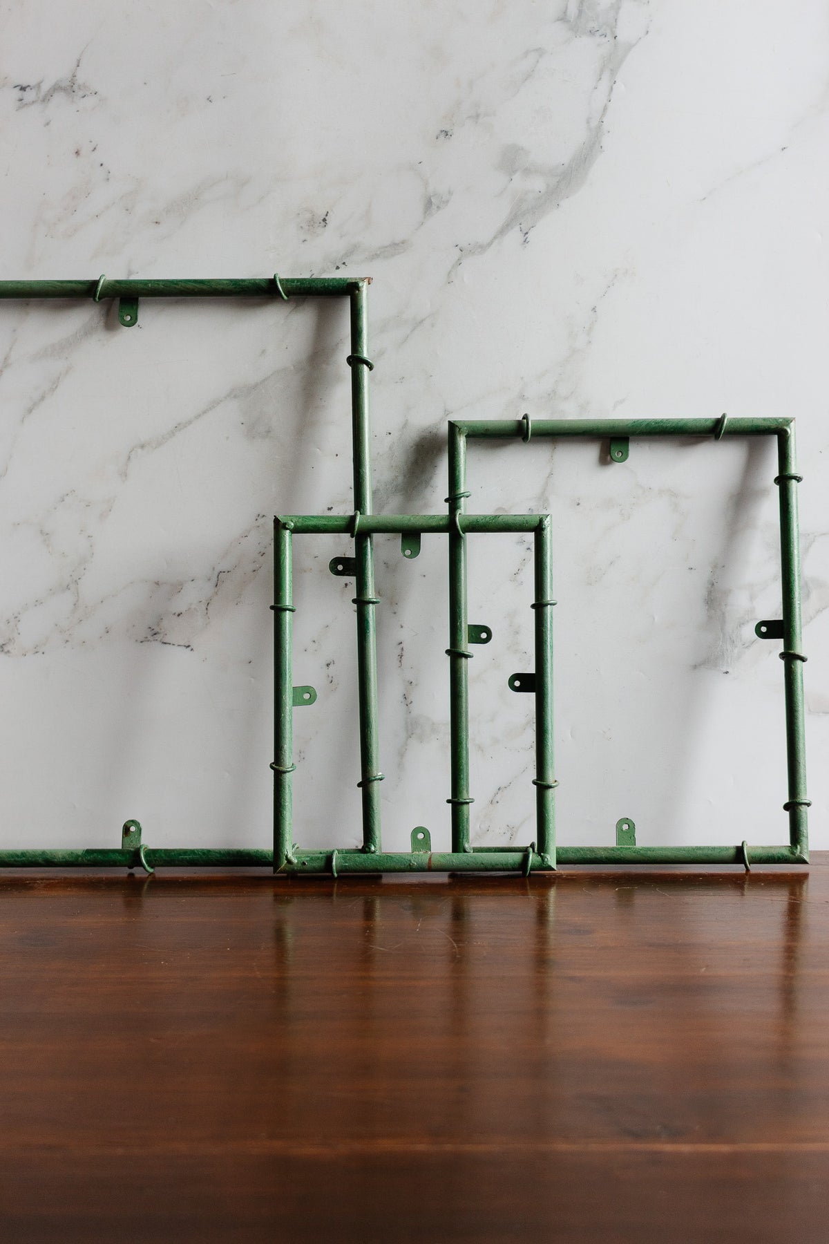 These delightful vintage French frames in painted green metal are designed to mimic bamboo, with their ringed joints and slender tubular forms giving them a playful yet polished look. Sold without glass, they are light, wall-ready, and perfect for displaying postcards, botanical prints, playing cards, or small artworks with a casual, pinned-in charm. Available in three sizes, they look wonderful grouped together on a wall or scattered through a gallery arrangement. Sourced from a brocante in Marseille.