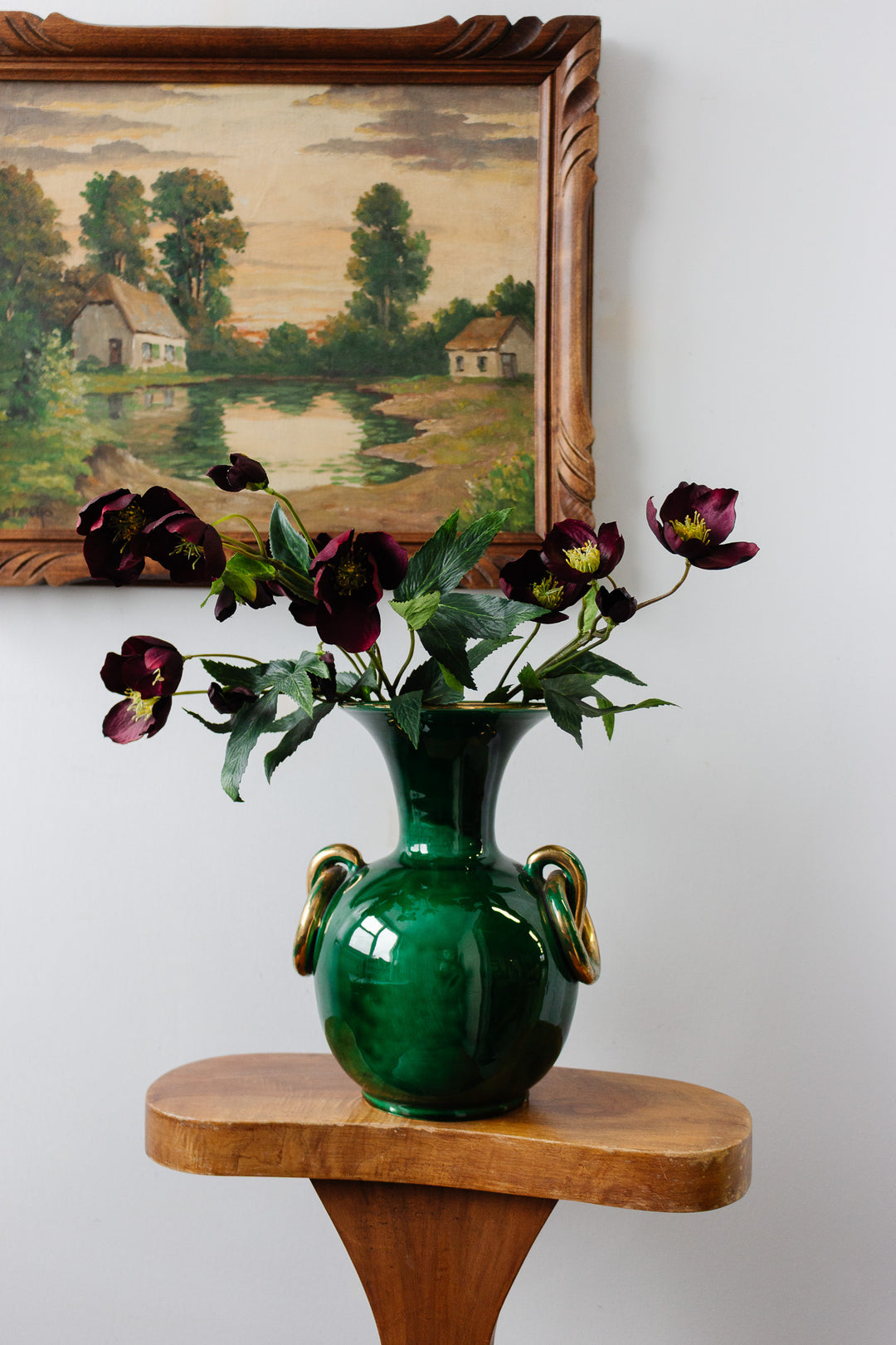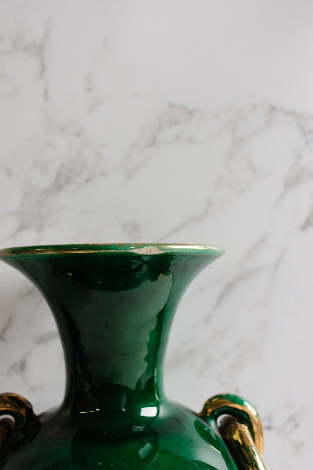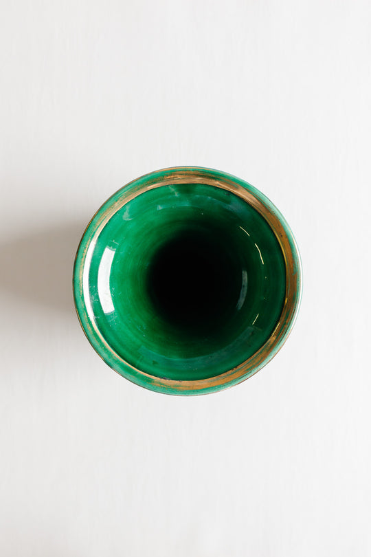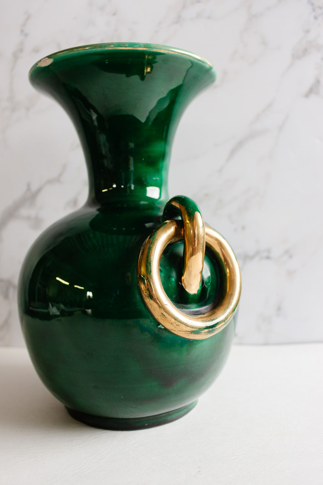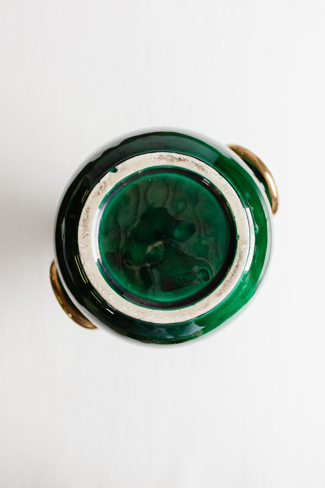 This heavy, glazed, vintage vase in a stunning emerald green with gilt accents is a perfect example of Vallauris work. Stamped on the bottom. Sourced from an estate in Marseille.