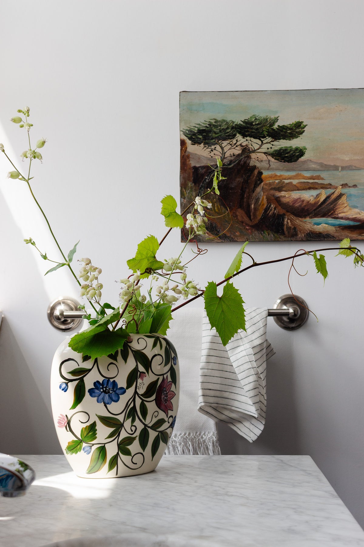 A whimsical handpainted italian vase with a slim profile signed by the artist "Kitty". Sourced from a family estate.