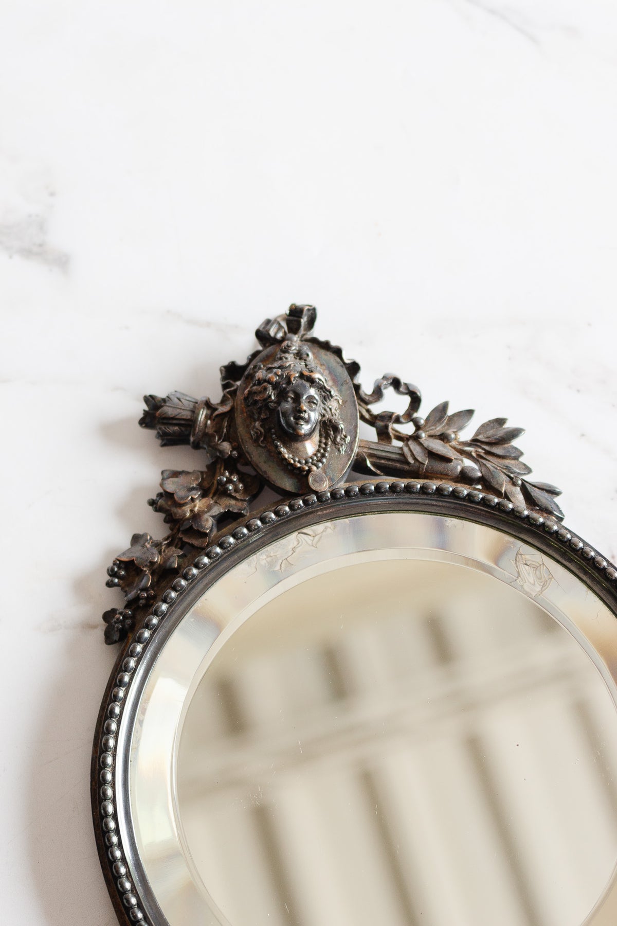 This antique French hand-held mirror showcases the elegance of Louis XVI style, with its symmetrical design, refined detailing, and classical motifs like laurel leaves and ribbon garlands. A subset of the broader Neoclassical movement, Louis XVI style reflects the specific tastes of the French royal court—more delicate and romantic in expression.