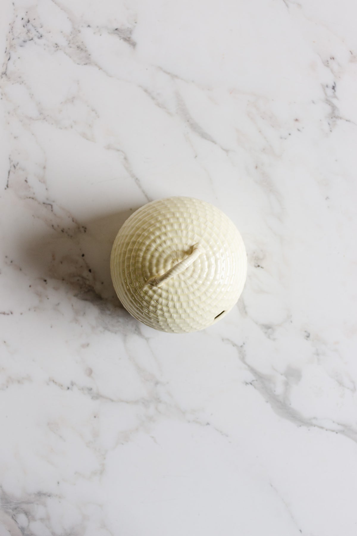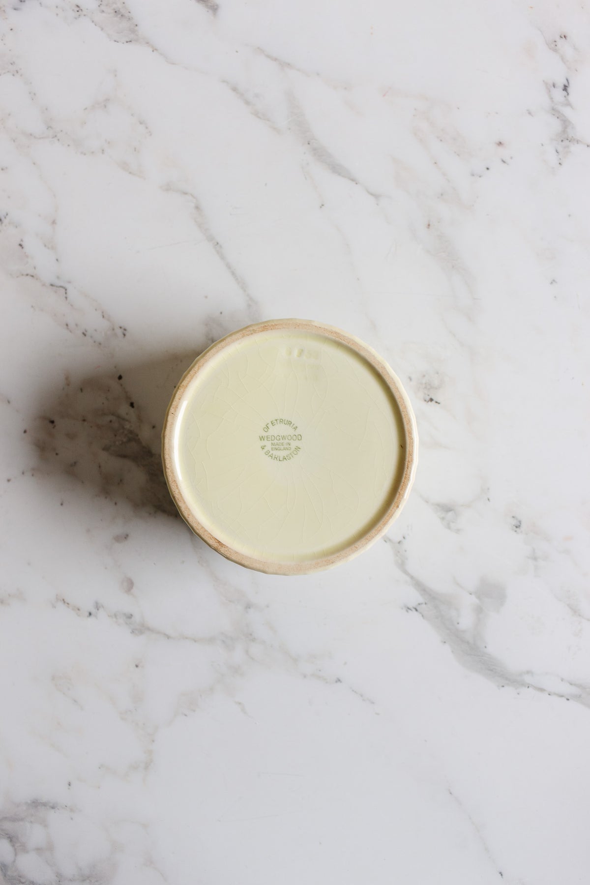 Timeless Wedgwood porcelain should be a part of any kitchen collection. This rare and highly sought after honey pot features a base with a domed lid that has a porcelain basketweave pattern. There is a slot where you can add a honey spoon.