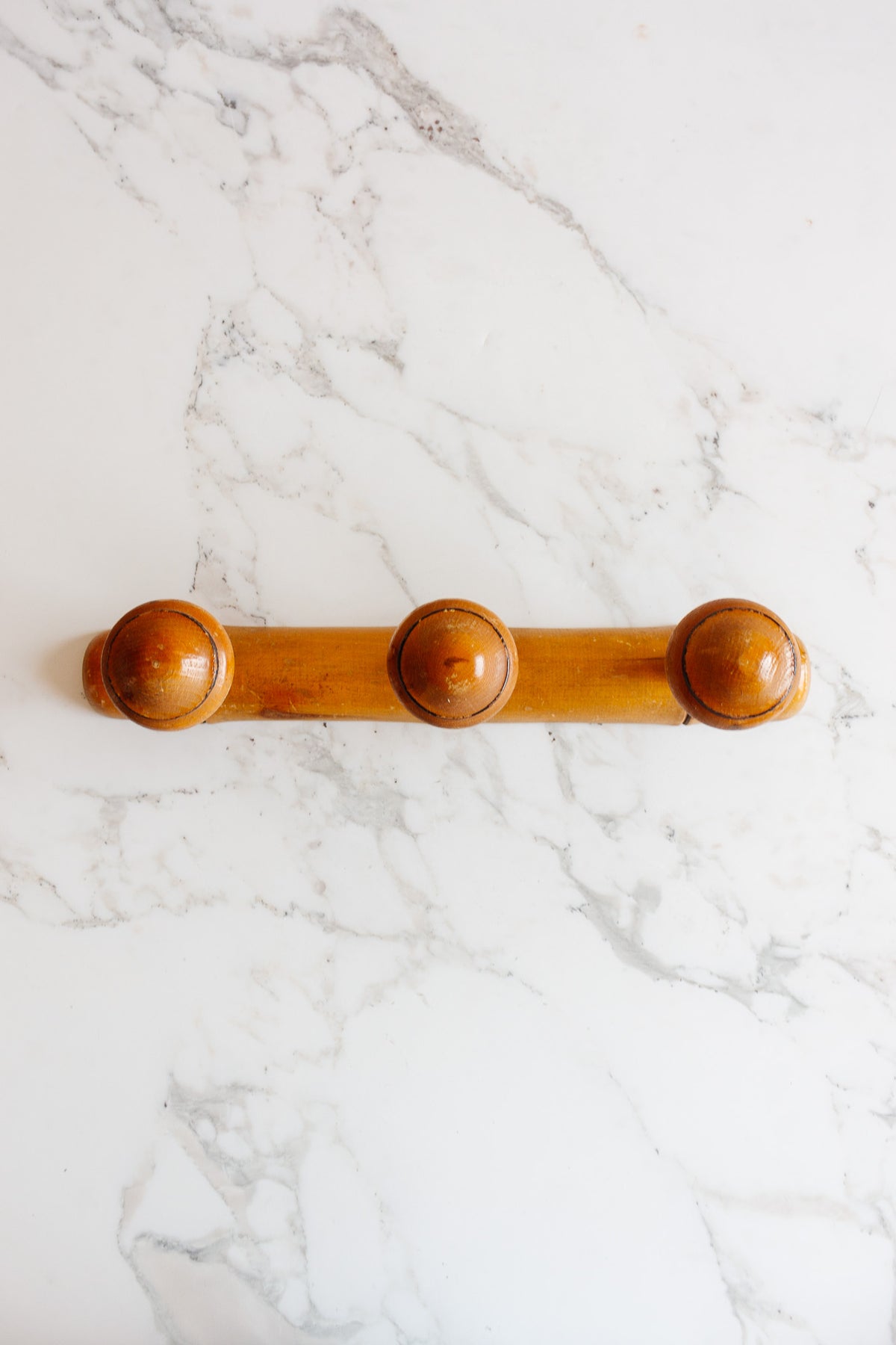Bamboo pieces were a favourite in French homes from the 1930s and into the midcentury and beyond—and it’s not hard to see why. This style of “faux” bamboo coat rack was a popular version, and made of hand carved wood. This set features 3 hooks and is in lovely antique condition.