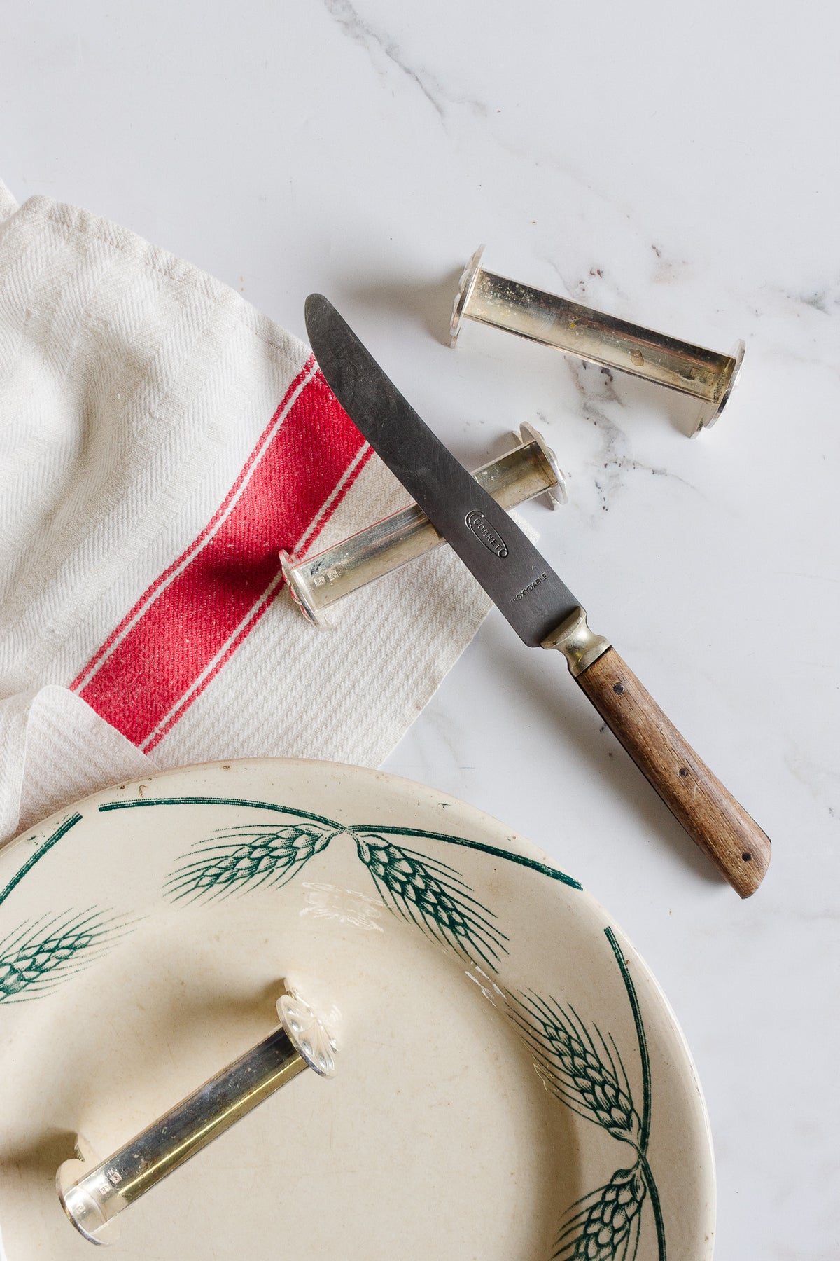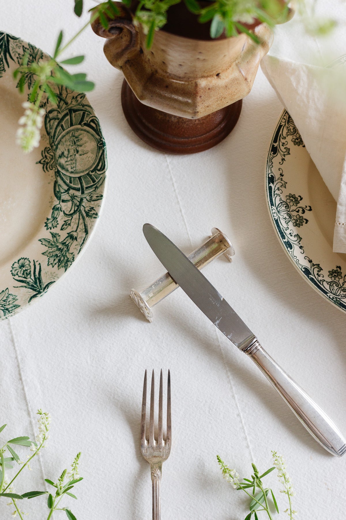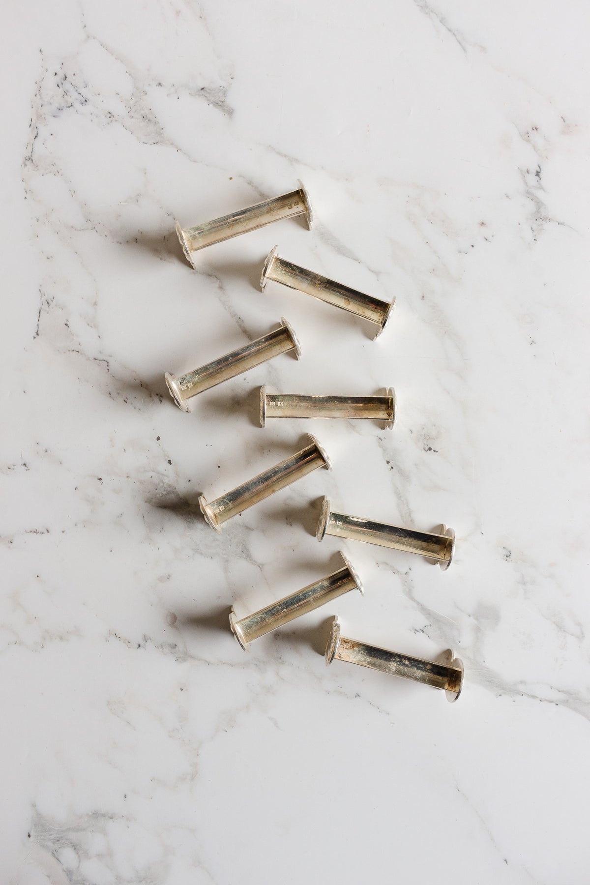 Set of 8 antique French silver-plated porte-couteaux (knife rests), each stamped with French poinçons (hallmarks) confirming their silver content and origin. Featuring elegant shell motifs on both ends, they reflect classic French design. Sourced from a private home in Marseille, these refined table accessories take your tablescape to the next level.