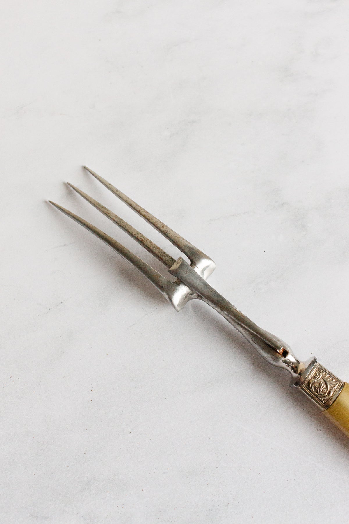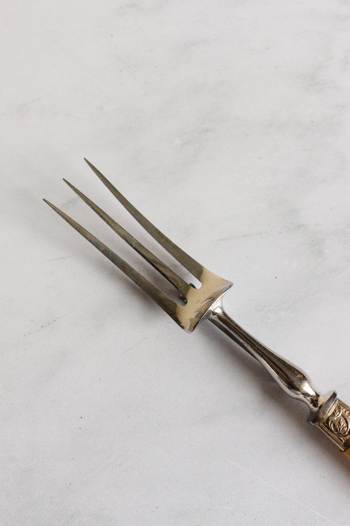 A stunning carving set made of silver plate, repousse silver details and horn handles. In very good antique condition and ready for your kitchen.