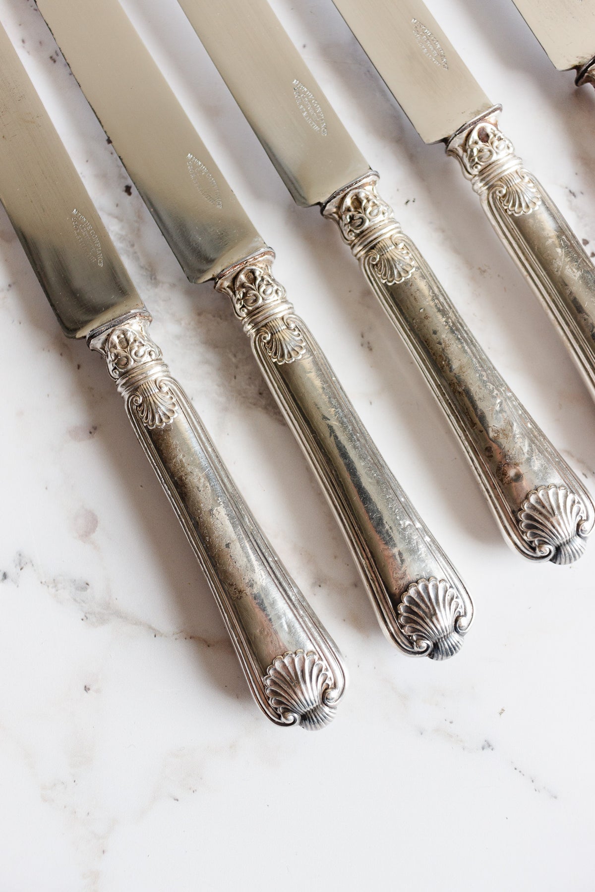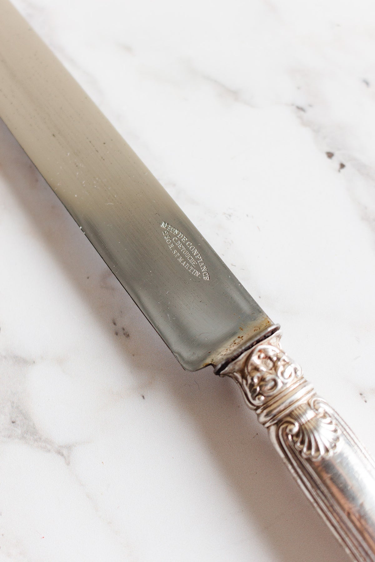 This rare set of gorgeously detailed silver plate knives was crafted at the turn of the century by famed French jeweller/clock maker/silversmith Constantin Detouche, and each blade is stamped with Detouche’s “Maison de Confiance” classic hallmark and firm address in Rue St Martin, Paris.
