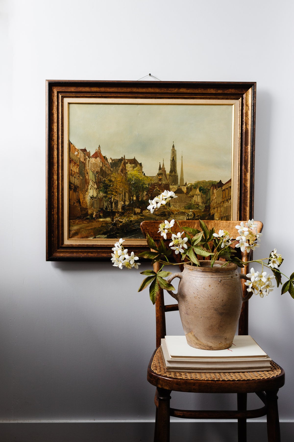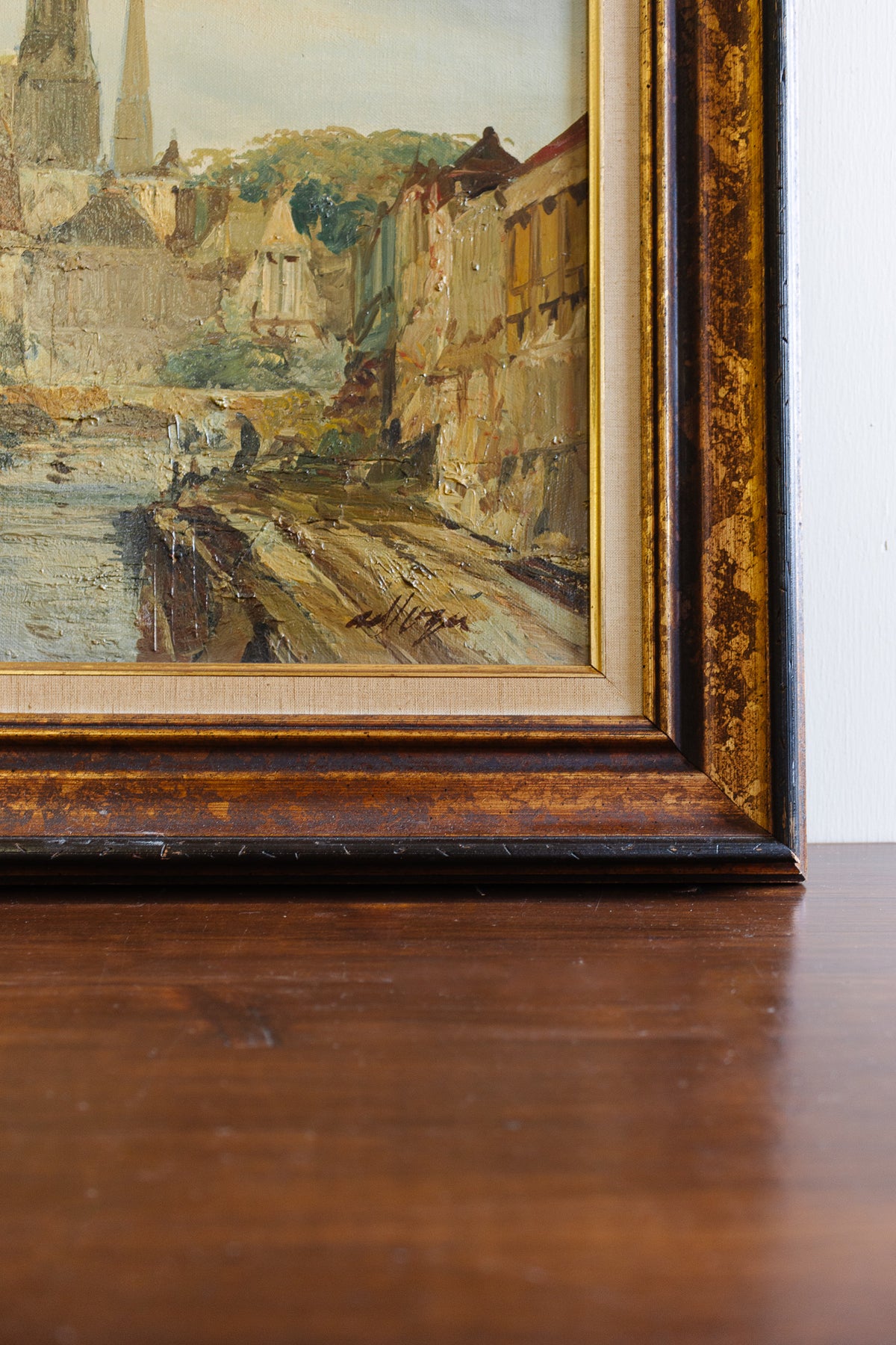 This exquisite oil on canvas depicts a charming European village. We love the moody colours and the large size of this piece. Sourced from an estate in Normandy.