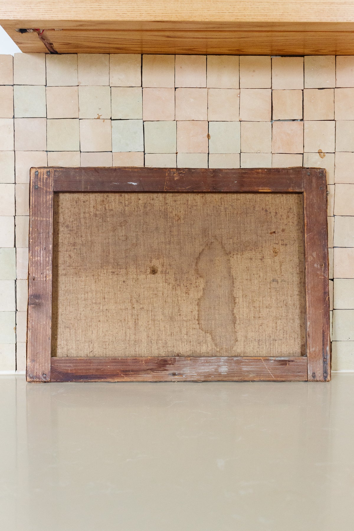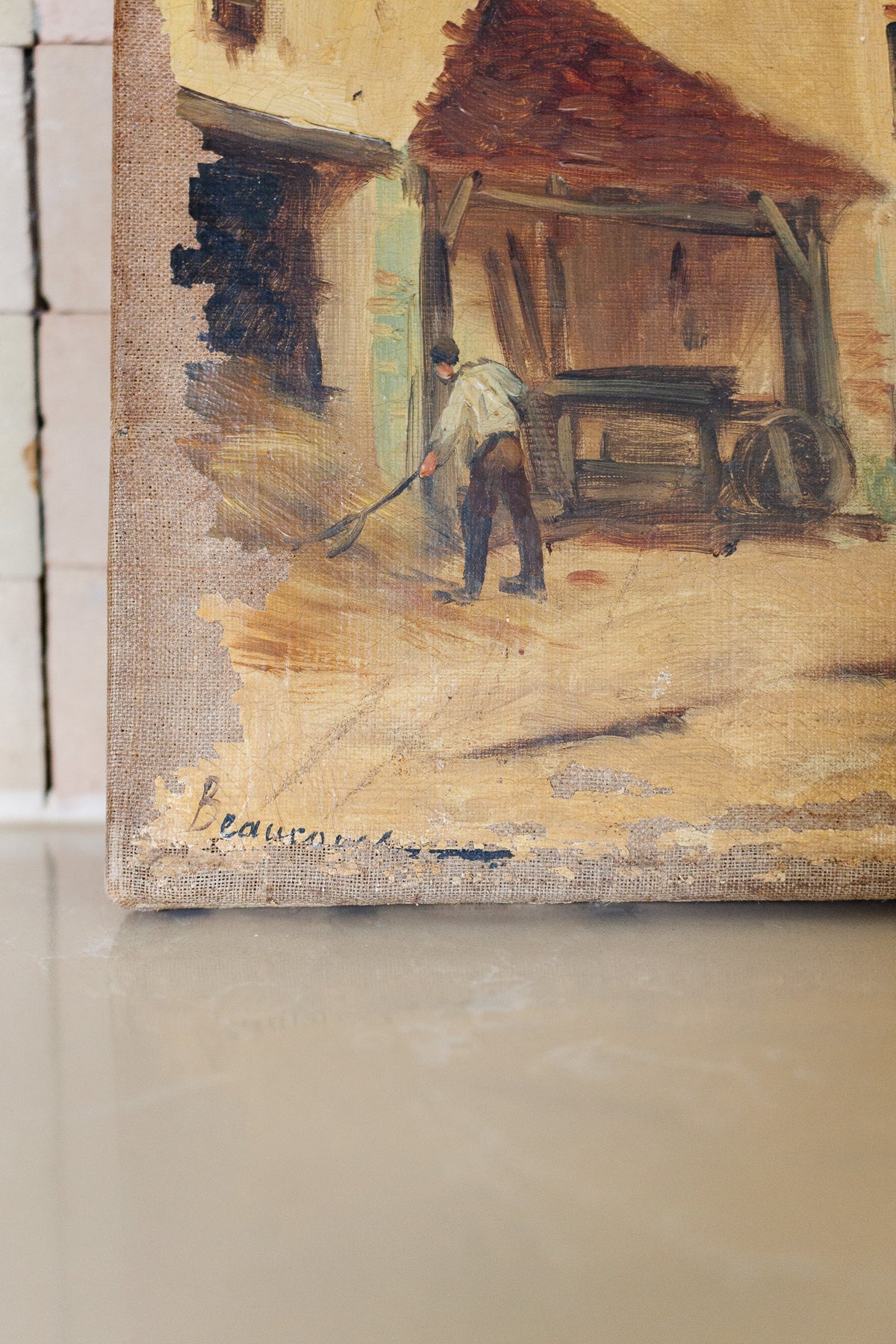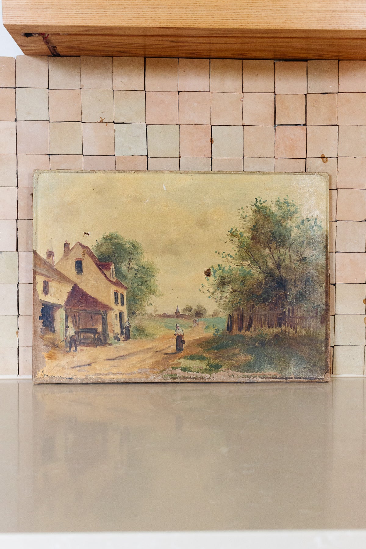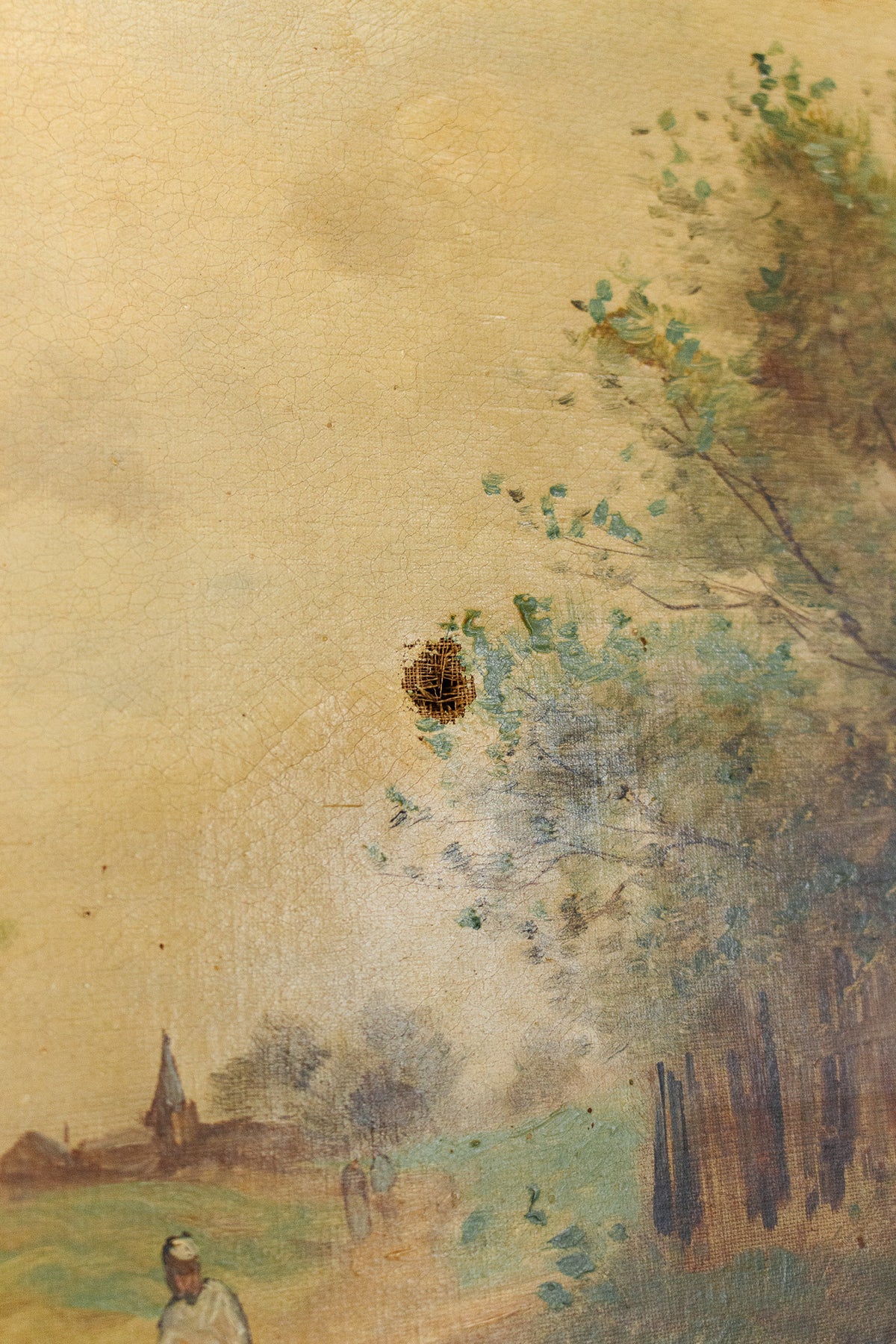 This antique French oil on canvas has soft colors, wear and imperfections to the canvas, including two small tears as pictured, and a small peek left of the artist's signature.