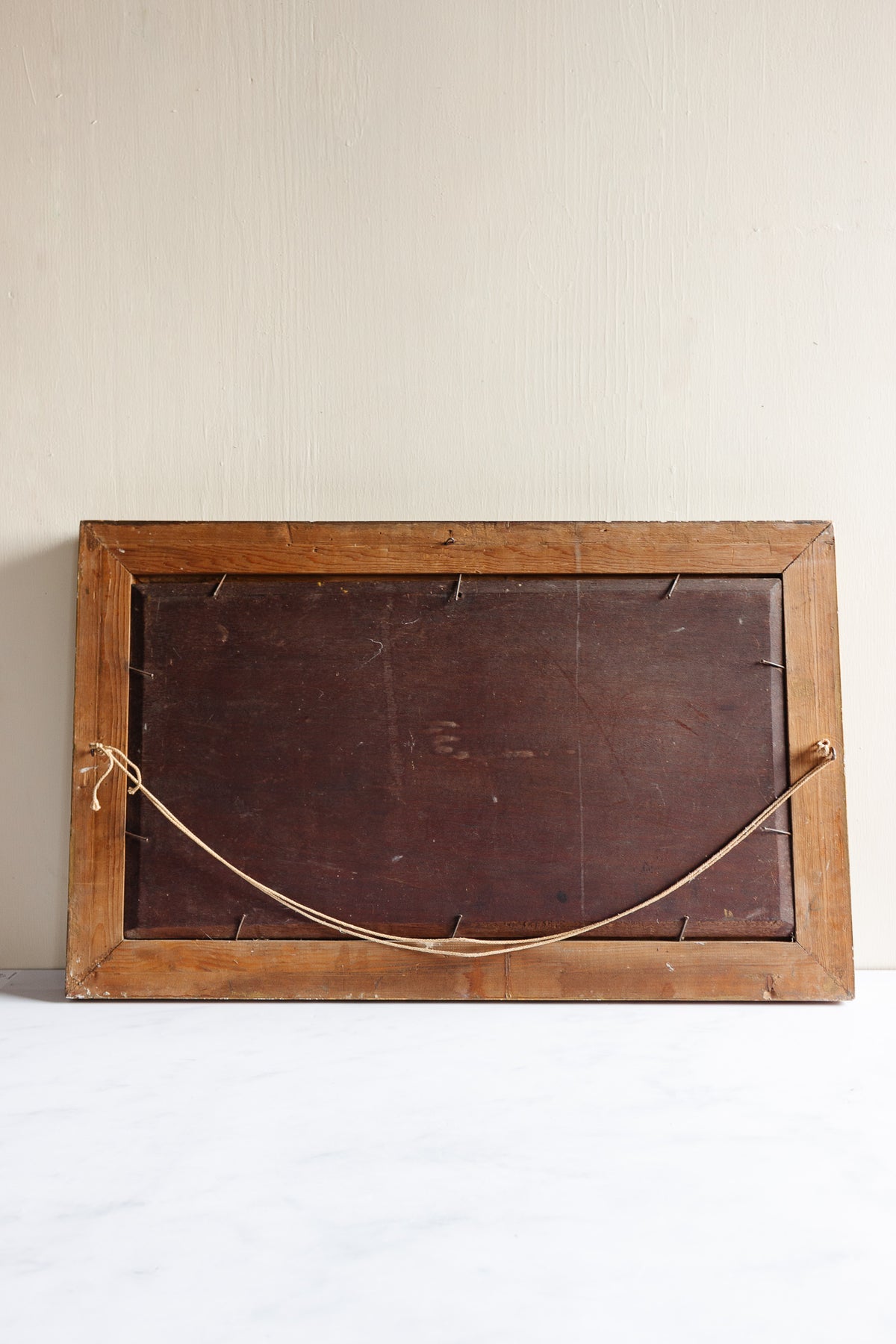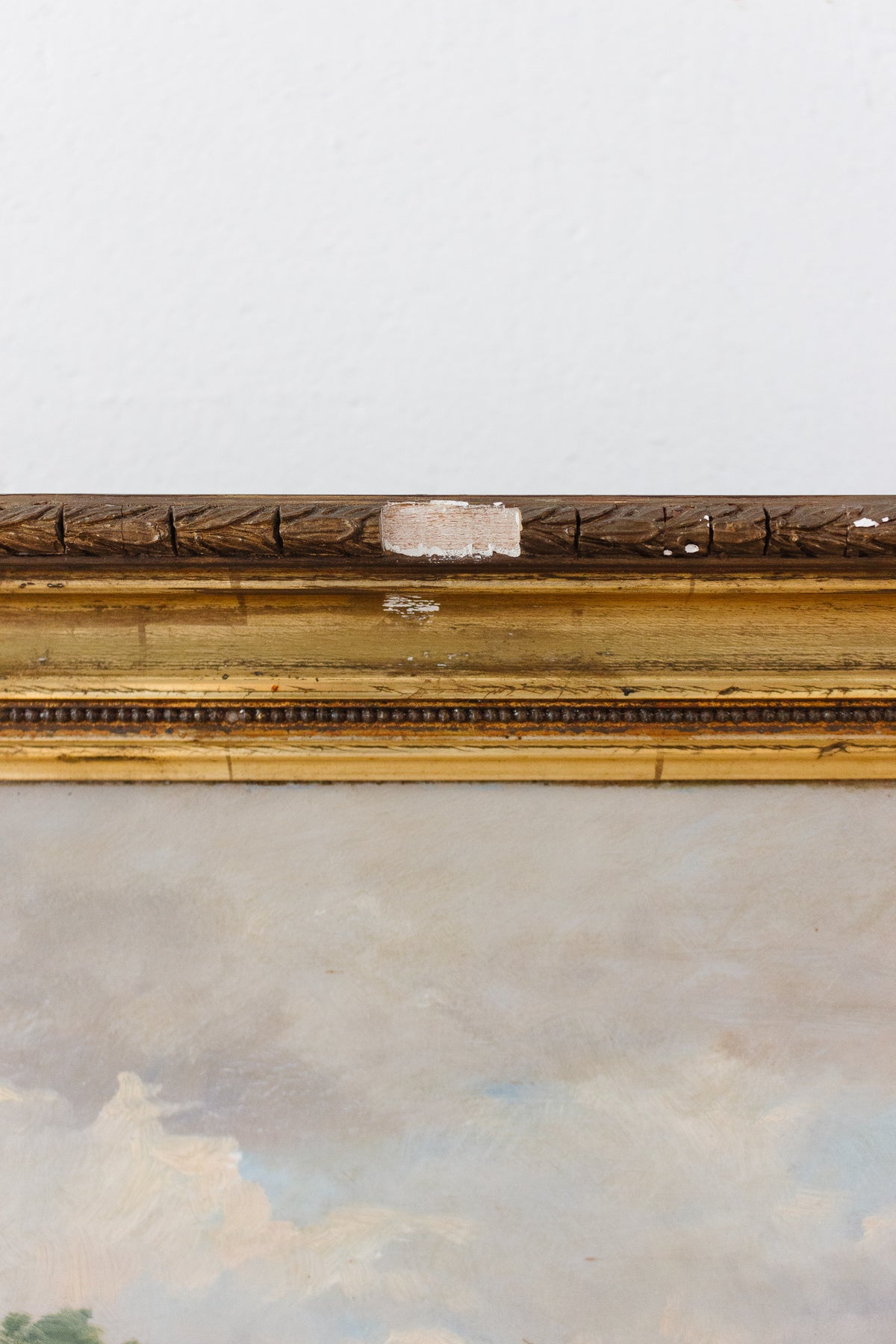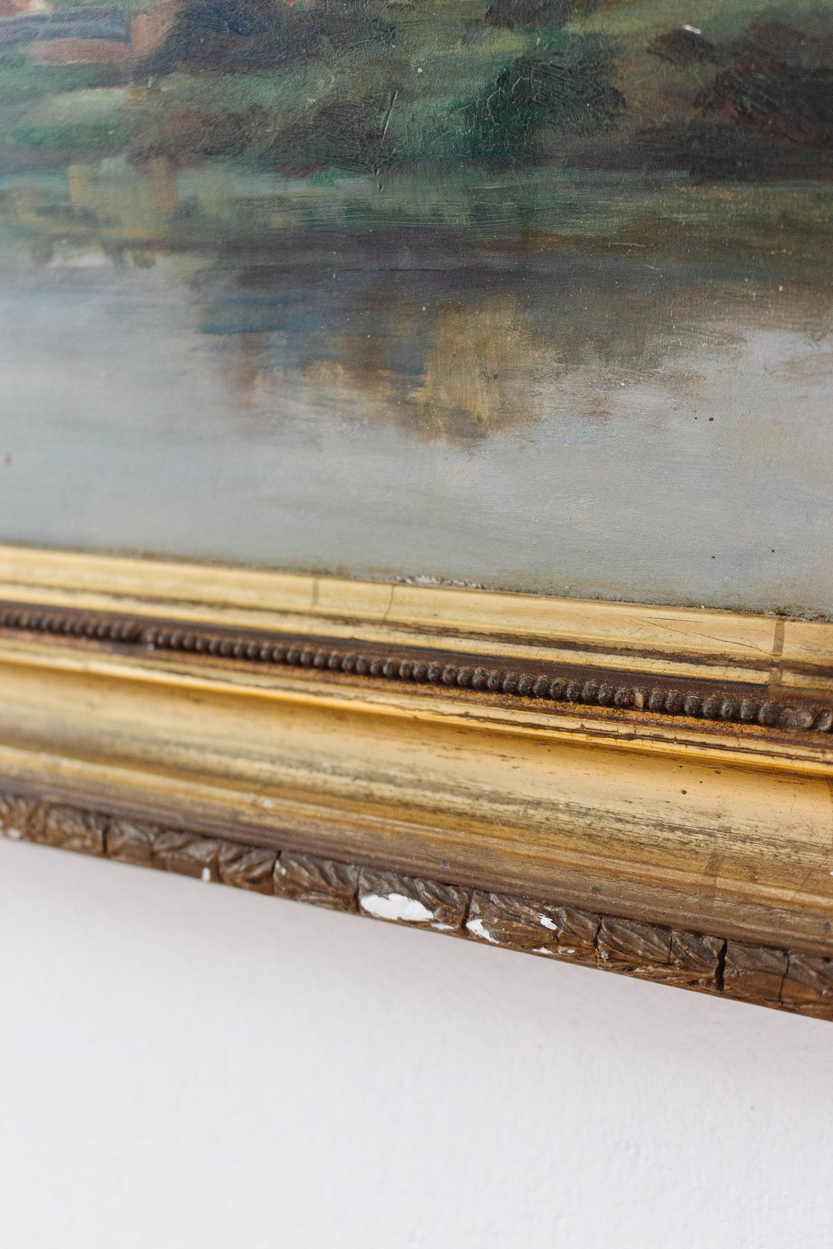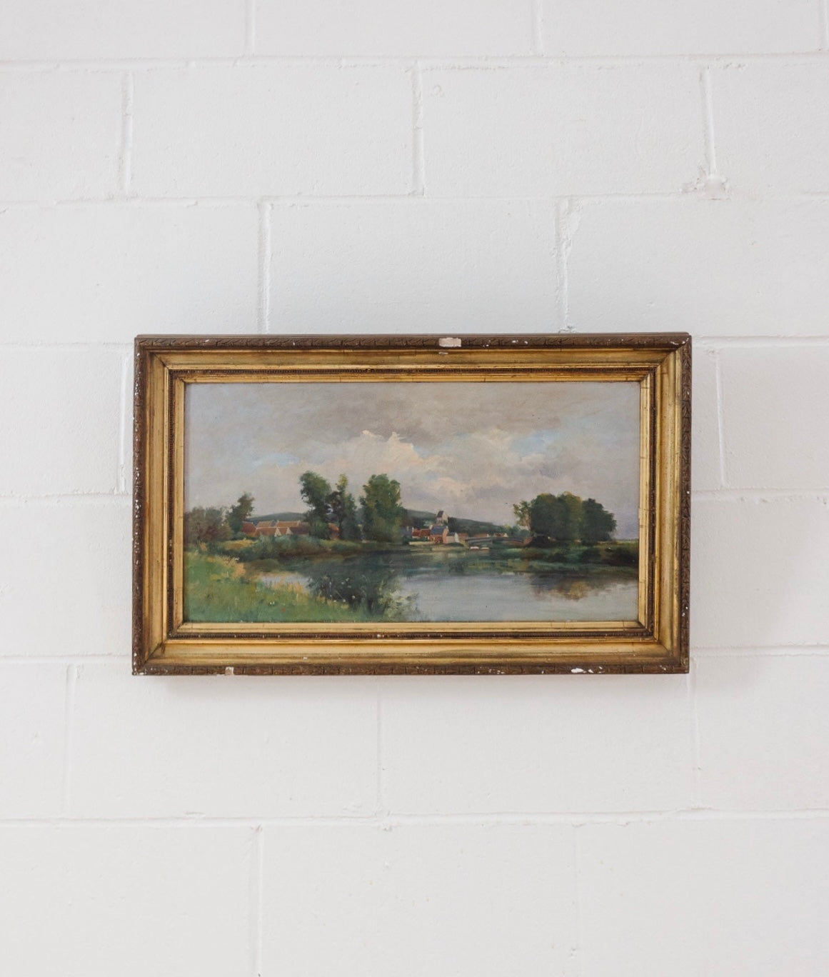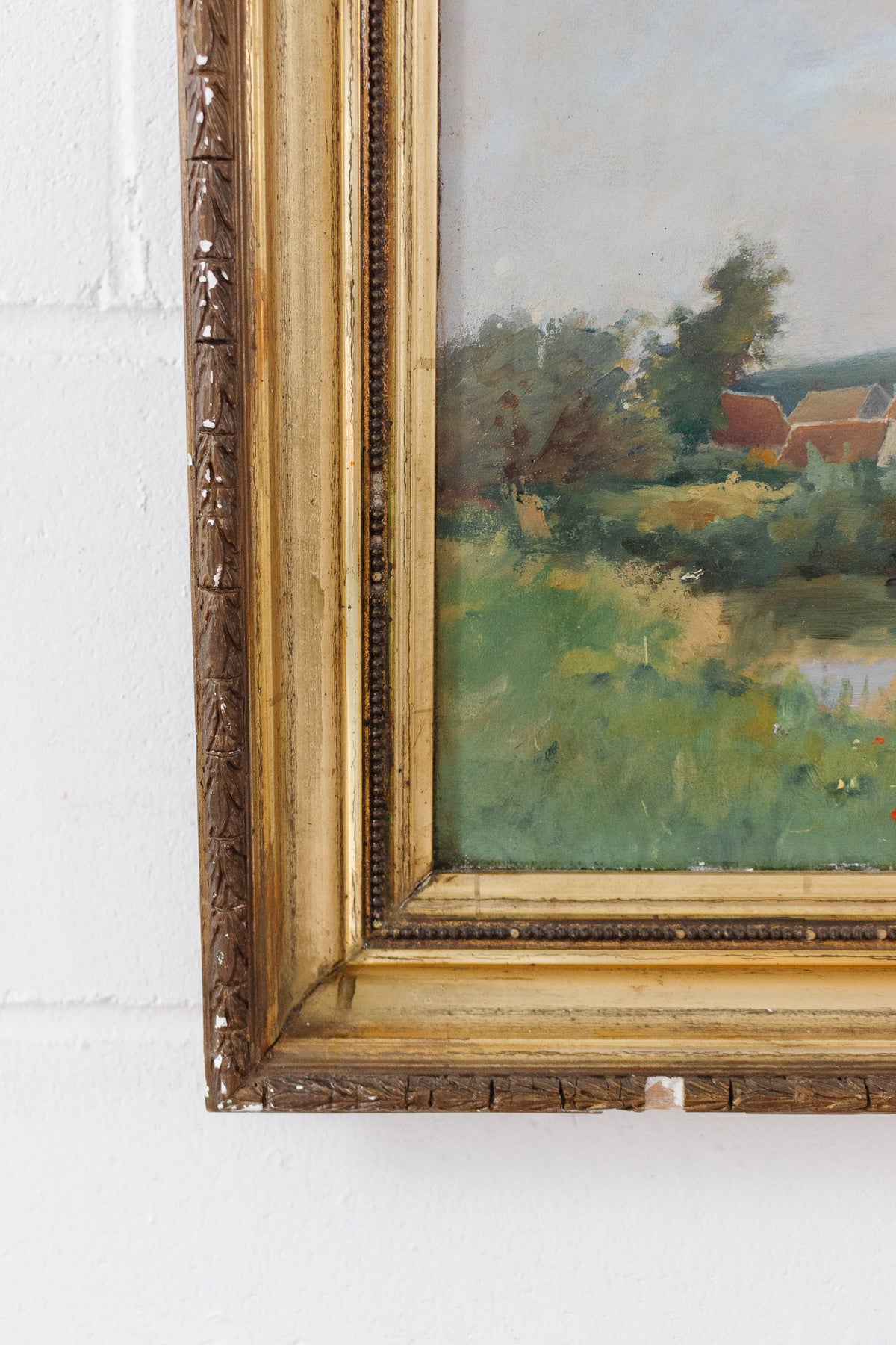 Antique French oil on board, framed in original, beautifully worn, carved gilt wood frame as shown.