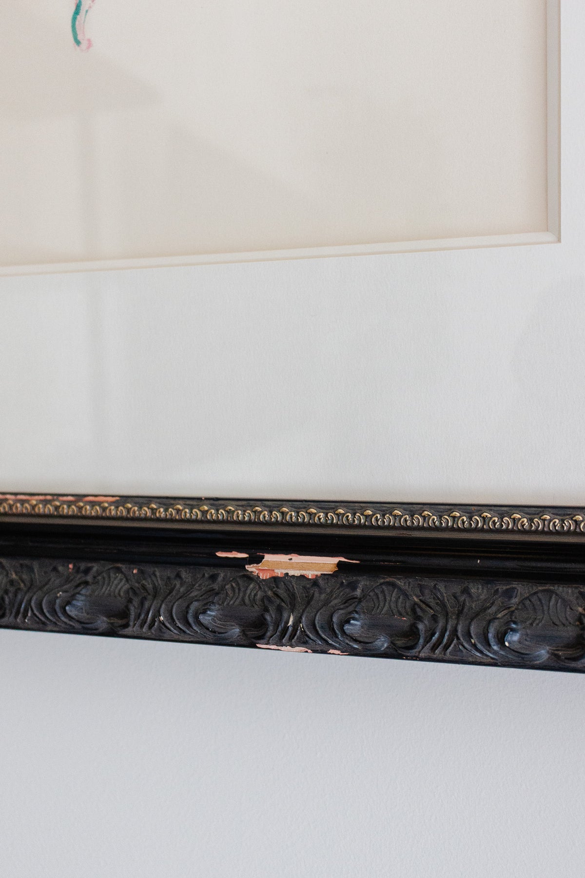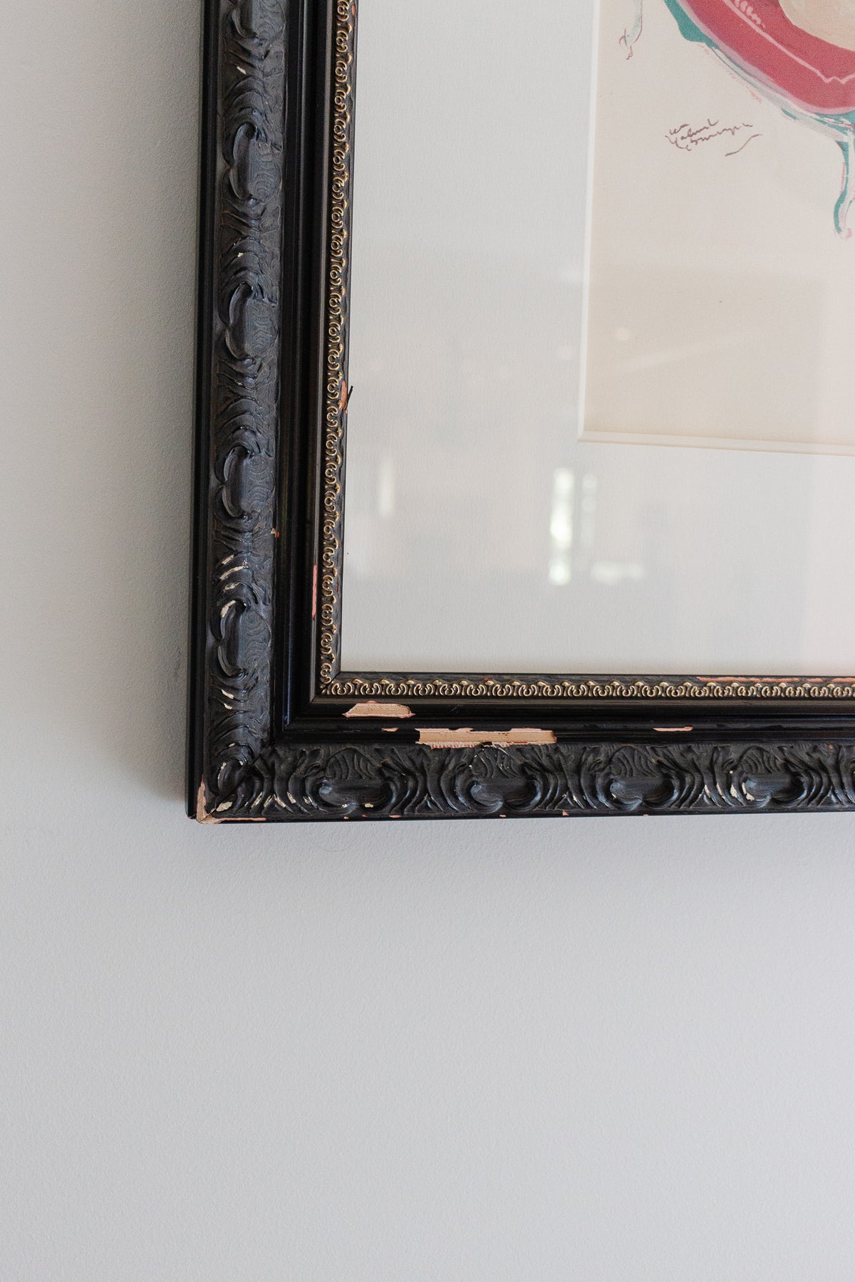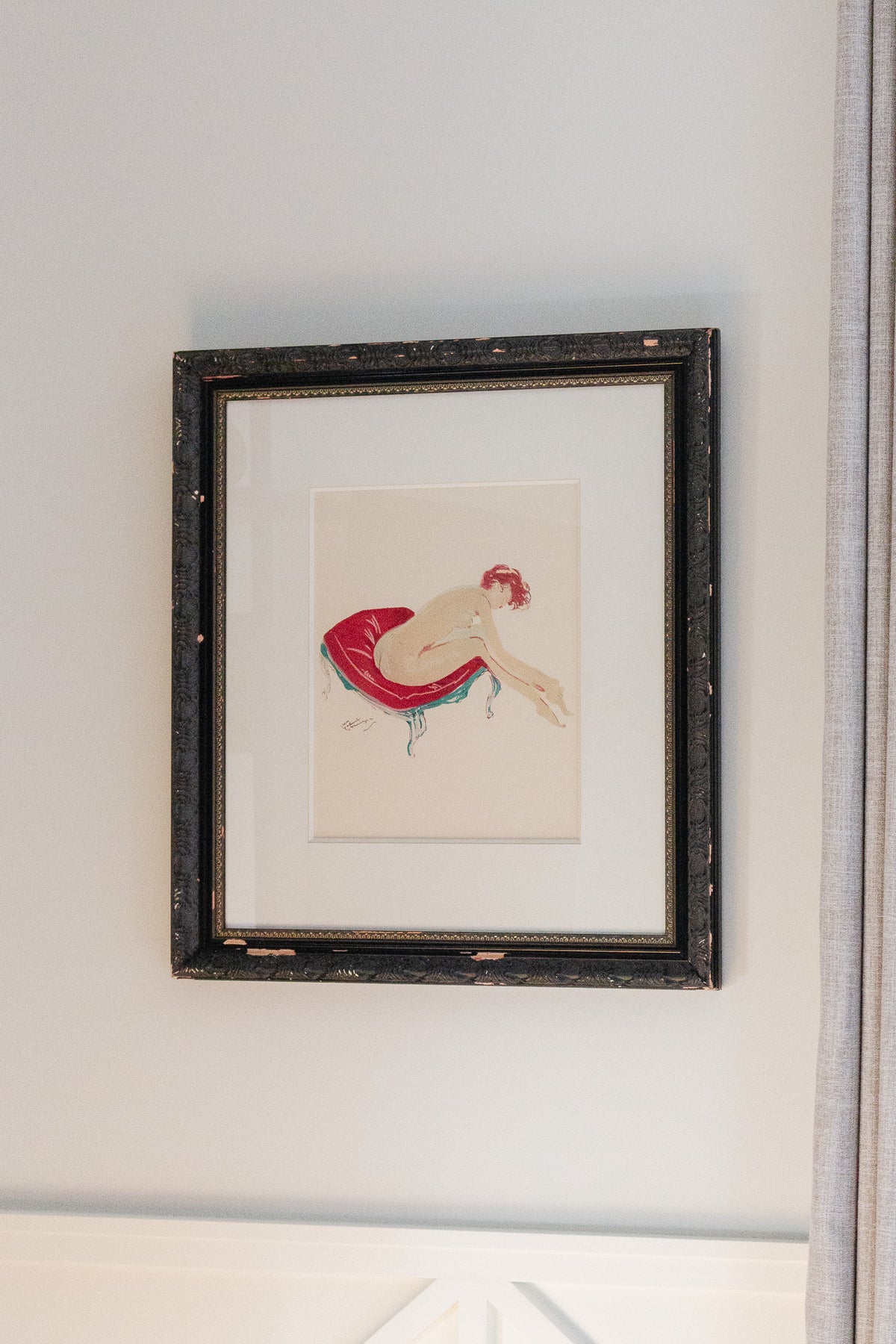 The lithograph is housed in an antique wood and plaster frame, whose gentle wear and ornate detailing beautifully complement the artwork’s refined character. Sourced from a brocante in Marseille, it stands as both a piece of fine art and a glimpse into the cultural sophistication of mid-century Paris.