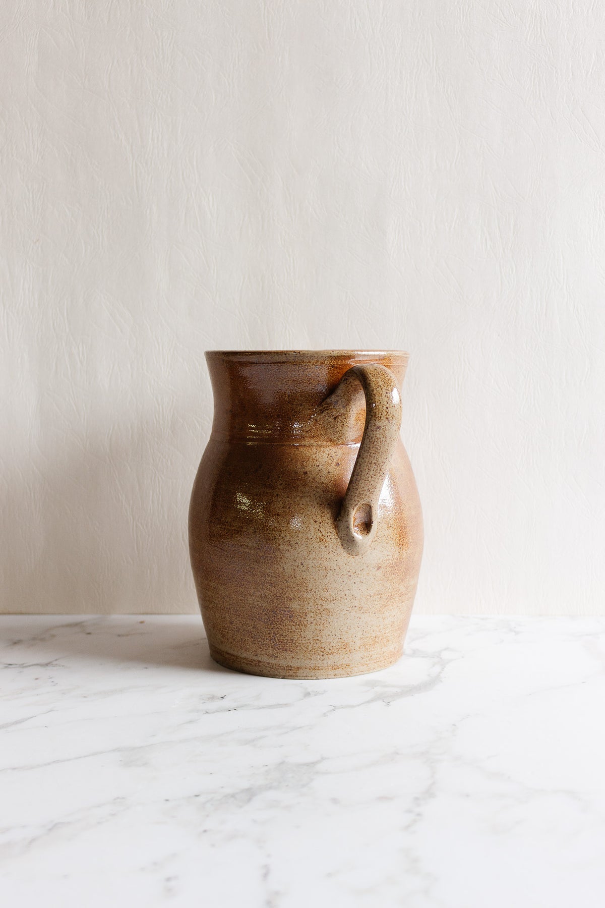 A large vintage French stoneware pitcher, sourced from a brocante in Marseille, and showcasing the understated charm typical of traditional French pottery. The neutral-toned glaze highlights the natural texture of the clay, giving it a grounded, rustic presence. Its generous size and simple form make it both practical and sculptural.