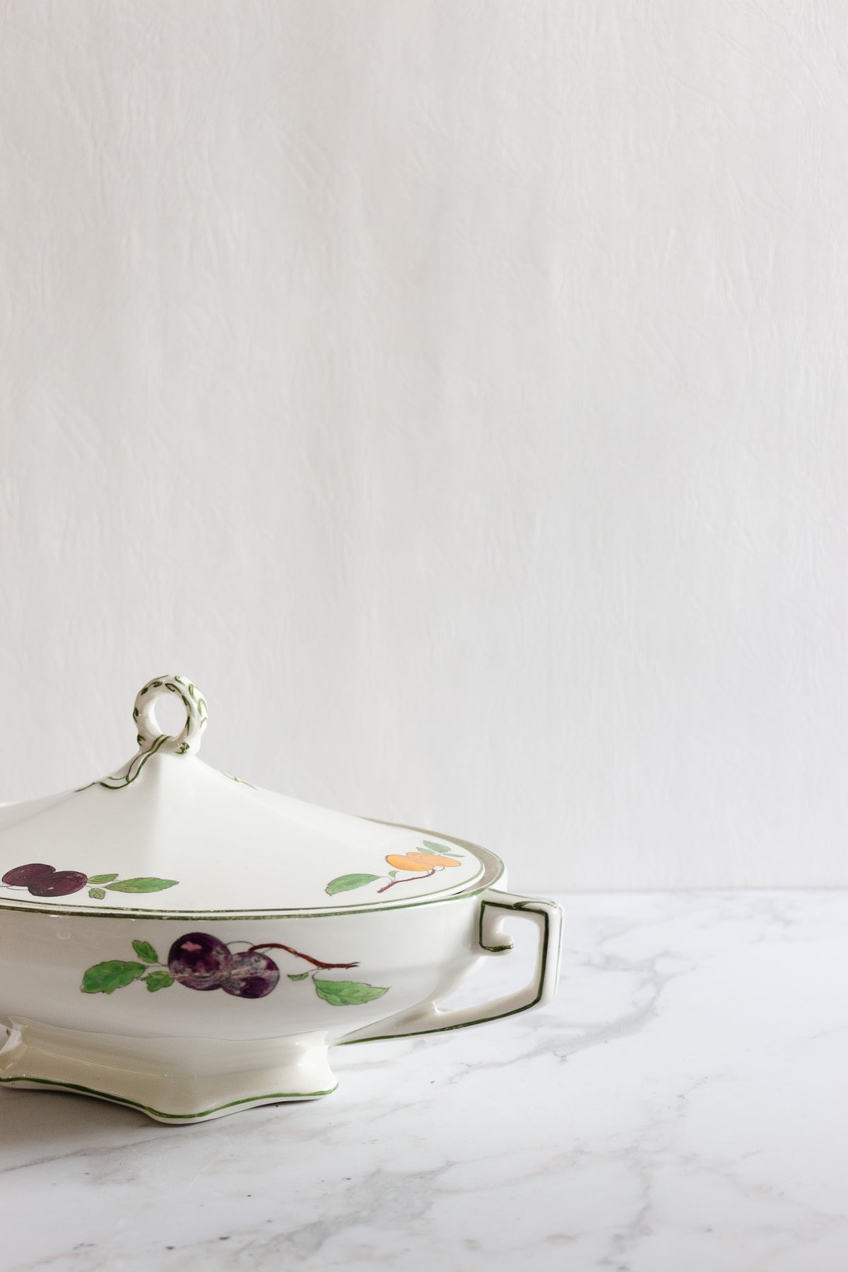 Elegant covered vegetable dish by Grindley & Co, in excellent vintage condition. Designed for serving vegetables at the table, this versatile piece also works beautifully as a centerpiece for side dishes, soups, or stews. Beyond the dining room, it can be repurposed as a unique vessel for fresh fruit, wrapped sweets, or even as a decorative accent on a sideboard, filled with seasonal greenery or potpourri. A timeless piece that blends practicality with vintage style.