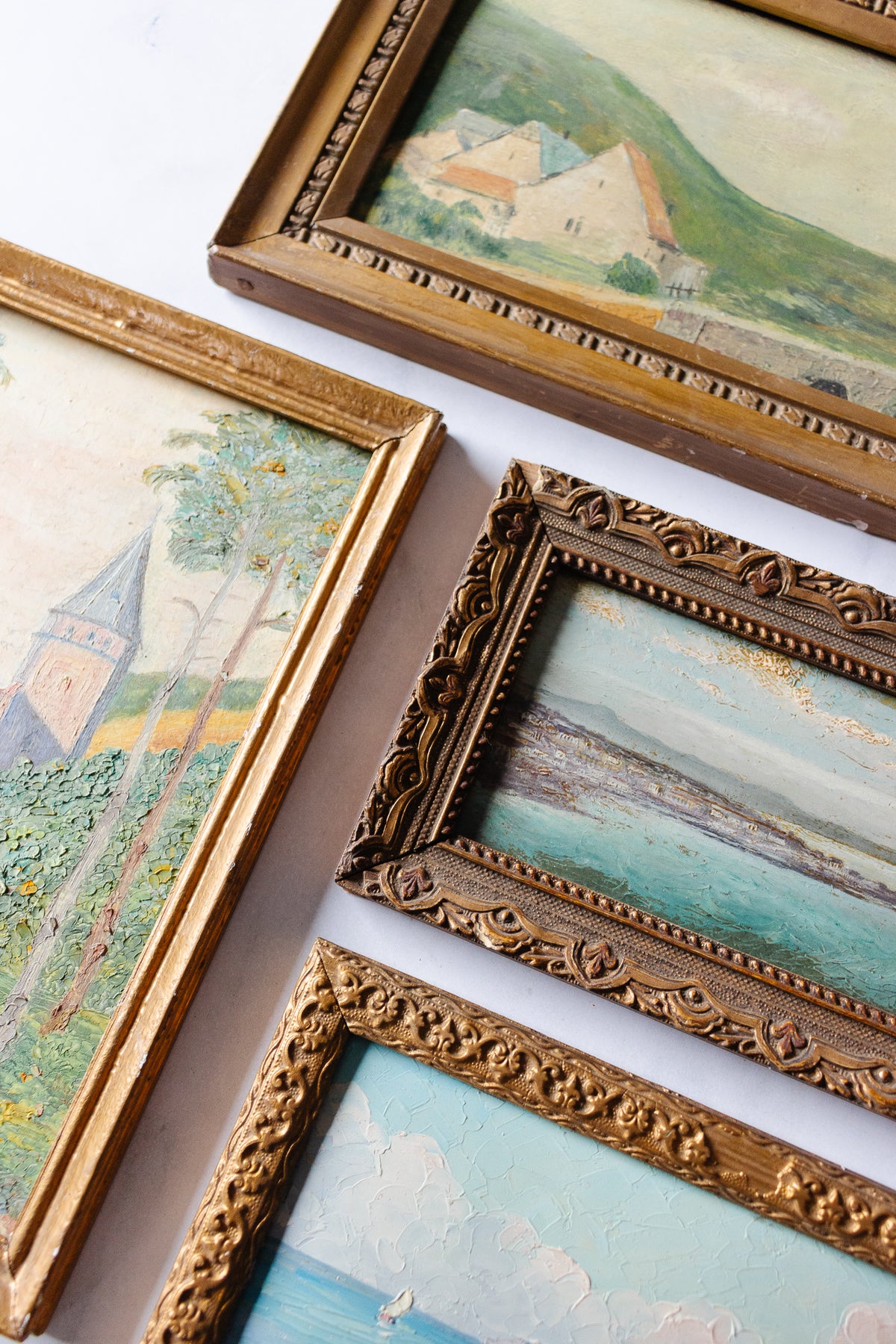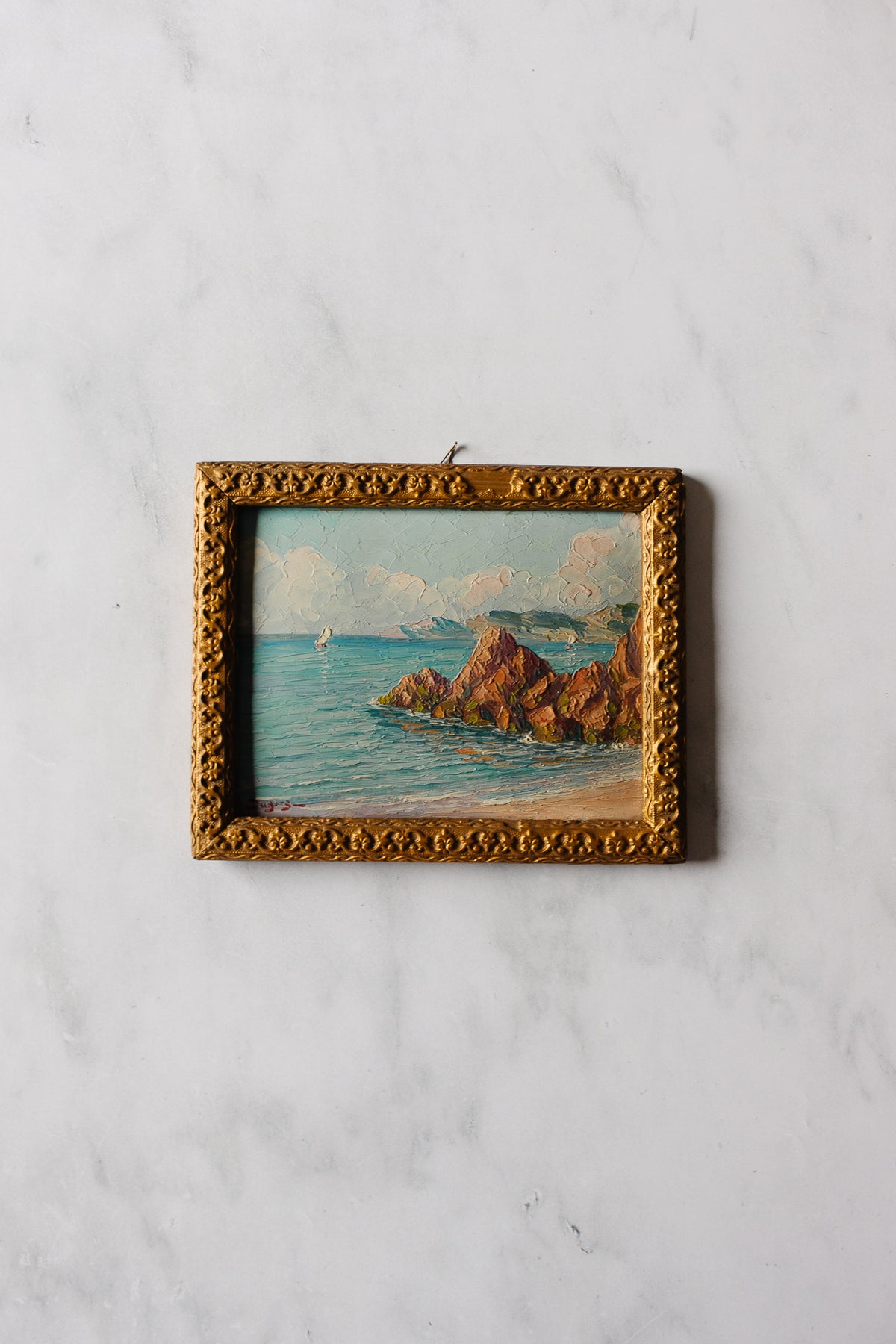 Antique French petite oil on board, signed by the artist and framed in original gilt wood frame as shown.