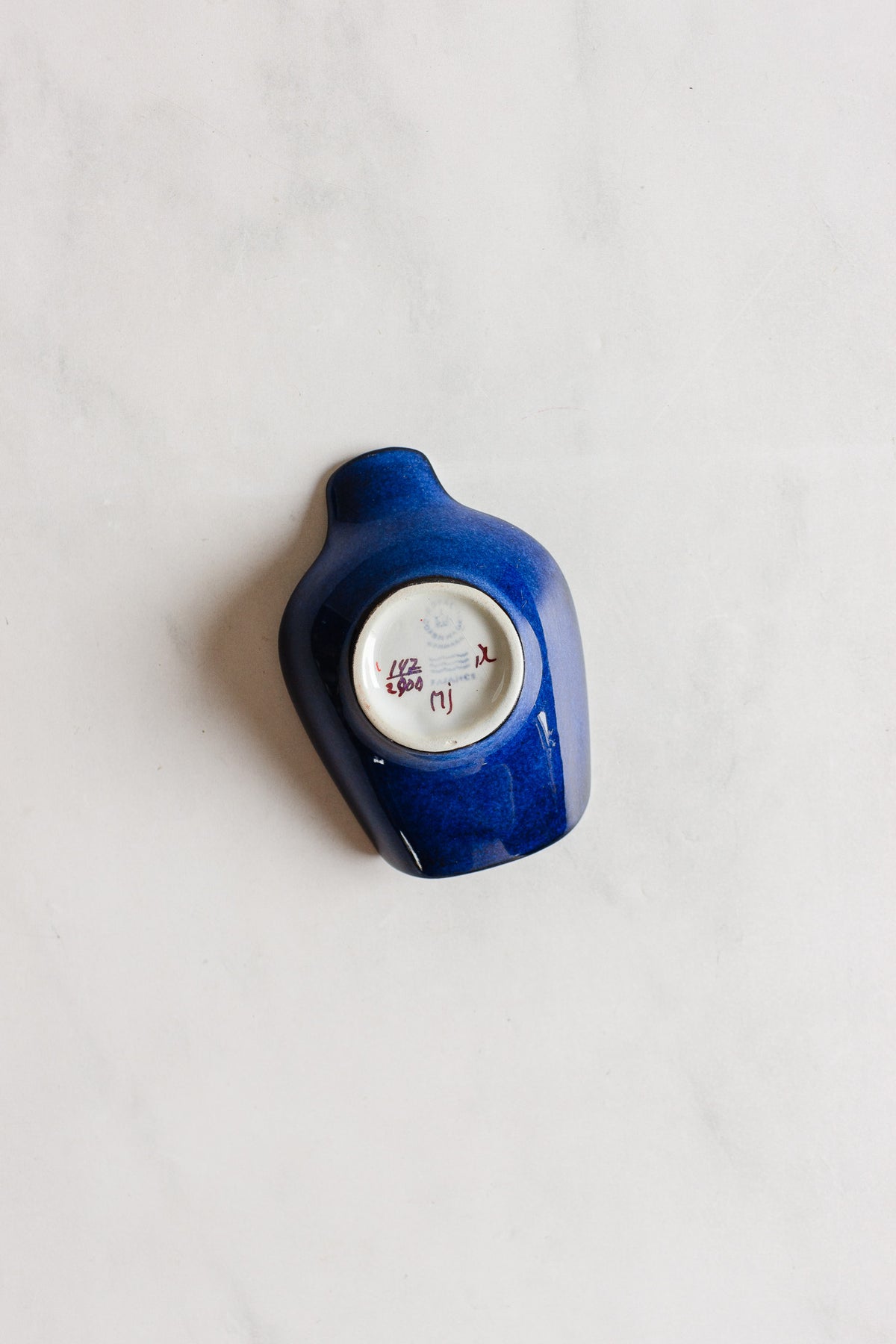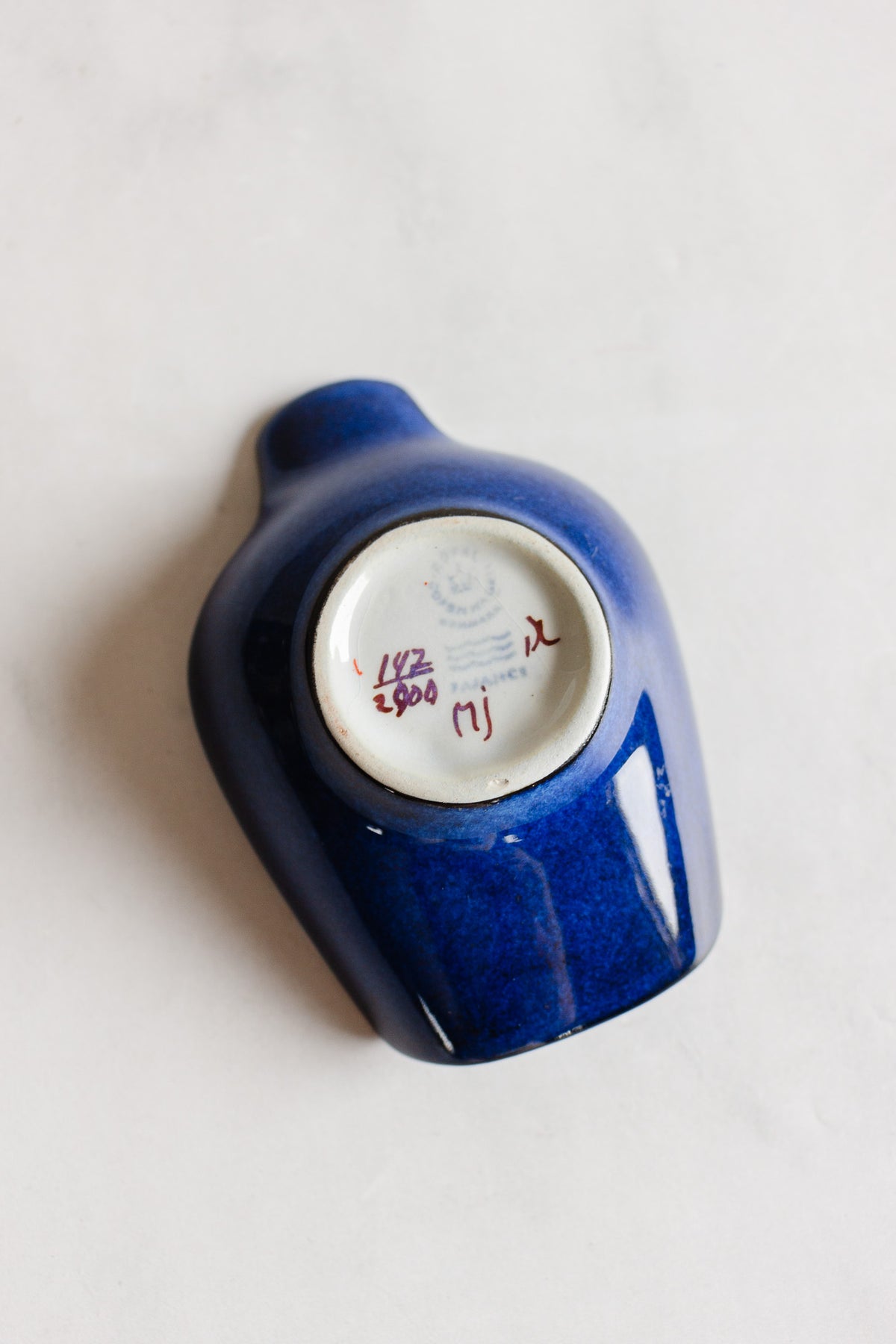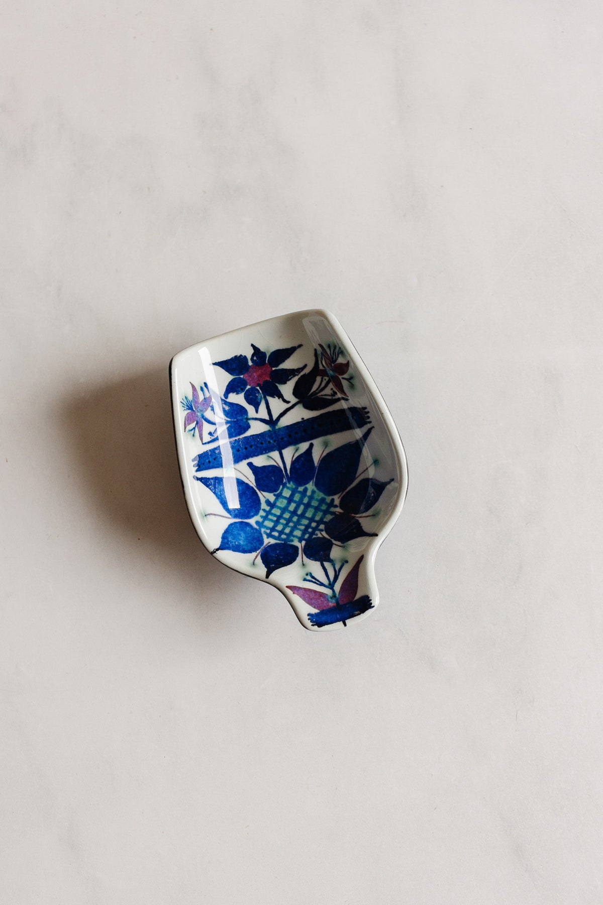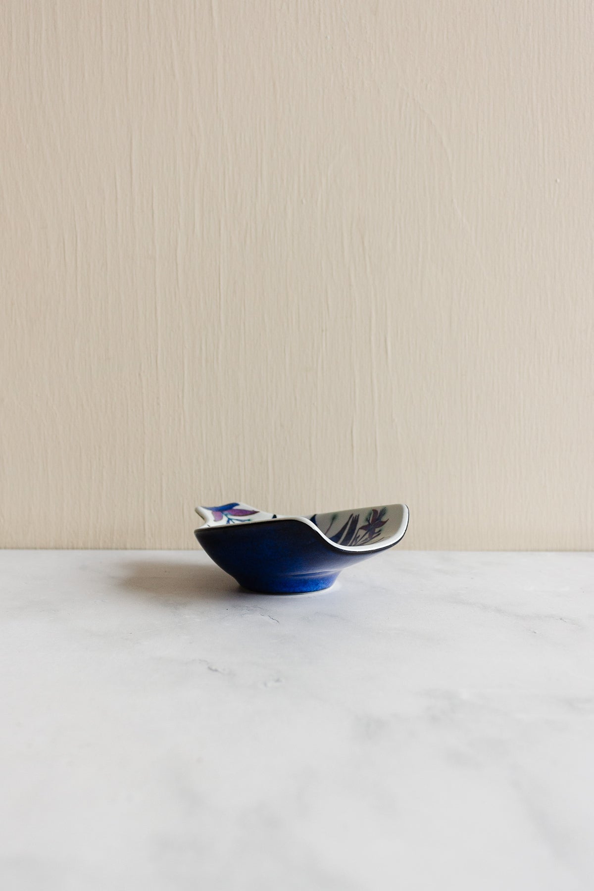 Artist Marianne Johnson crafted this porcelain spoon rest/trinket dish, featuring an eye-catching floral design. The base is in a rich dark blue, and it bears the Copenhagen Hallmark with "Fajance," a hand-painted edition number "147/2900," the designer's initials "MJ" for Marianne Johnson, and a decorator mark "W". Use as intended or use to hold.your jewelry,  change, or curiosities.
