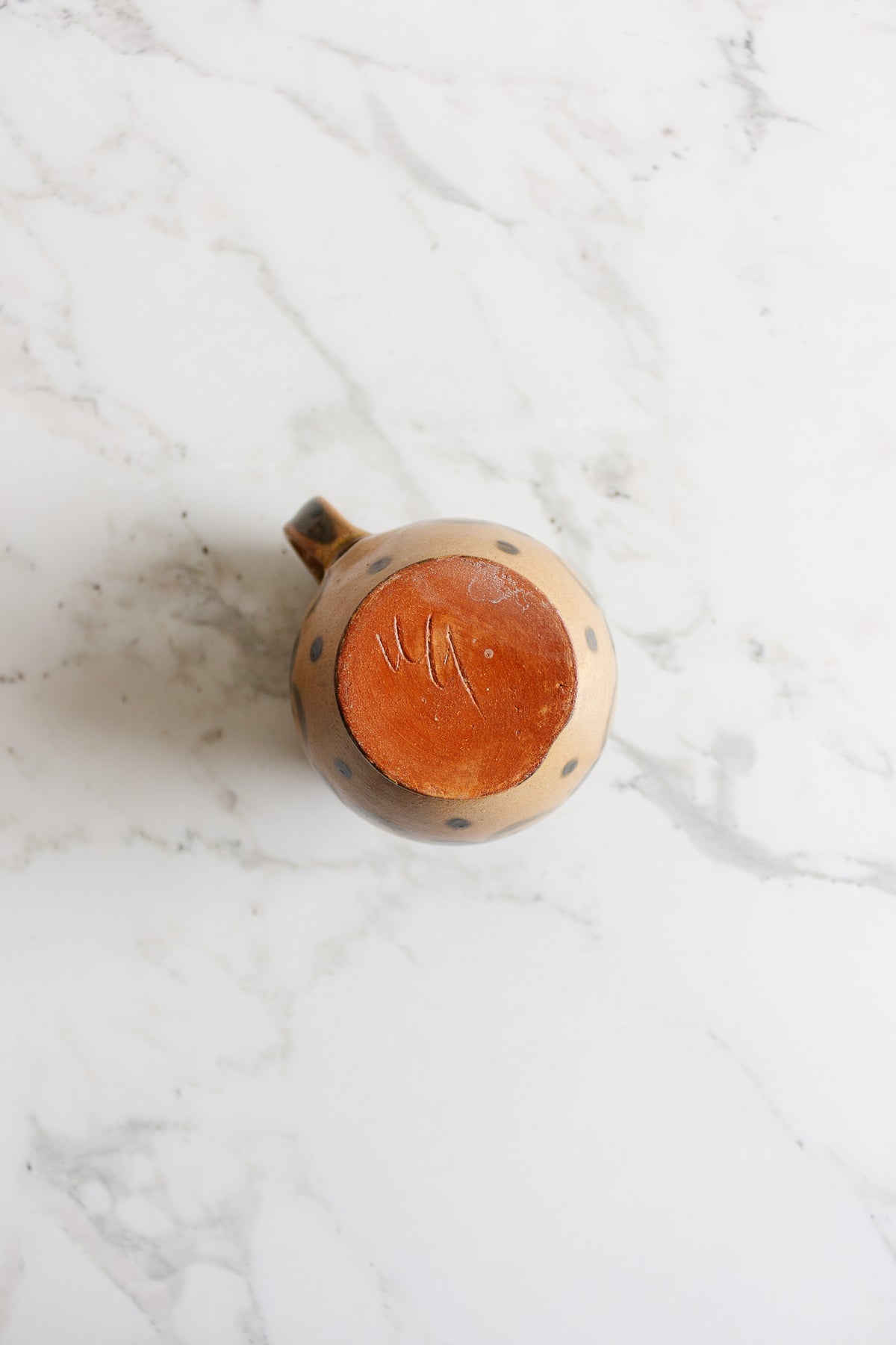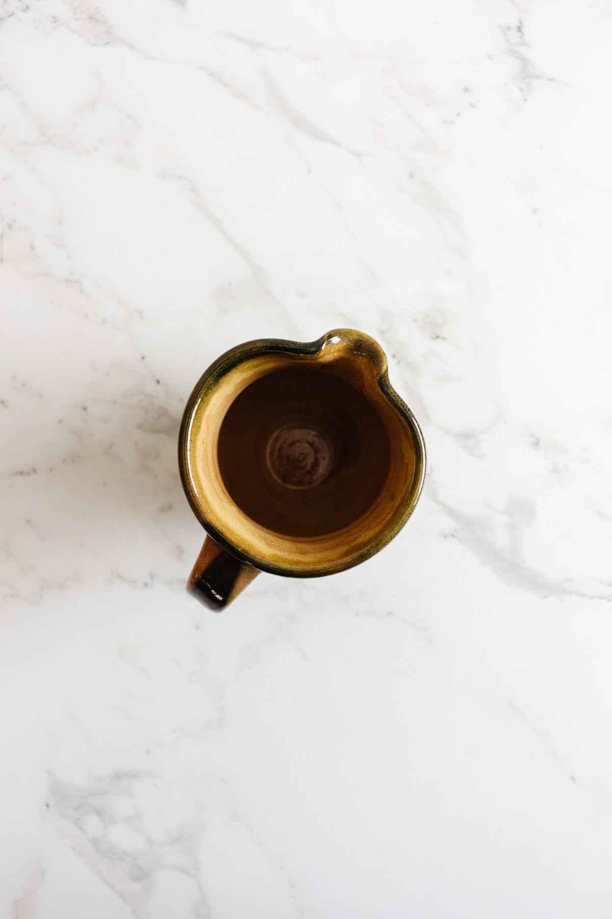 A vintage French pottery pitcher, handmade by a regional artisan and sourced from a brocante in Marseille. The form is slightly irregular, reflecting its hand-thrown nature, with a sturdy handle and a simple spout designed for everyday use. The glaze reveals subtle tonal variations that highlight the clay beneath—earthy, tactile, and full of character.