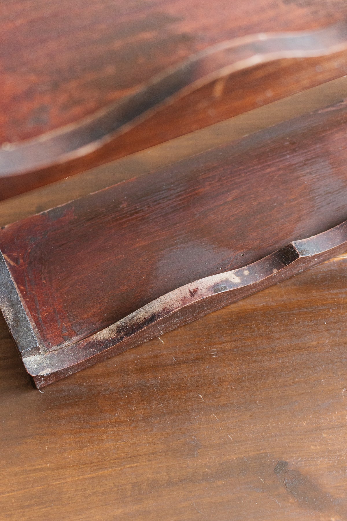 A solid wood shelf in a beautiful dark shade.ideal for the kitchen. Style with spices, glasses, or.pink decanters. Sourced from a brocante in Marseille