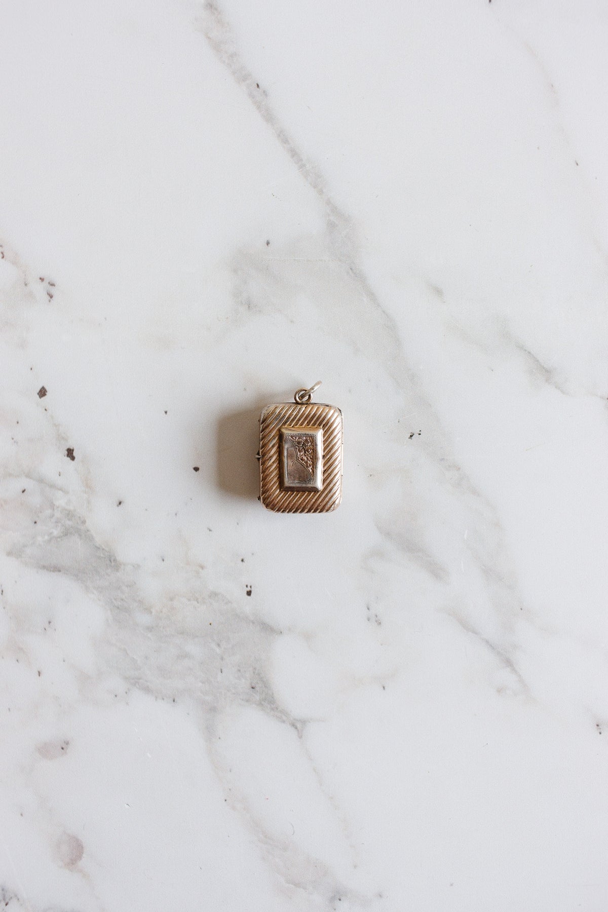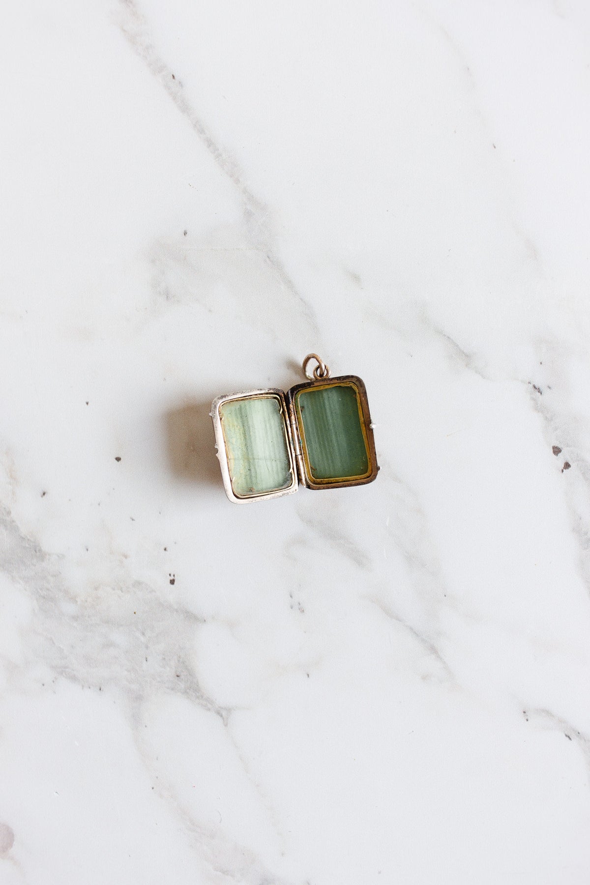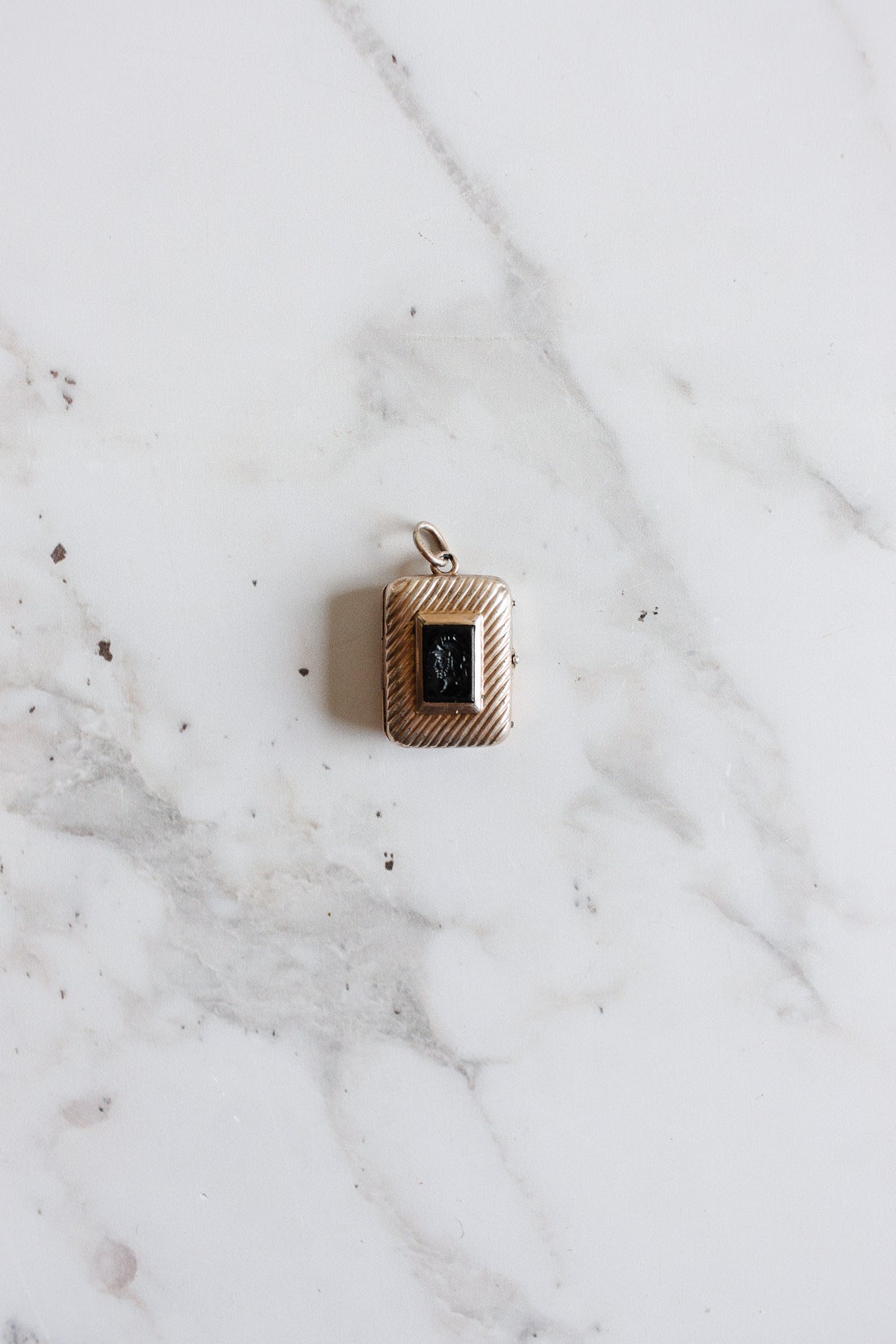 This exquisite locket opens to reveal space for two photos. The exterior is likely gold plated, with a rich obsidian stone with a carved soldier profile, known as an intaglio. These intaglios were used as a signature to stamp wax seals on letters and written communication. A true heirloom gem to add to your collection.