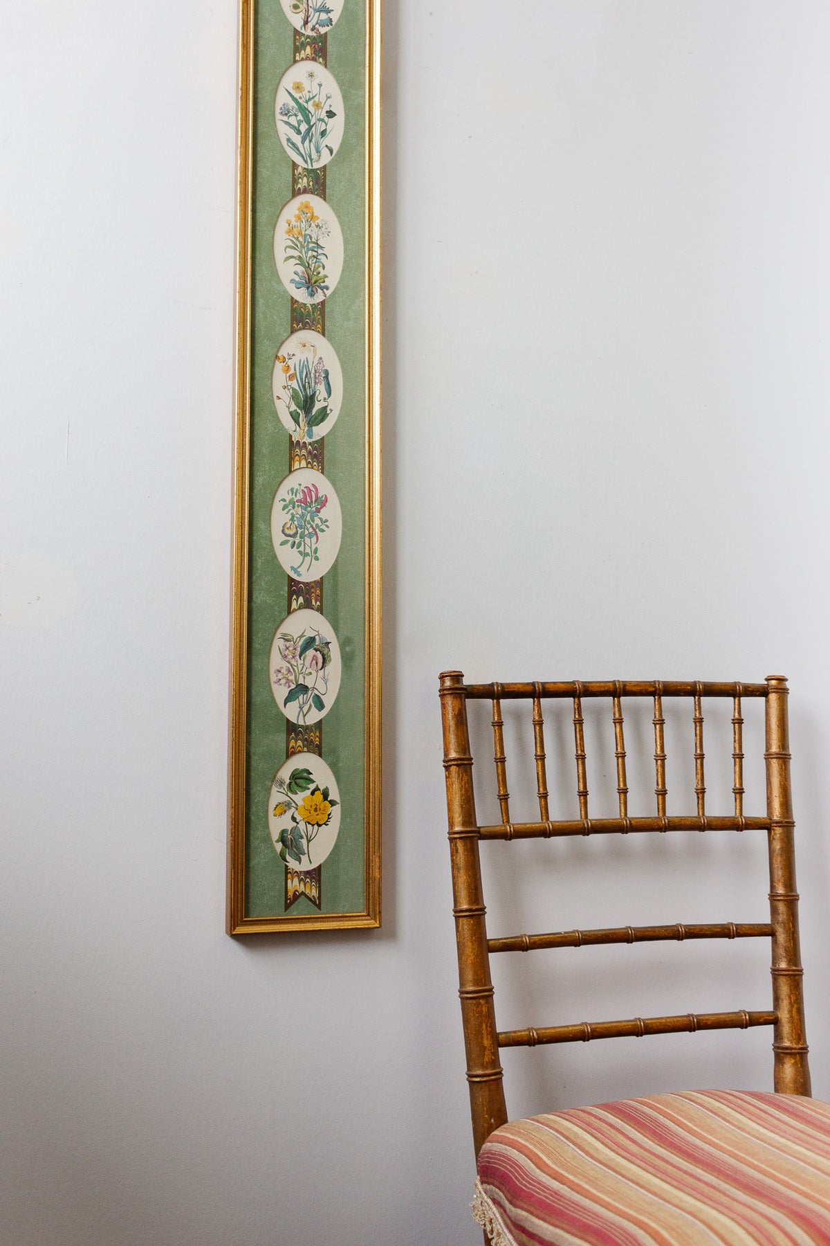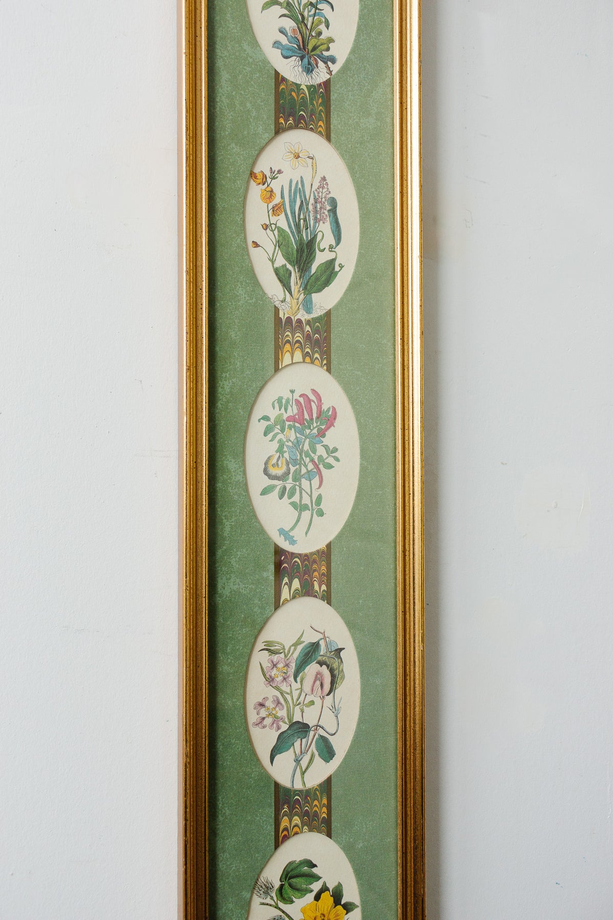 We were drawn in by the impressive shape of this vertical piece circa 1970s. Featuring multiple floral prints, beautifully matted and framed, this unique piece of art is perfect for those narrow spaces or a nook.