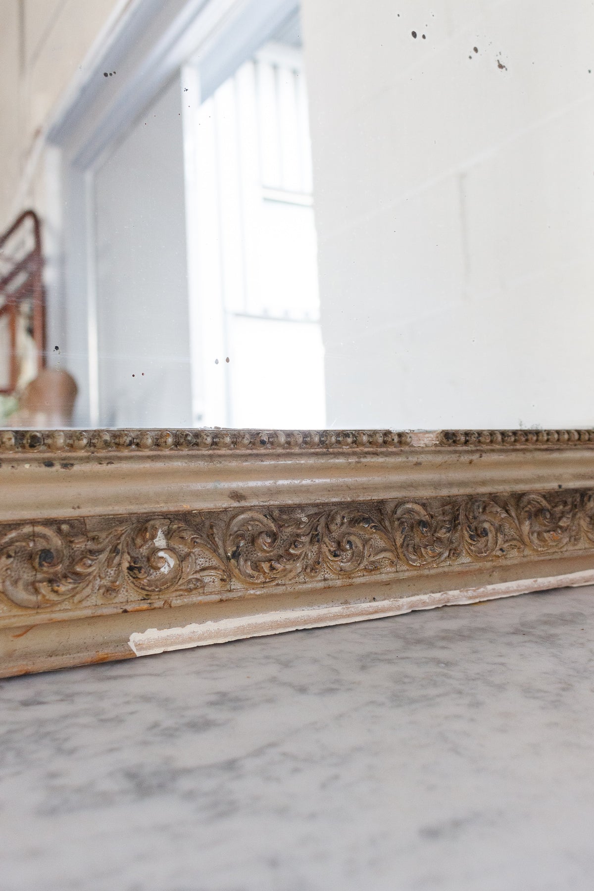 This particular turn of the century Louis Philippe mirror—with original gilt finish, delicate scrolling, and beading is the perfect heirloom to add to your home. This mirror shows signs of wear and use consistent with age including chipping to the frame.
