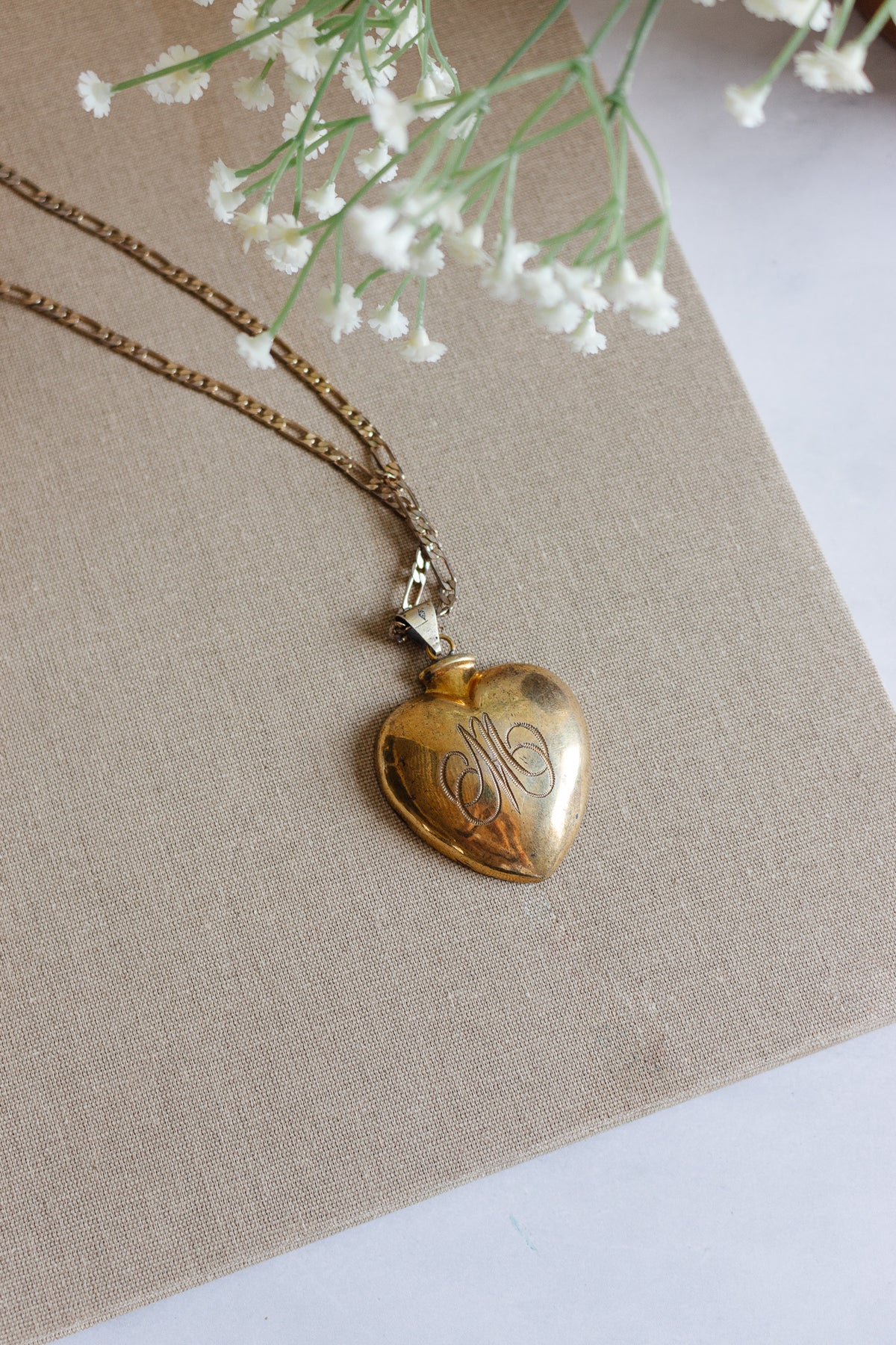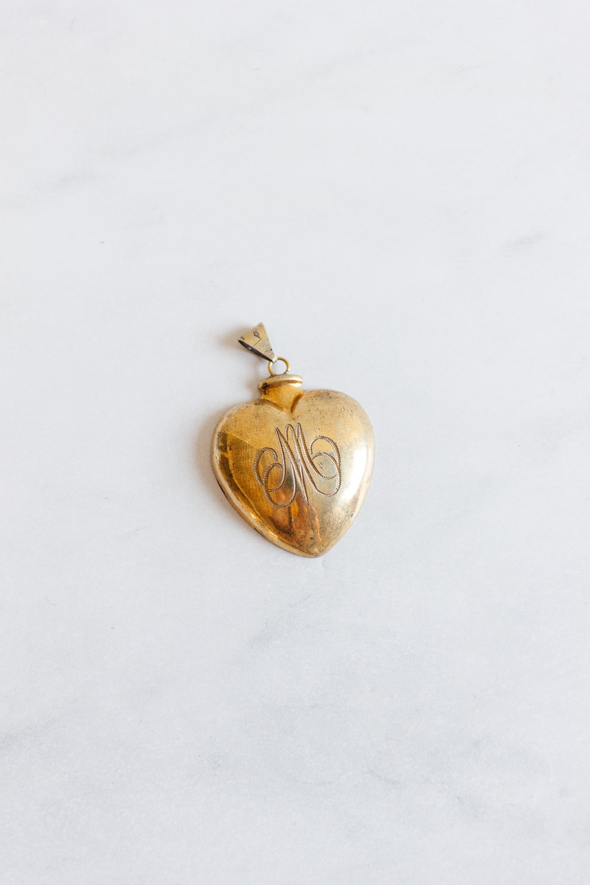 A rare piece with a rich story, this antique French ex-voto coeur de marie heart was meant as a beautiful material offering made to god in request of a grace or in thanks for a grace obtained. An ancient symbol of faith and devotion, the Latin words "ex-voto" translate to "according to the vow made." As is common with these Cœur de Marie hearts, it has the initials of the owner engraved on it (“AM”). It has been lovingly preserved, though the previous owner wore it daily (and often held it) as is shown by the way the gold vermeil plating has softly worn down.